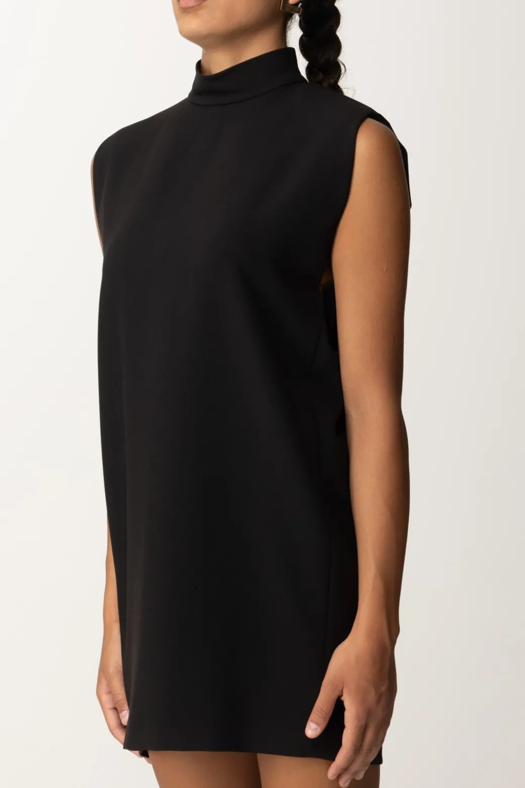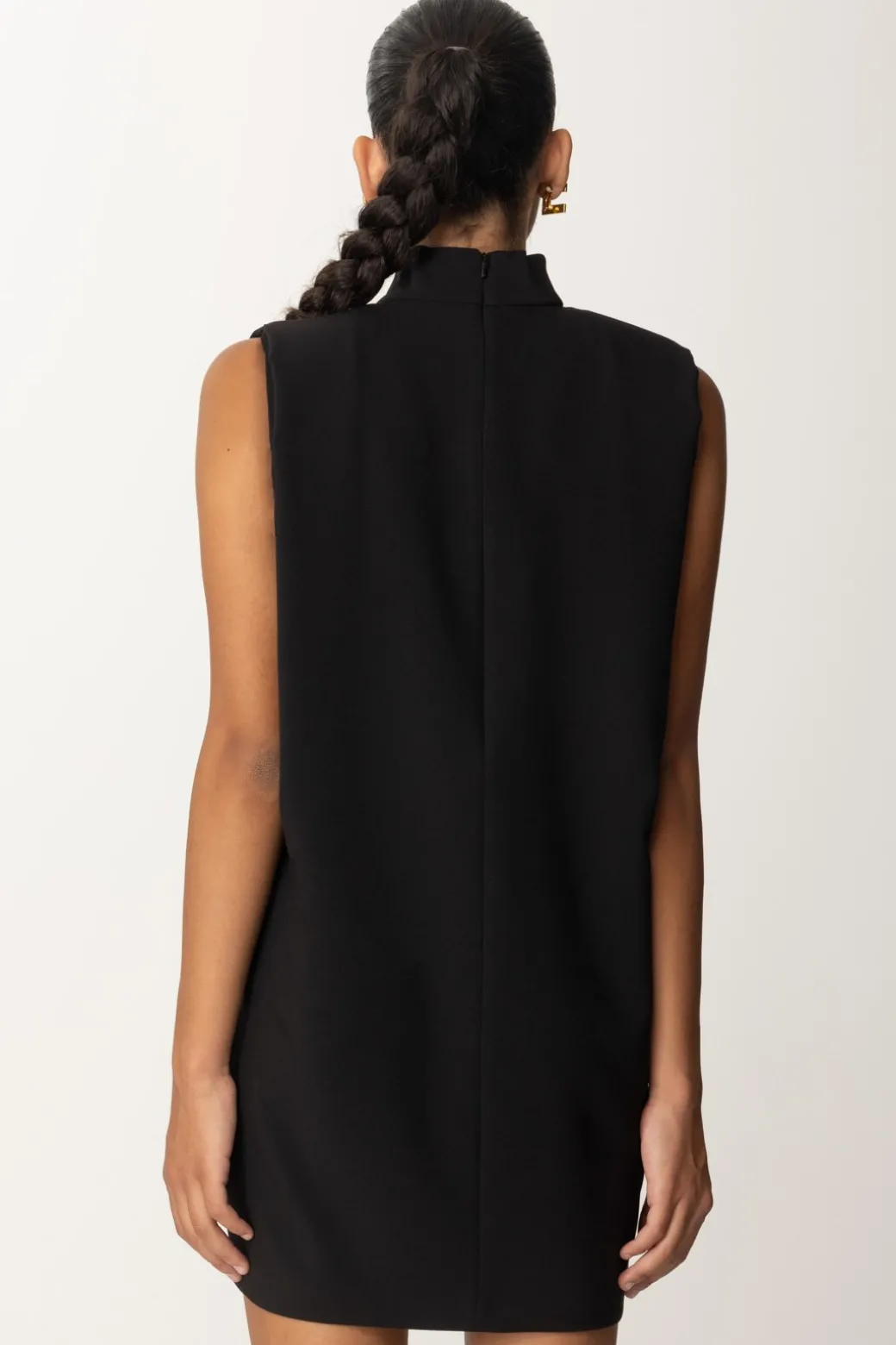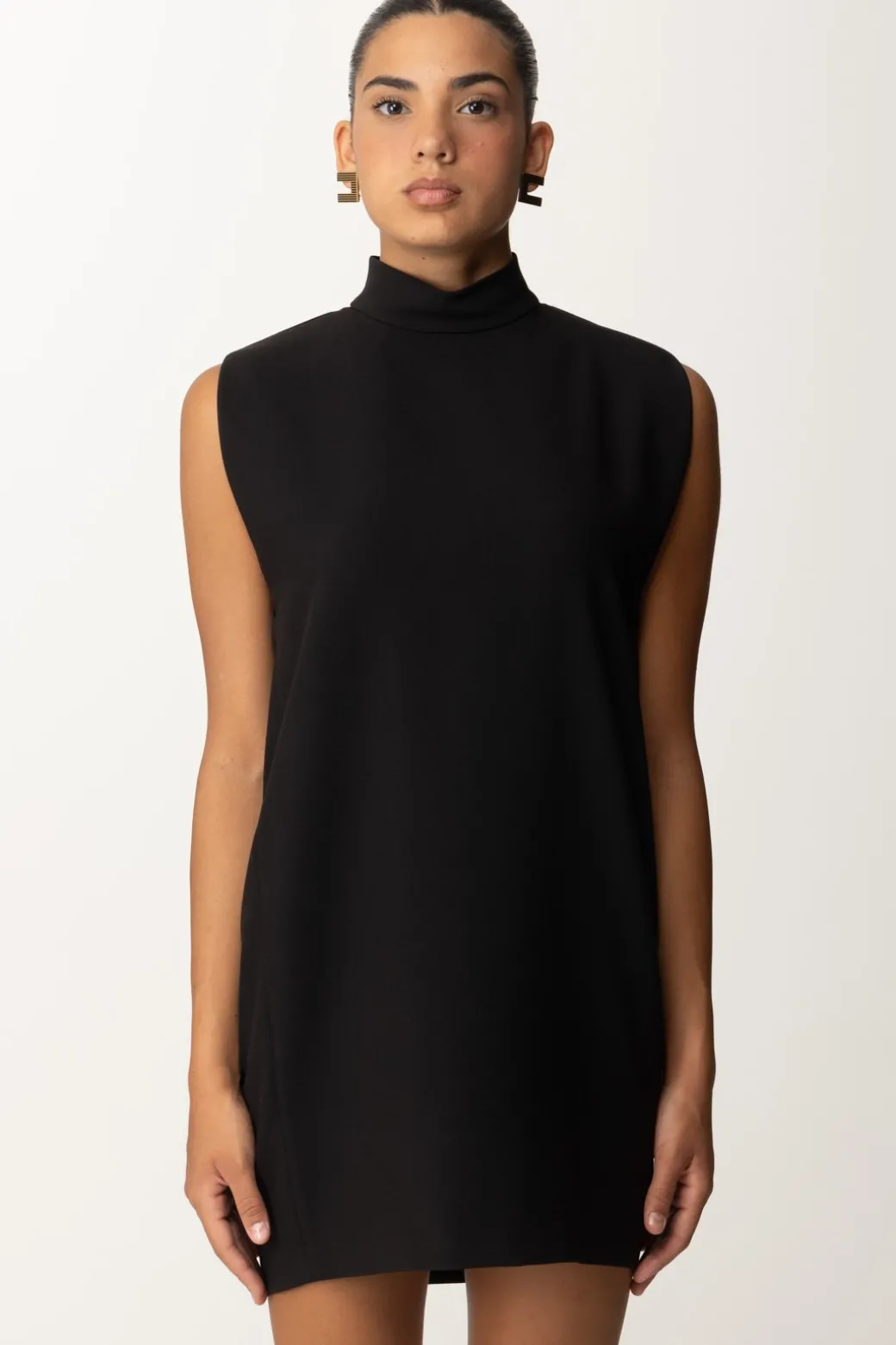 Abito Pinko smanicato a collo alto con linea dritta a sacchetto e fit comodo, ideale per chi ama uno stile minimal e pulito. Le vibes minimaliste rendono questo abito un must-have per un look senza tempo. Indossalo con stivali al ginocchio e un cappotto oversize per un look raffinato e moderno, oppure con sneakers e un bomber per un twist casual e urbano.