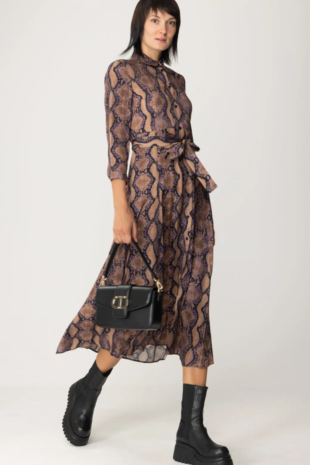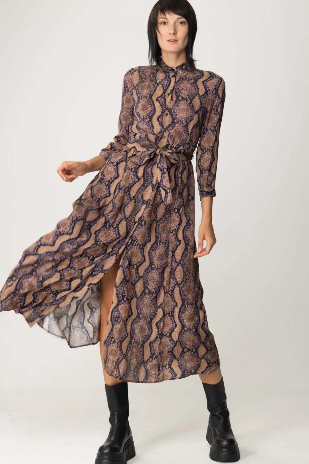 Abito Chemisier Pinko in chiave grintosa e audace. Ha un taglio lungo e ampio, con una stampa interamente animalier che lo caratterizza. A definire la figura infine ci pensa la cintura in vita. Come indossarlo? Segui il mood: stivali, tracolla e gioielli estrosi.