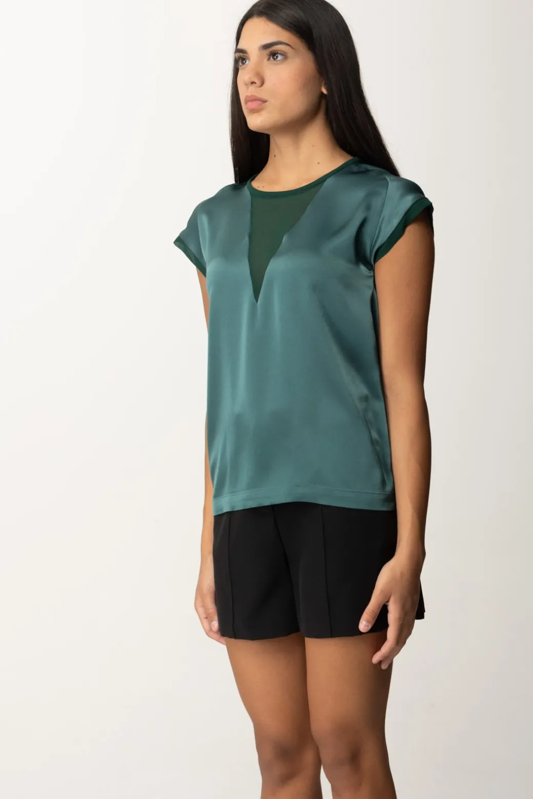 Gusto moderno e versatile e al tempo stesso classy per questa blusa Pinko in satin, completata da un inserto in georgette che simula una scollatura a V con la sua semi-trasparenza. Fit ampio e maniche corte ad aletta, un perfetto top da abbinare ai tuoi look h24.