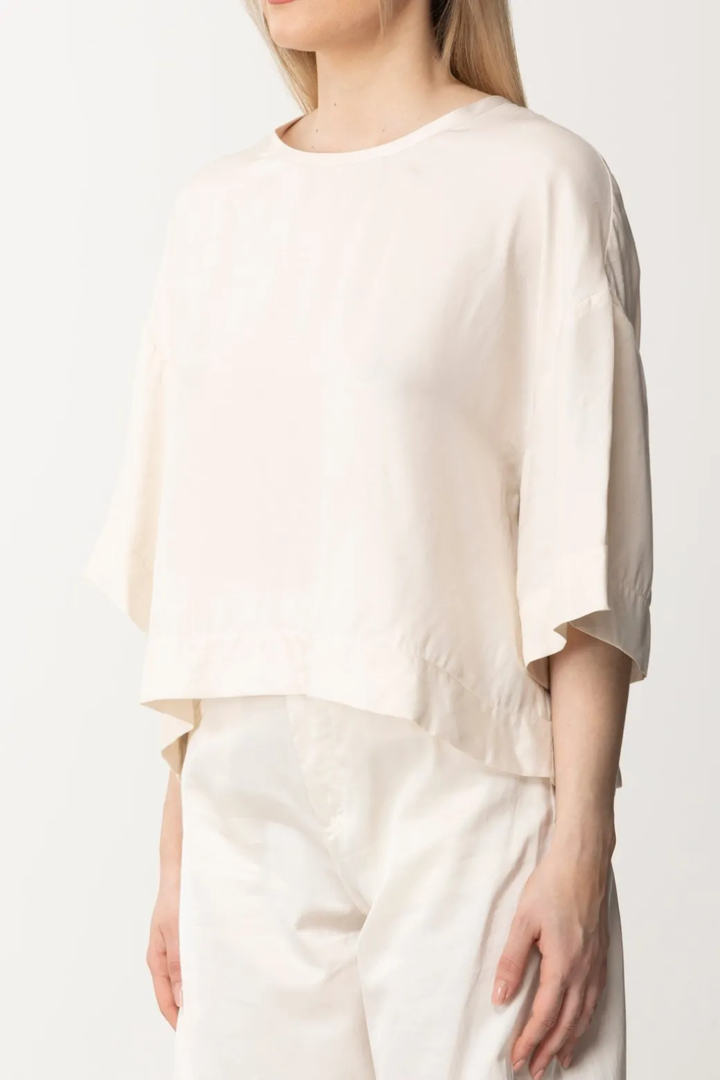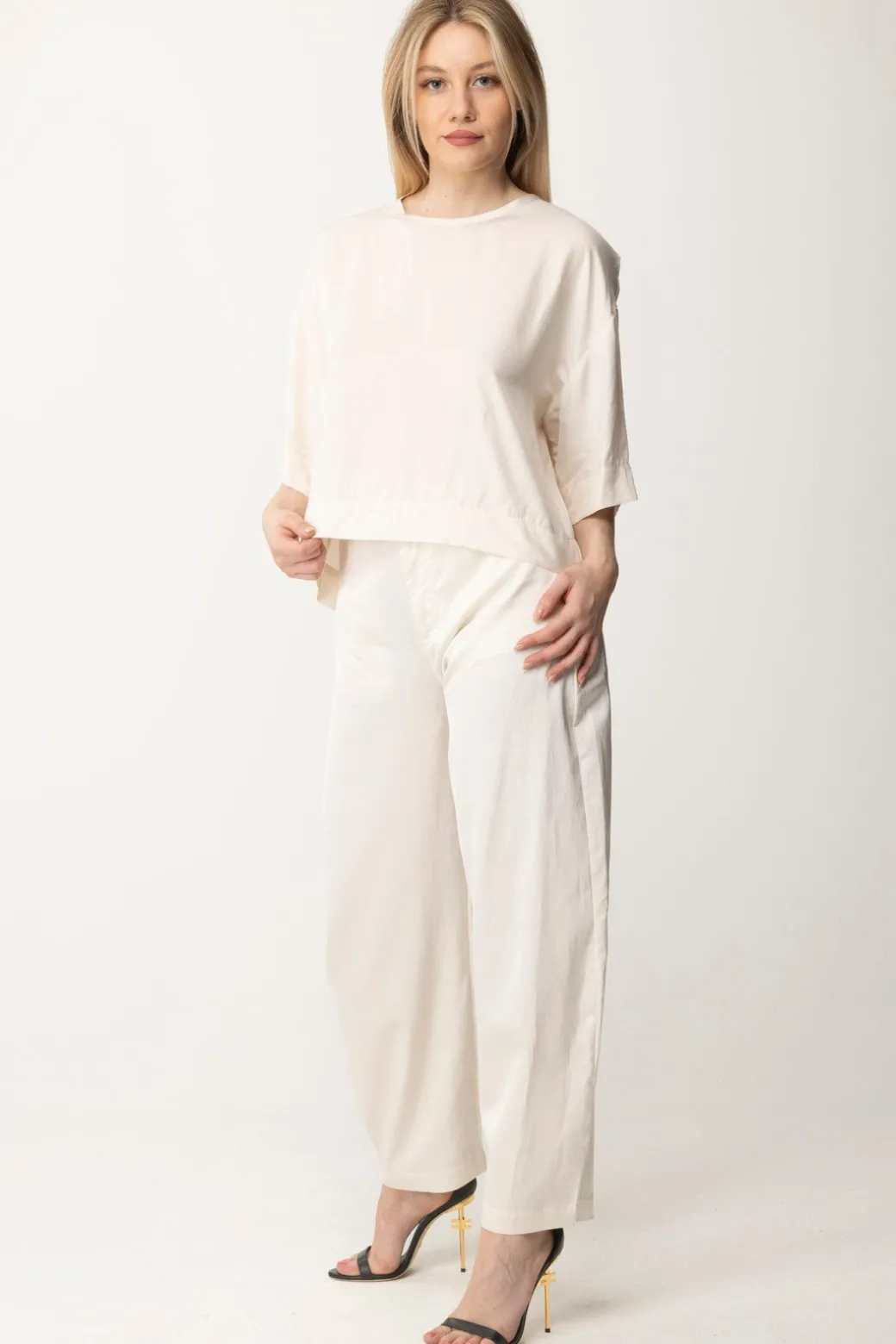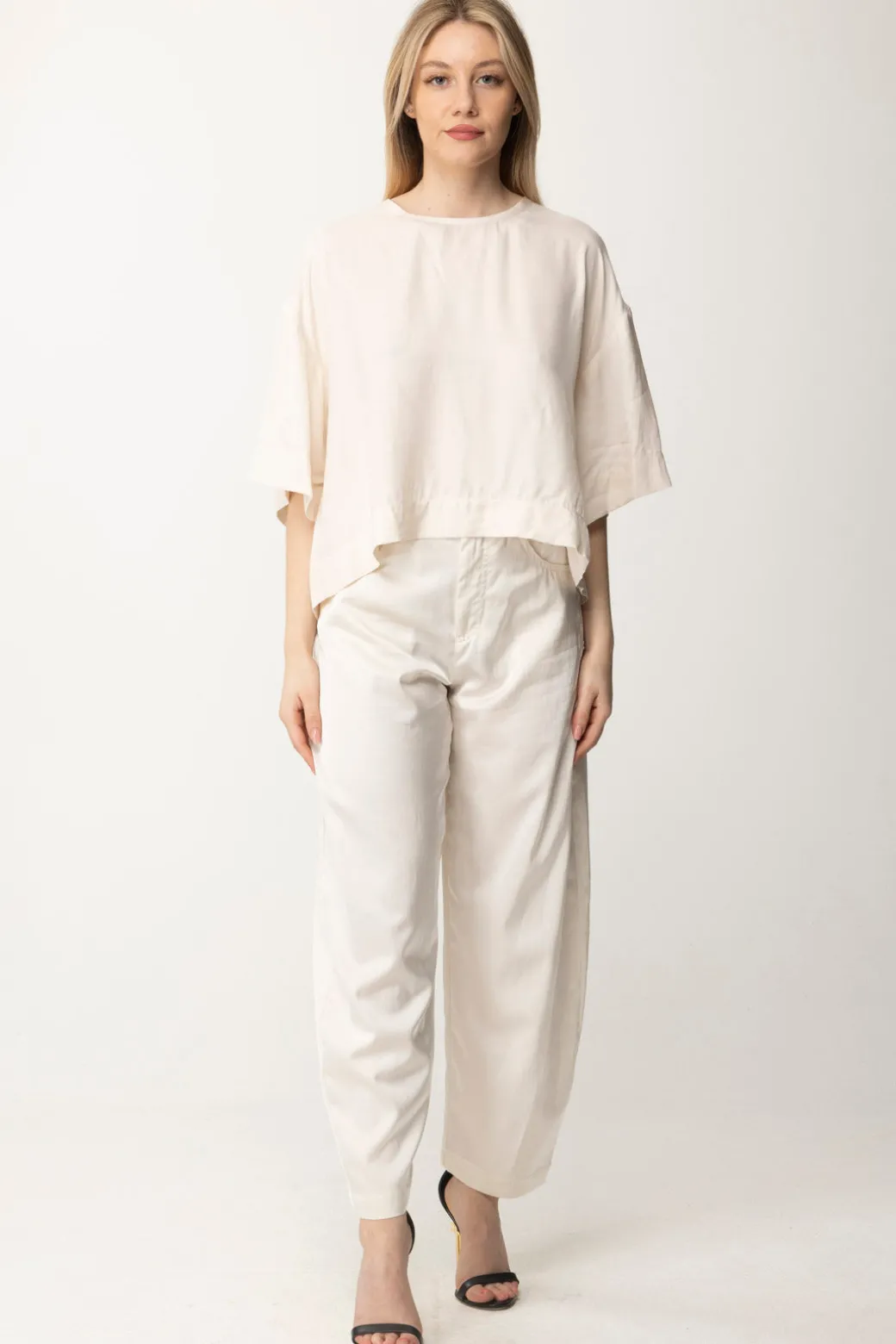 Taglio a mantellina e abbottonatura sul retro, dietro la semplicità di questa blusa Pinko si cela tutta la sua versatilità e il mondo delle opportunità di abbinamento! Crop e ampia, si adatta alle silhouette più morbide e crea volume a quelle meno morbide: insomma, dona a tutte, ed il twill di viscosa è un tessuto bellissimo e chic. Non c’è una ragione per non volerla!