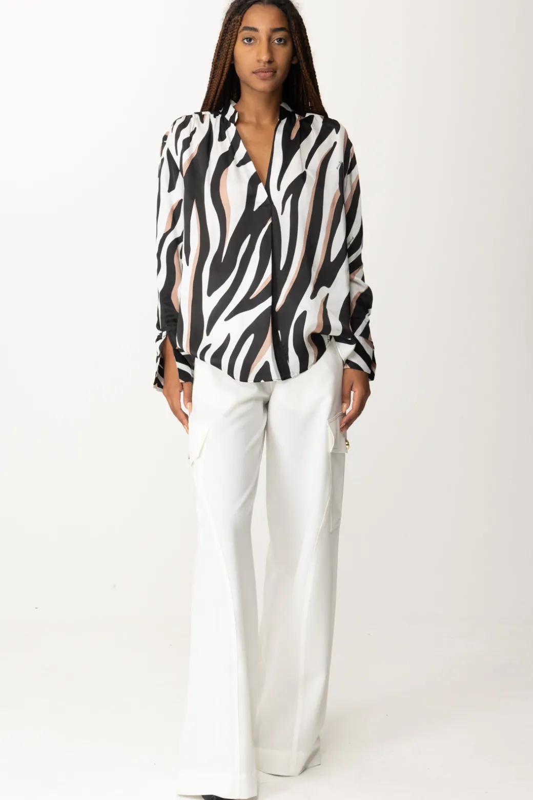 Qualcosa di diverso, che si faccia notare ma non sia neanche troppo appariscente? Ecco per te questa blusa Pinko con stampa zebrata, caratterizzata da scollo a v e maniche lunghe con polsini svasati: dai jeans ai pantaloni più classici, basterà un capo così per aggiungere valore ai tuoi outfit.