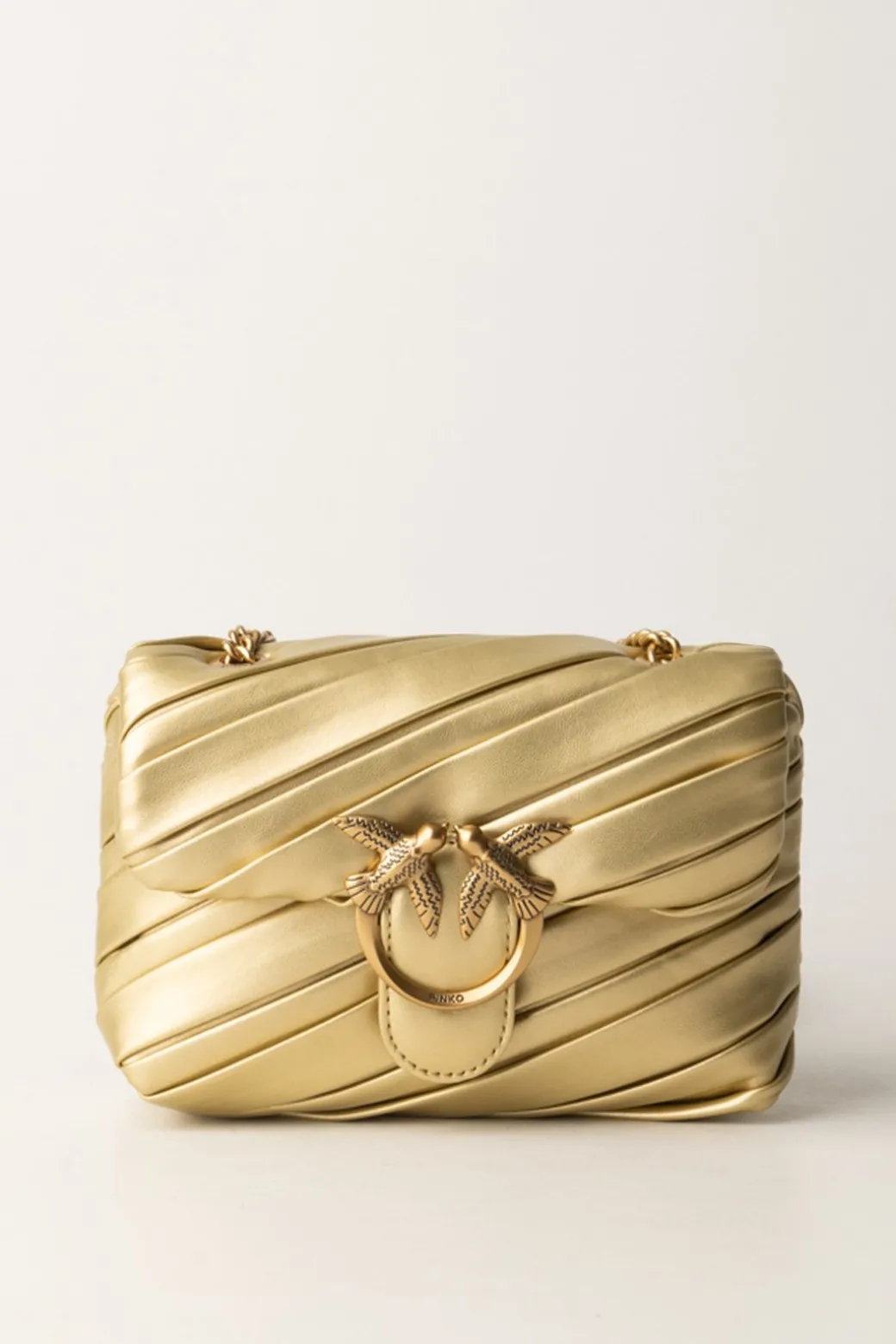 Illumina un outfit color block e rendi luxury i tuoi outfit da sera con una borsa a tracolla Pinko Baby love puff in oro, completata da tracolla a catena con spallaccio in pelle tono su tono e fibbia con logo Love birds e lettering in metallo. Lo stile del brand in un accessorio piccolo ma d’impatto, adatto anche ad outfit formali e da evento importante.