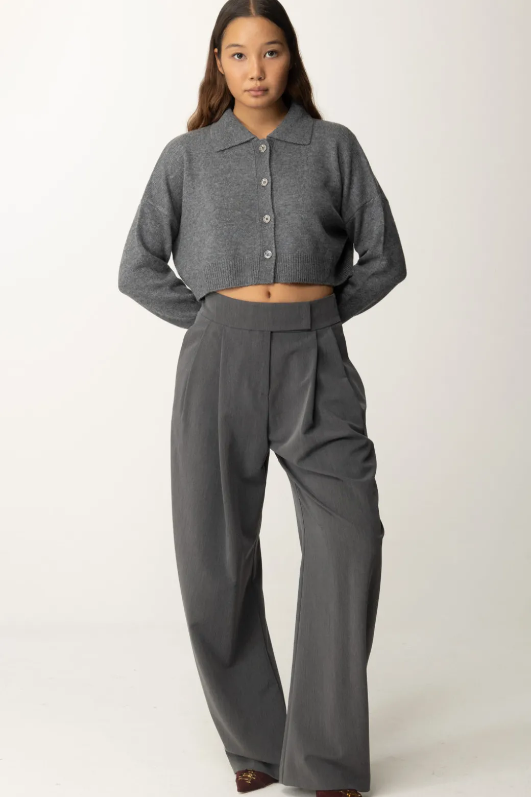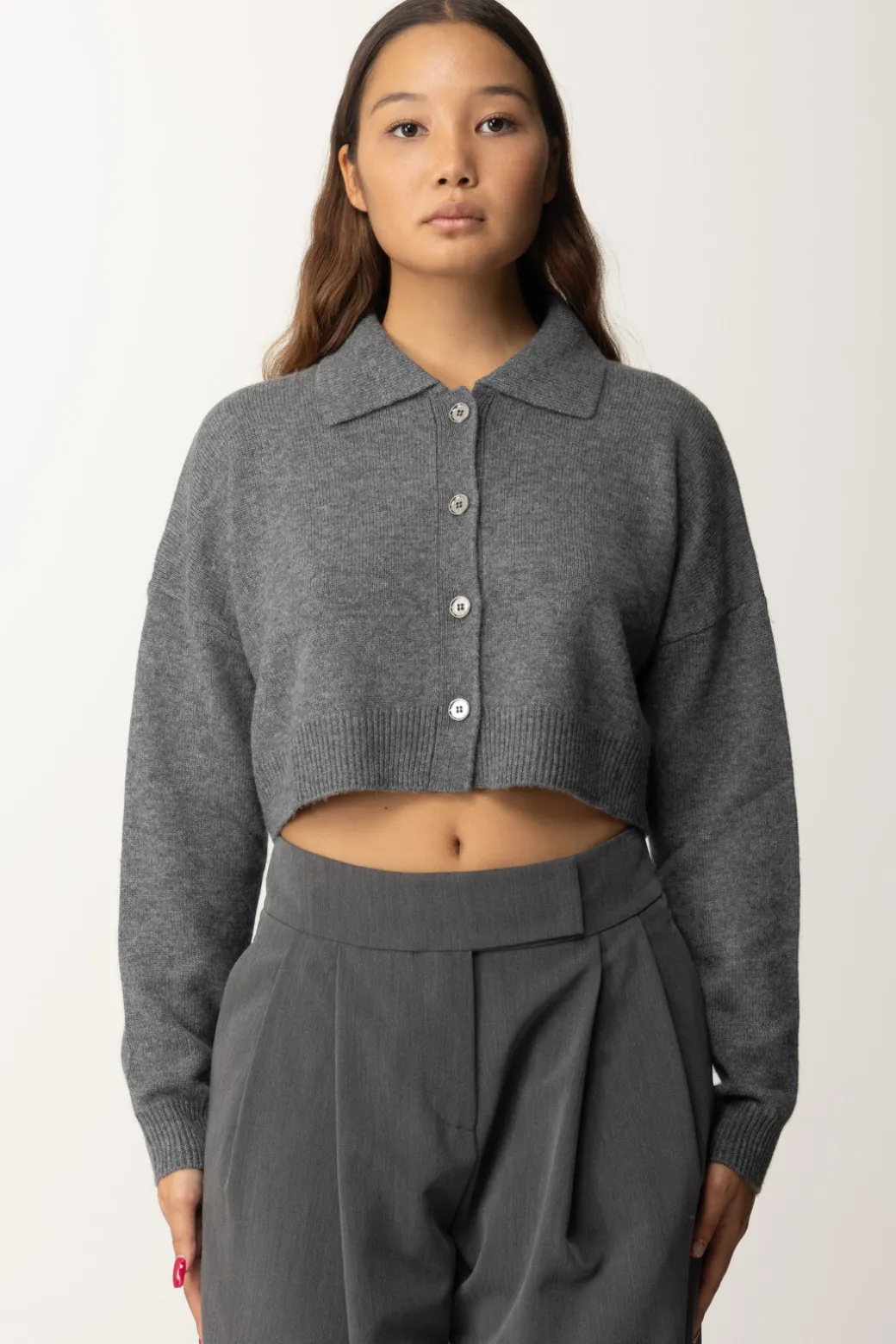 Cardigan Pinko in set: presenta un colletto a punta, chiusura a bottoni e bordi a costine per un tocco ancora più cozy. Completato da una canotta minimal con orlo in pizzo. Ideale per un look raffinato e versatile.