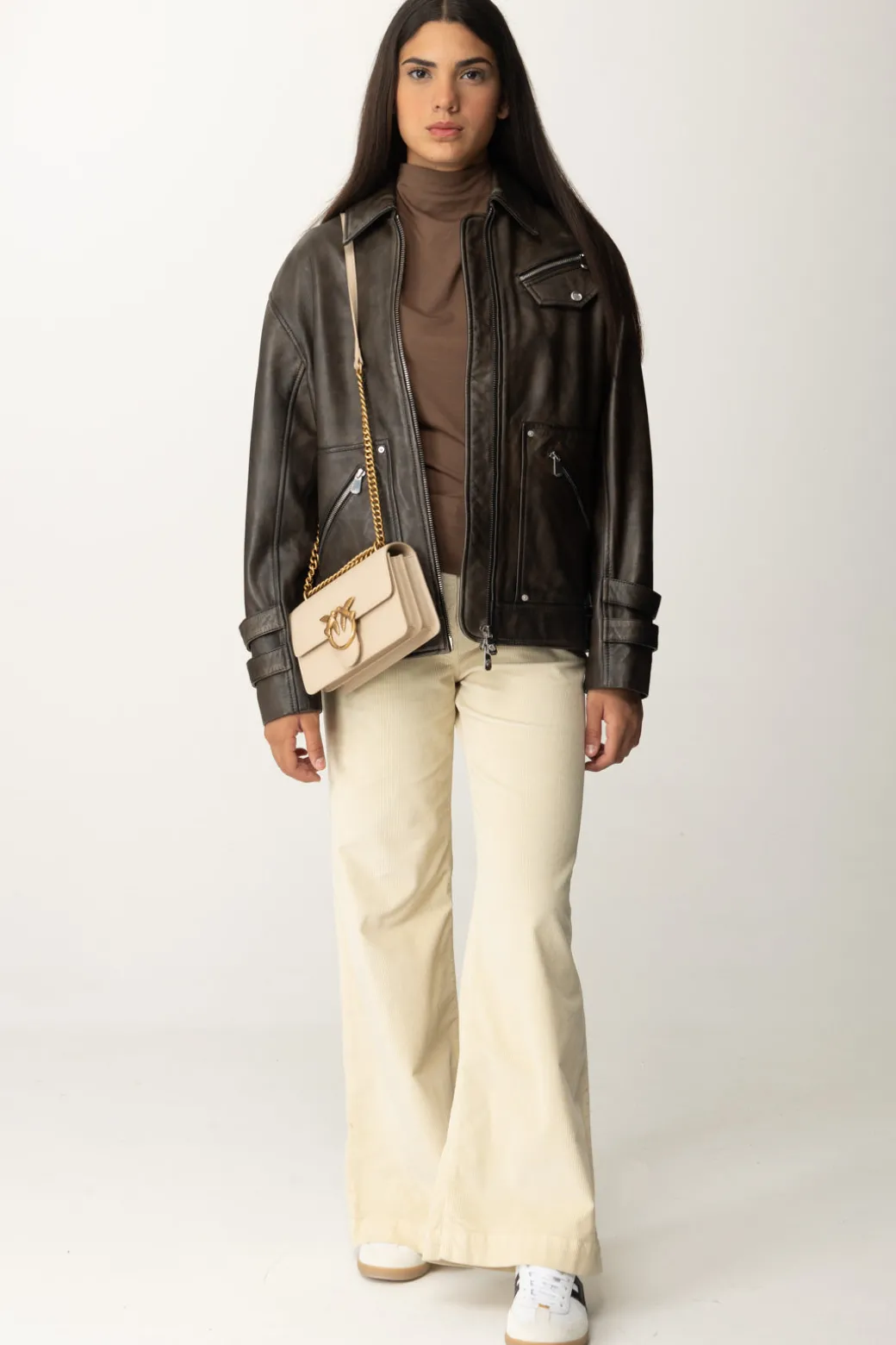 Questo giubbino Pinko in pelle dal taglio over ha un design vintage che combina perfettamente il fascino dello stile retrò con un tocco moderno. I dettagli con zip sul davanti e sopra le tasche, insieme alle doppie cinghie sulle maniche, aggiungono un carattere deciso e distintivo a questo capo unico.
