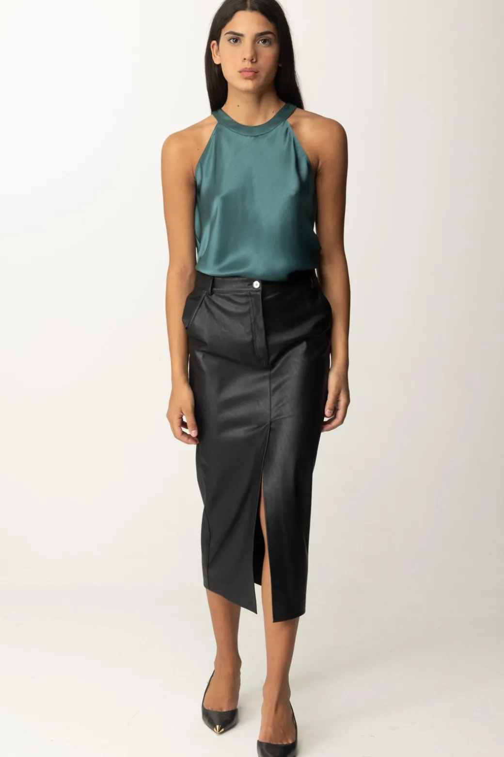 Questa gonna Pinko midi in similpelle con spacco frontale e vita alta è perfetta per aggiungere un tocco di grinta al tuo look. Indossala con una camicia bianca e tacchi alti per un outfit sofisticato, oppure con un maglione oversize e stivaletti per un fascino casual-chic.