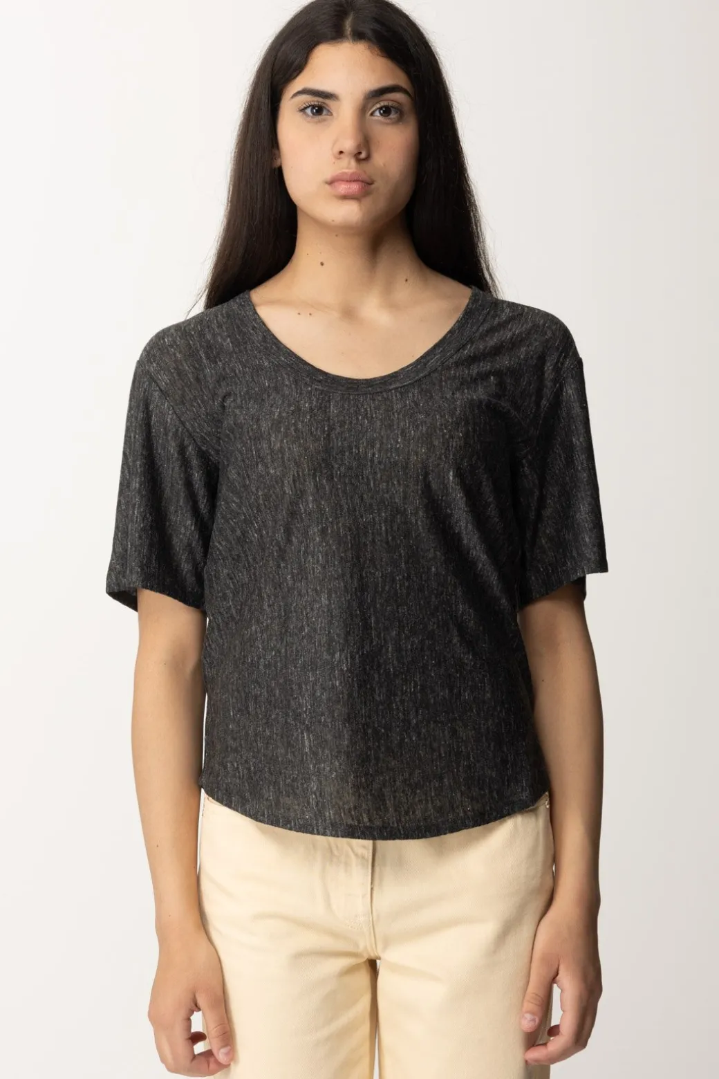 T-shirt Pinko realizzata in lino fiammato e caratterizzata da una texture irregolare che la rende ancora più interessante, perfetta per tantissimi abbinamenti. Amerai indossarla per i tuoi outfit più spensierati, a cui il suo fit oversize aggiungerà leggerezza, ma anche combinarla ai tuoi bottom più ordinari per le tue giornate in ufficio e piene di impegni. Ampia scollatura rotonda e ricamo logo Love Birds sul retro.