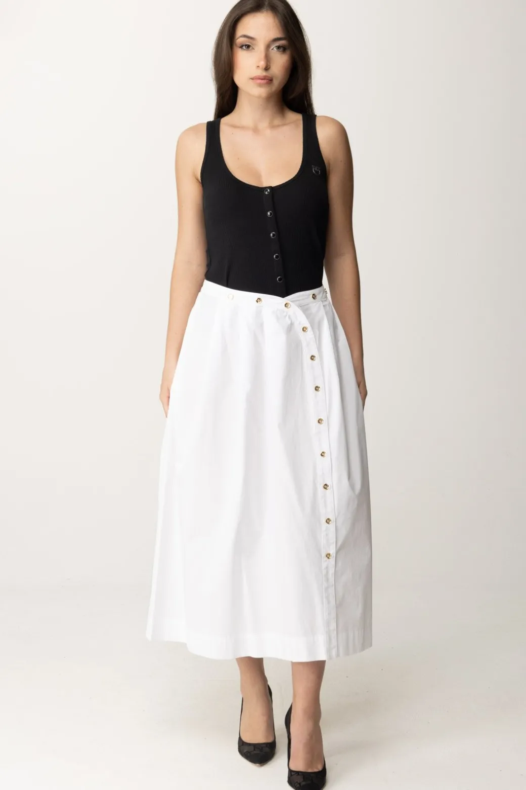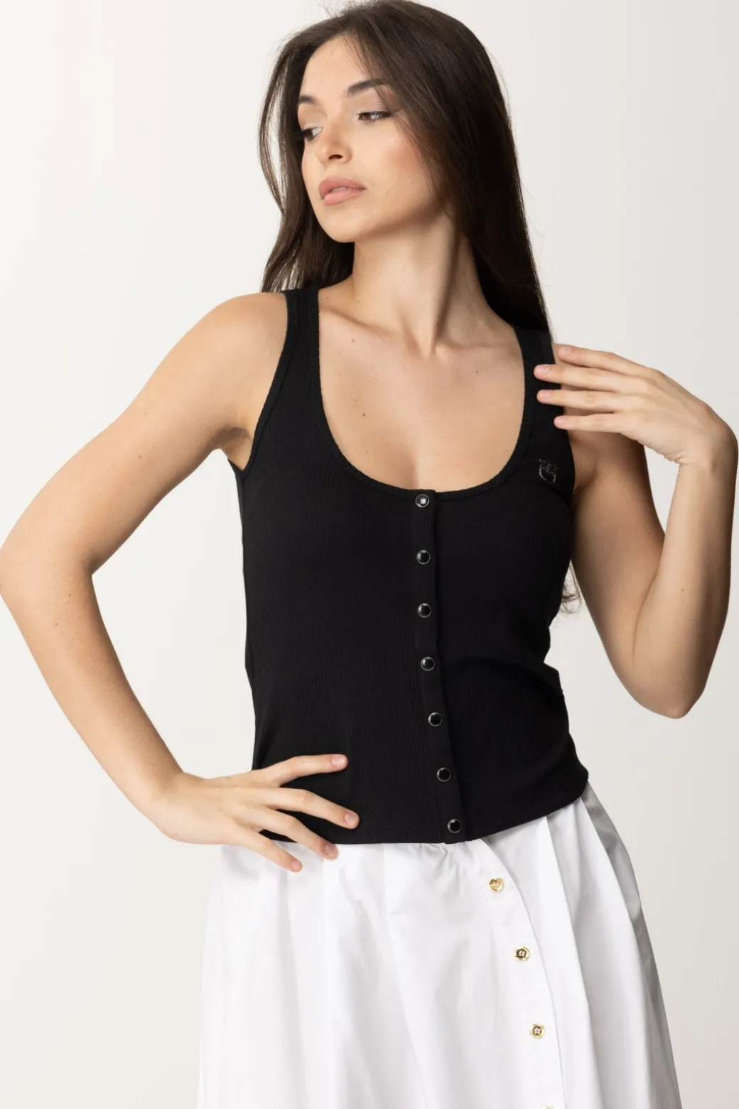I top sono i must-have dell’estate, e questo top a canotta Pinko sarà sicuramente parte del tuo repertorio di capi basic preferiti. Semplice e fresca, impreziosita da bottoni frontali e logo Love Birds ricamato.