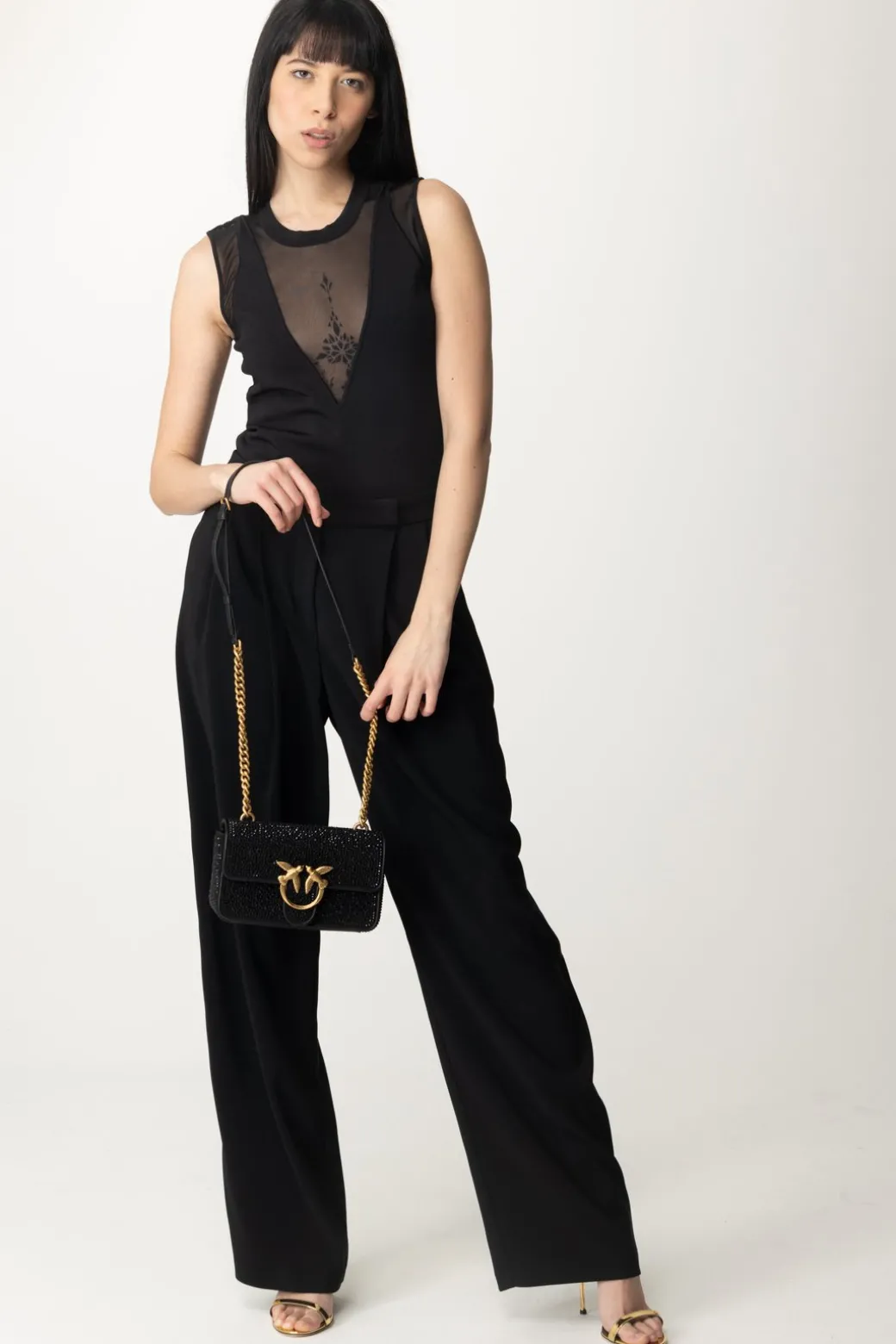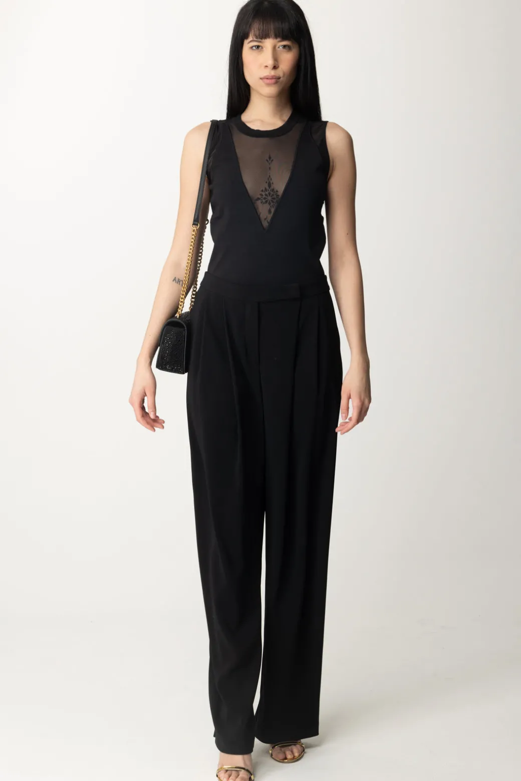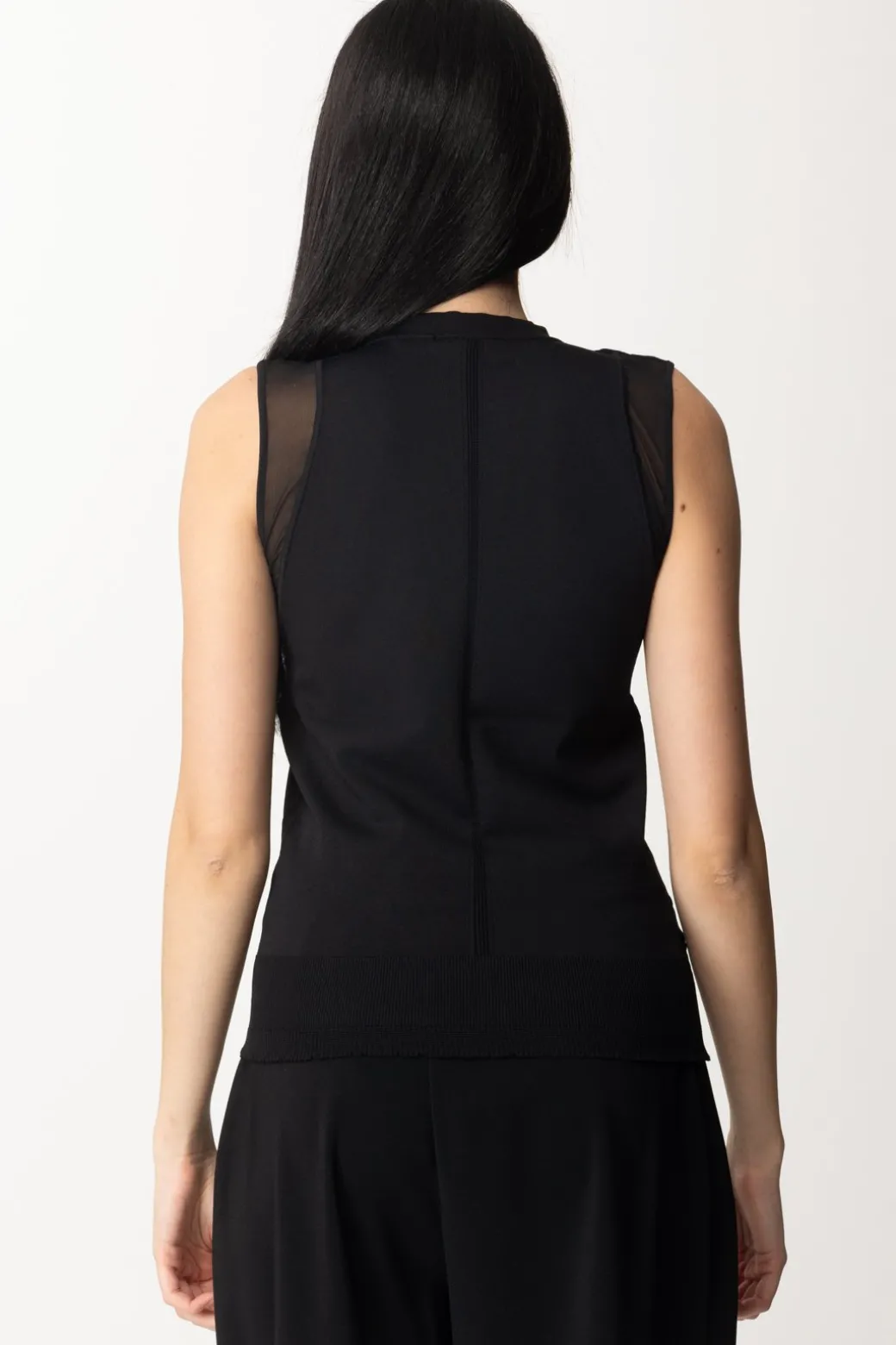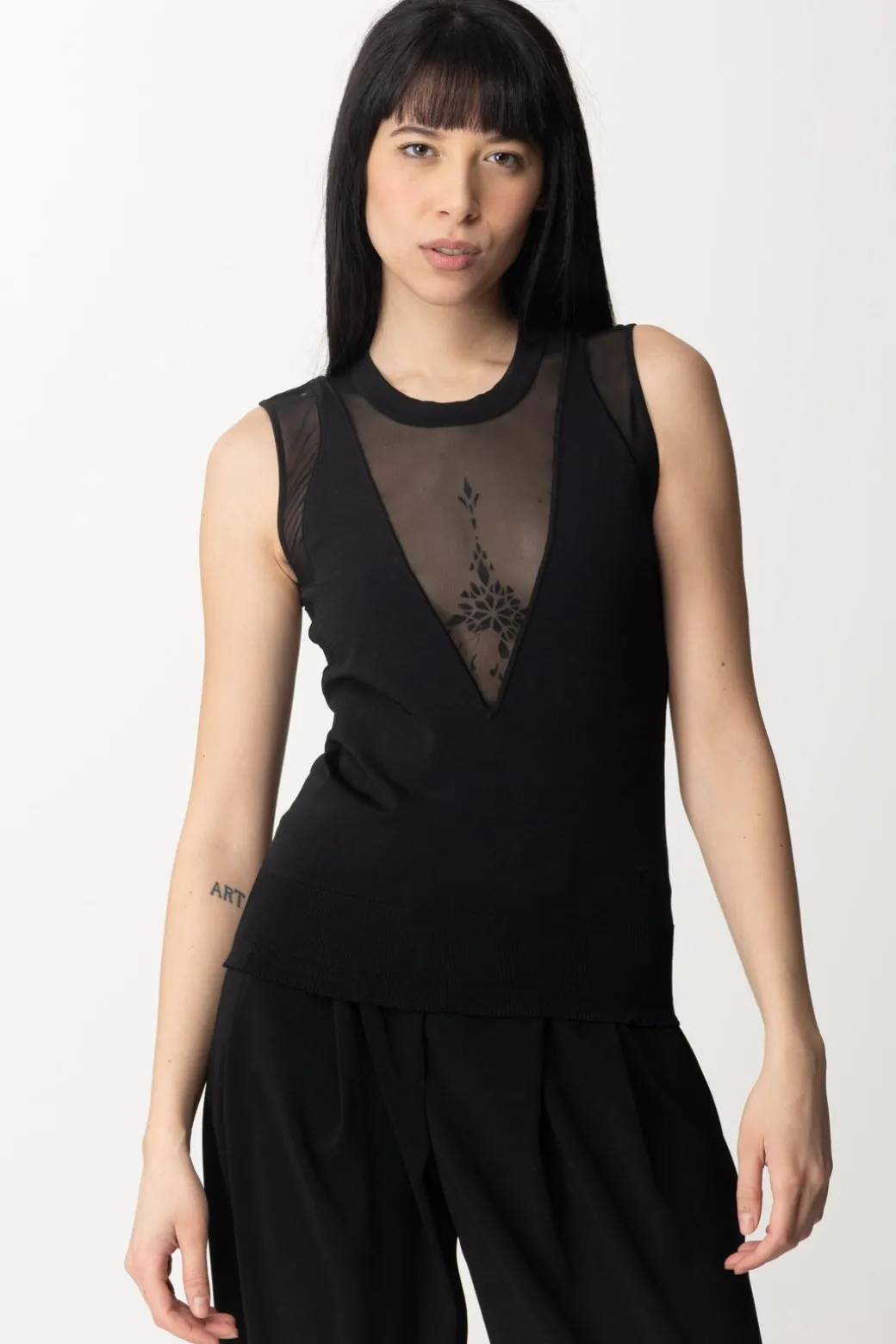 Sexy al punto giusto: questo top Pinko con il suo mix di maglia di viscosa e tulle è un vero e proprio disegno sulla tua silhouette, che gioca con il vedo-non vedo della scollatura a V profondissima! Bello da indossare in total black per un look ancora più affascinante, bella con bottom casual o colorati a cui aggiungere una nota di carattere.