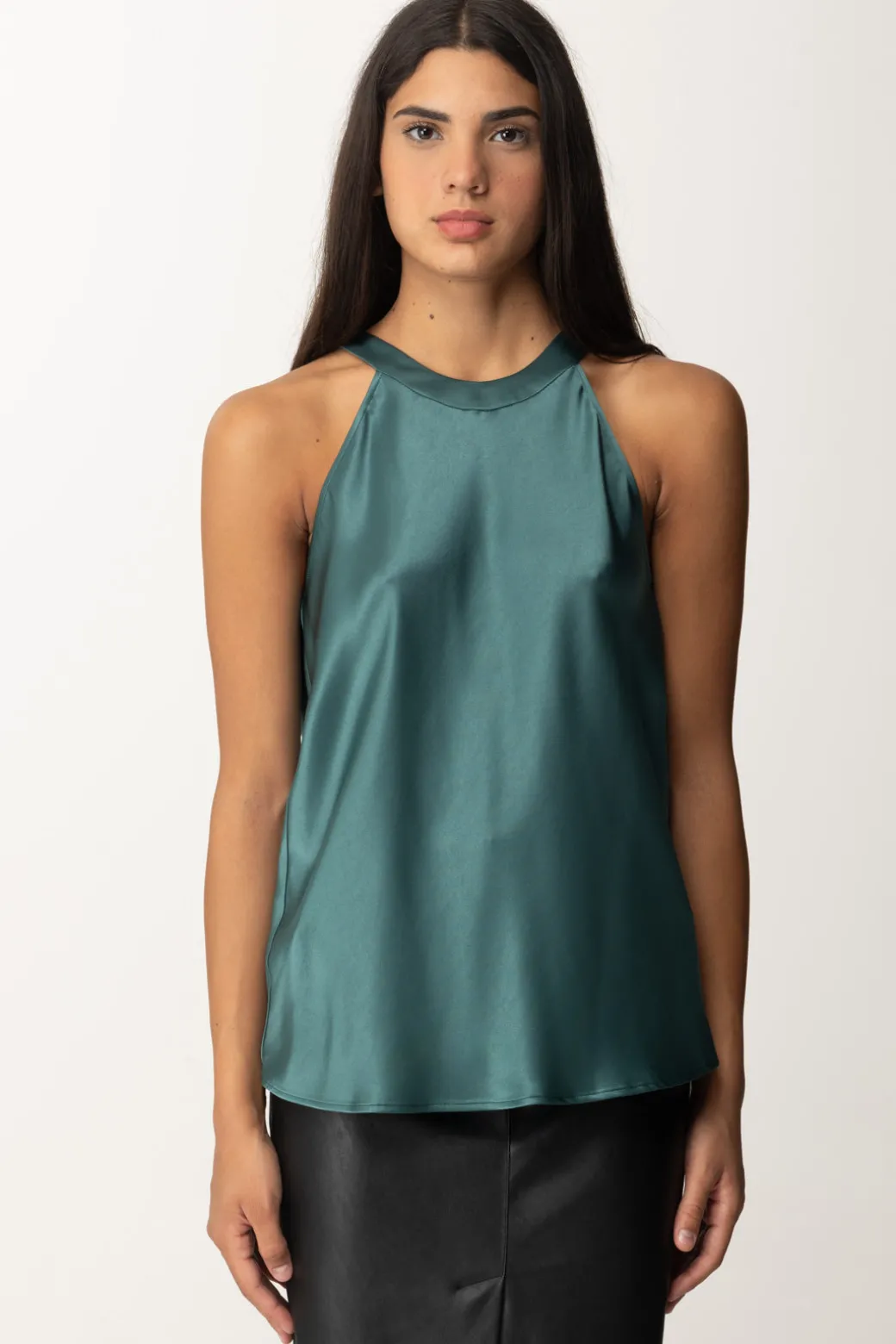Top Pinko estremamente chic, realizzato in luminoso satin che potrebbe già esser sufficiente a darle l’allure elegante che lo caratteriza. Smanicato, lo scollo all’americana si conclude con un fiocco sul retro, dove un inserto in georgette crea un ampio scollo a goccia. Ideale per look anche da cerimonia, combinato ad un bottom che gli sia pari in femminilità.