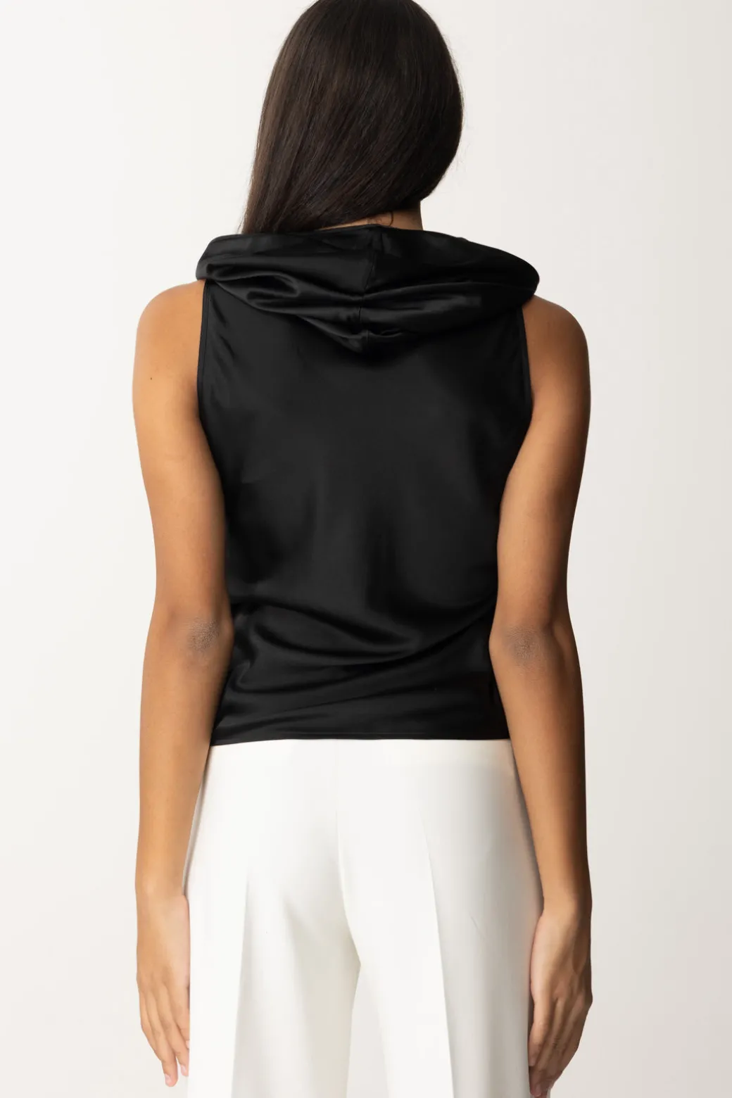 Top Pinko realizzato in satin con colletto morbido arricchito da drappeggi, perfetto per aggiungere un tocco di lusso e classe a qualsiasi outfit. Da abbinare a pantaloni a vita alta per un look serale elegante o a jeans skinny per un contrasto casual-chic.