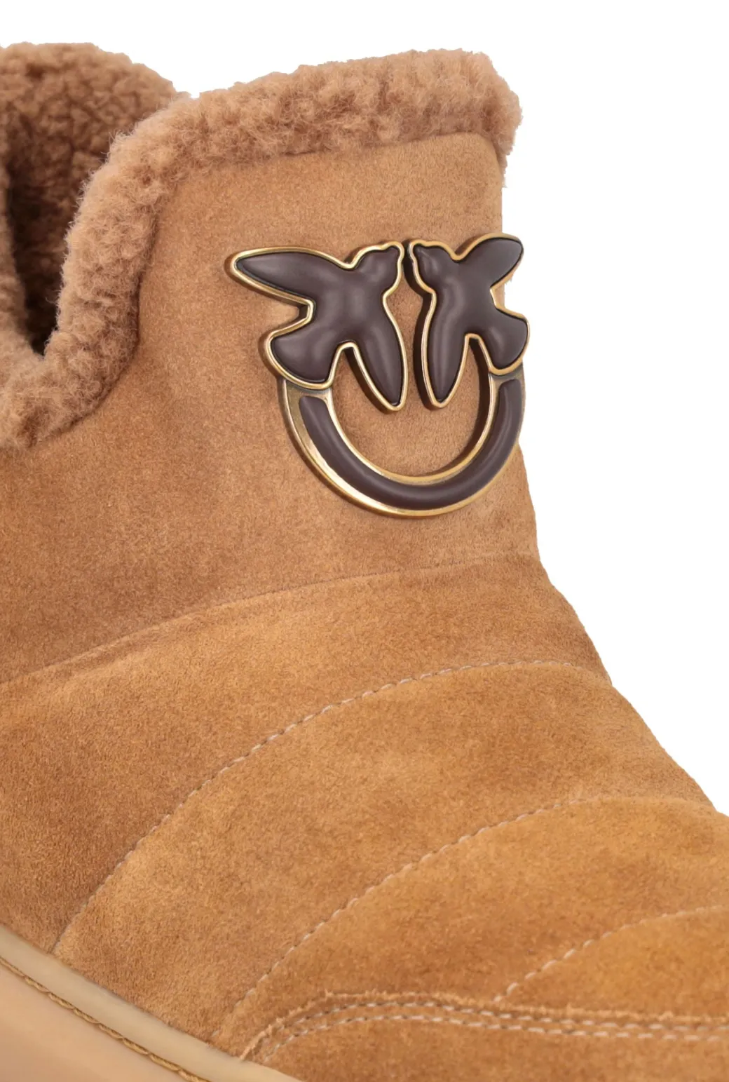 Se il cozy si potesse esprimere con delle calzature, questi stivaletti Pinko entrerebbero perfettametne nella ompetizione! con pelliccetta e rivestiti in pelle scamosciata, il platform in gomma è arricchito sul retro da un pattern a logo monogram, ripetuto sul fronte in forma di placchetta Love birds. Per le tue giornate più fredde, per i tuoi outfit più originali!