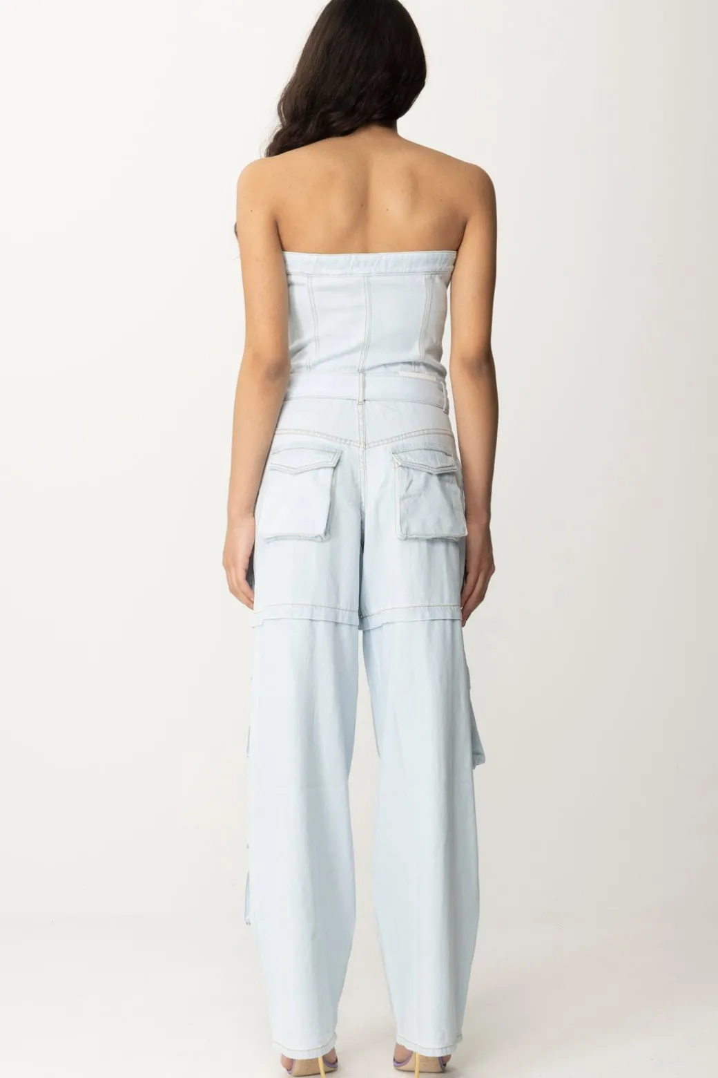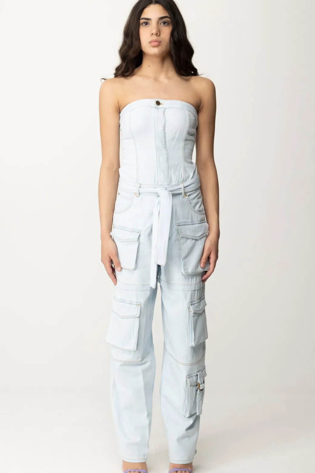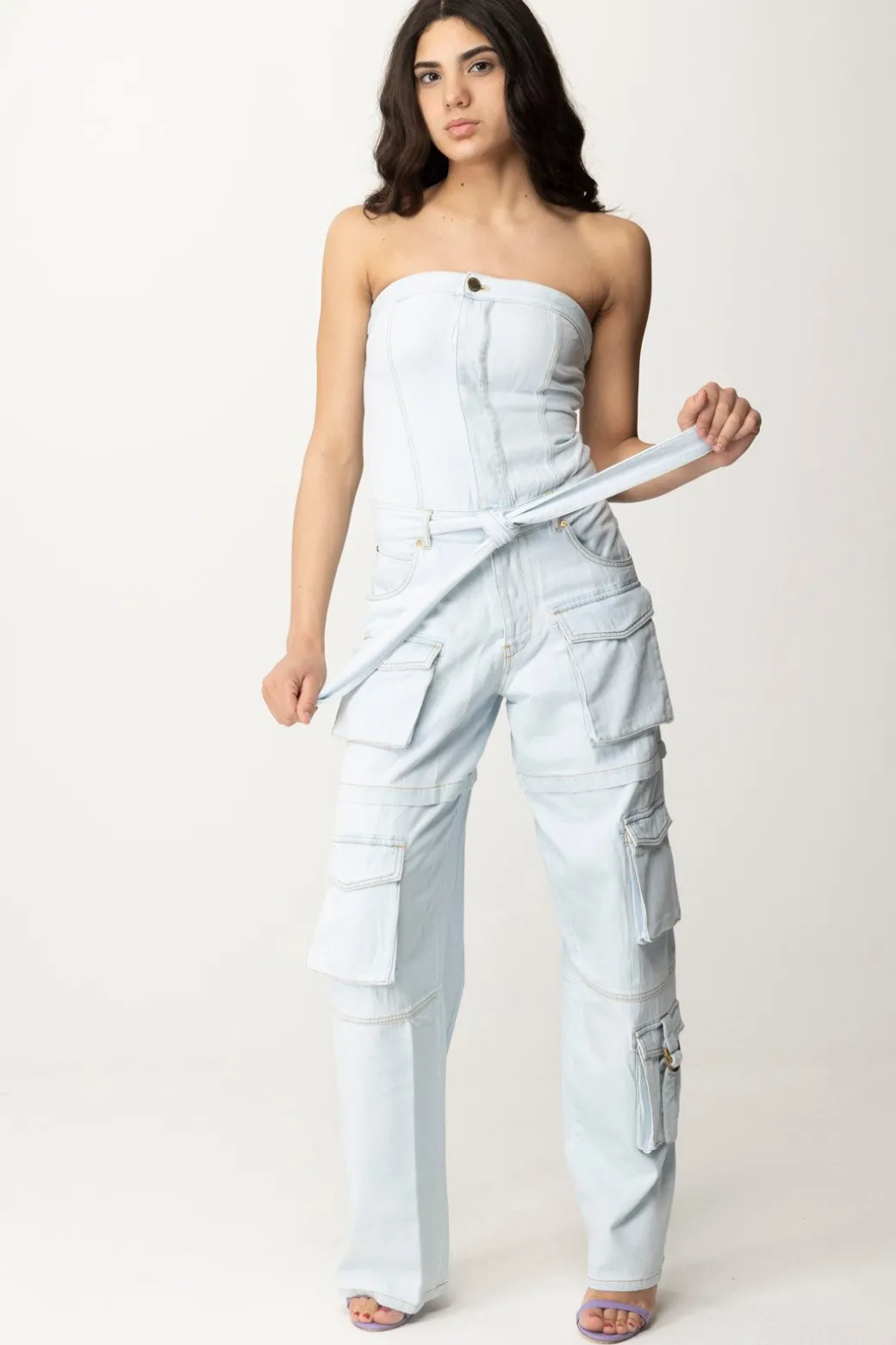 Una tuta Pinko in total denim dal lavaggio chiaro che richiama alla perfezione la freschezza della stagione! Deisgn senza spalle, completato da una cintura da annodare in vita e tasche cargo sui pantaloni, per un look urbano e alla moda con un twist di praticità.