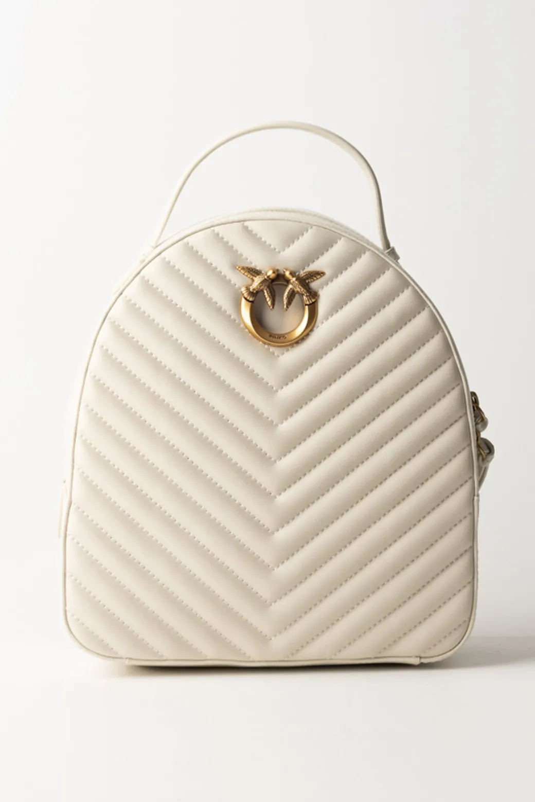 Zainetto Pinko pronto per essere il tuo compagno fidato di stile negli impegni quotidiani o nelle occasioni off-duty. Realizzato in pelle liscia con effetto trapuntato motivo chevron, è illuminato dall’iconica fibbia Love Birds sul davanti e corredato sia da manico che da bretelle per portarlo come vuoi tu.
