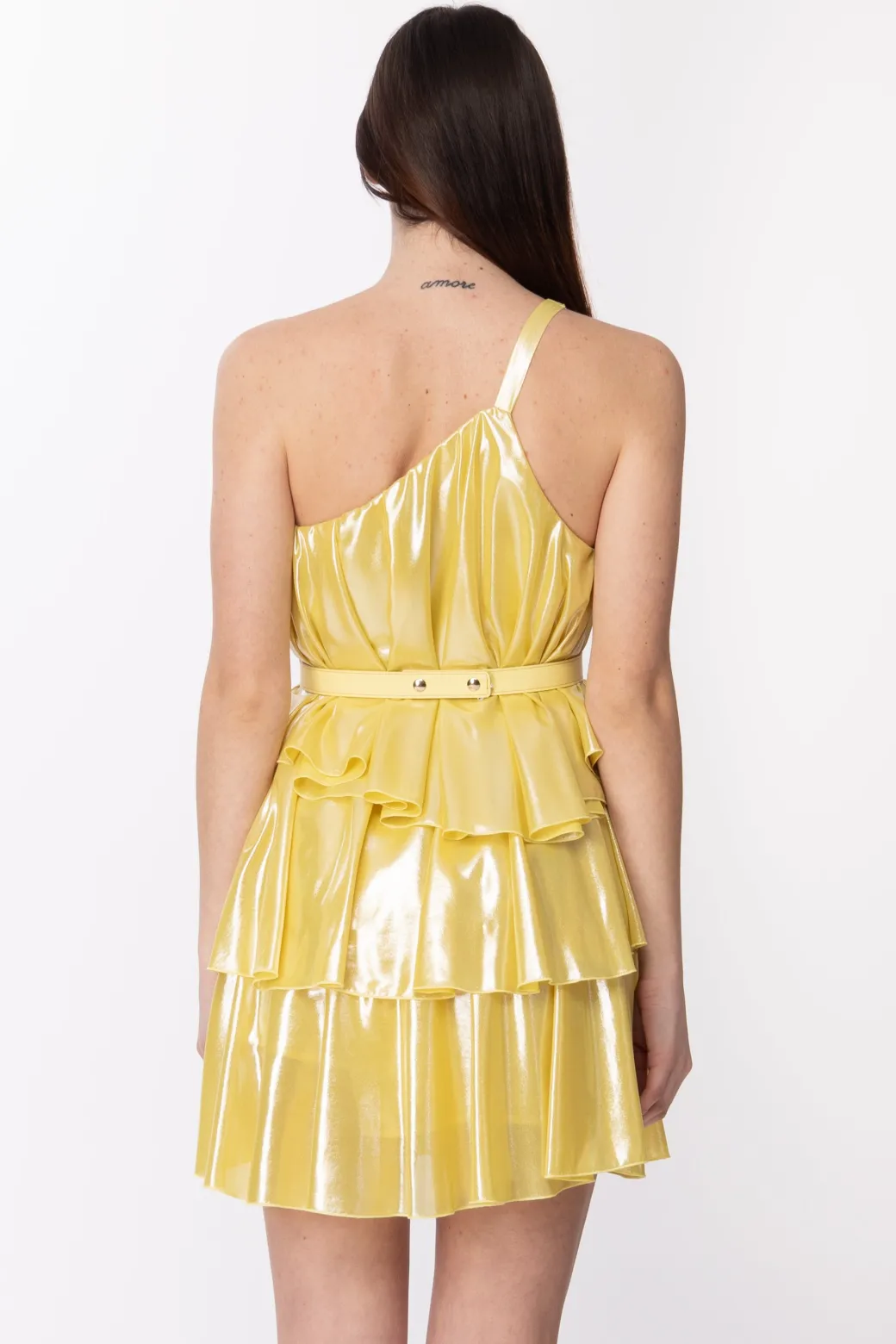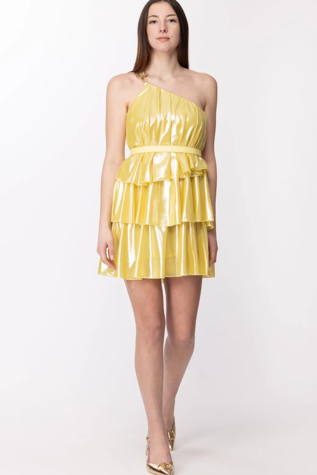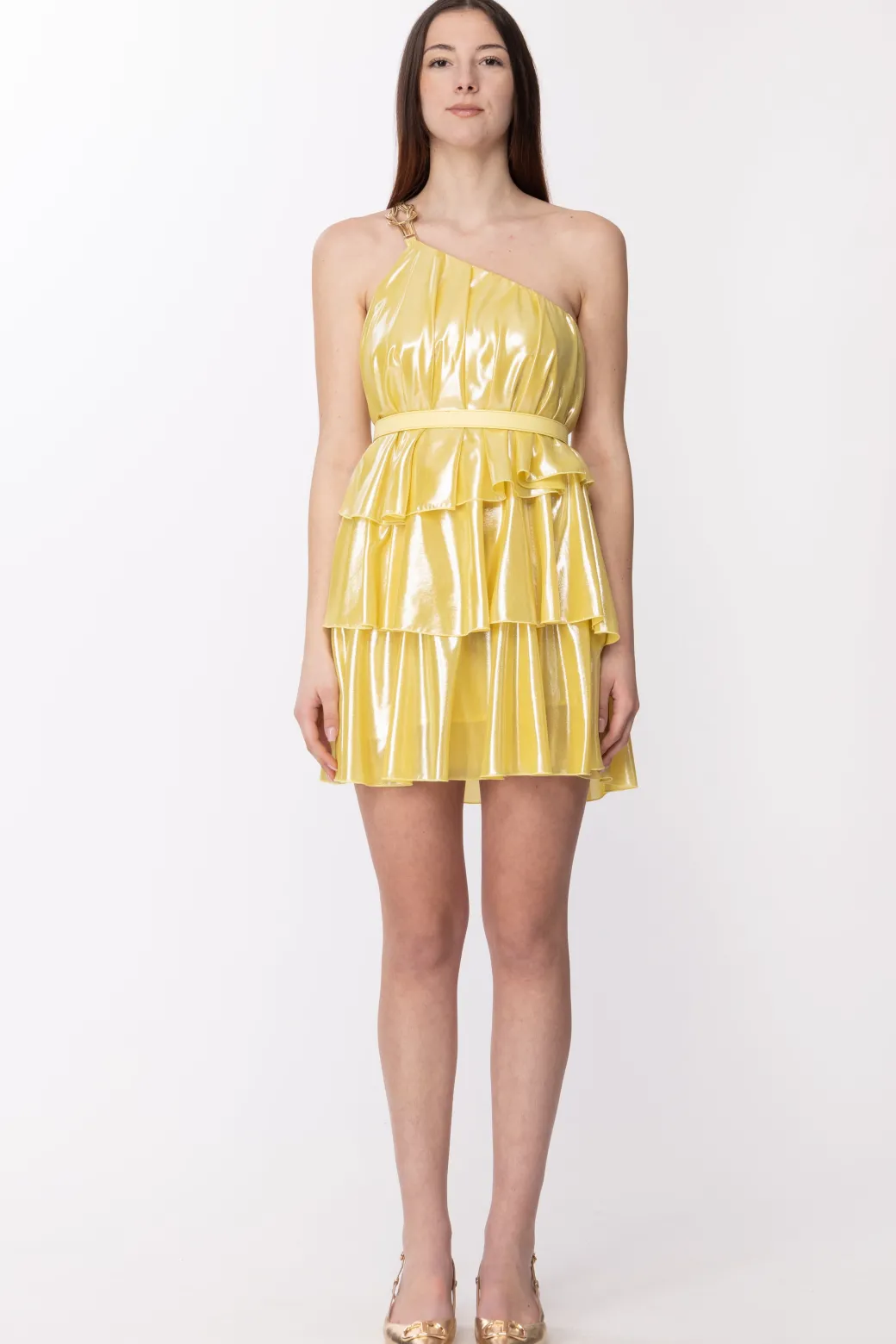 Luminosità che cattura ogni guardo: un mini dress Simona Corsellini pronto a farsi notare per ogni suo dettaglio! Il suo design monospalla viene impreziosito da una bretella con applicazione gold che sostiene il top caratterizzato da pieghe e cintura in tono che evidenzia il punto vita. La gonna viene arricchita da balze e il tutto si racchiude con un tessuto laminato dal finish glamour!