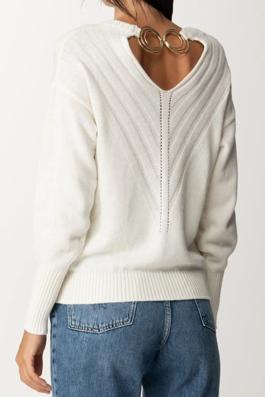 Simona Corsellini sweater with a soft line, with strapless straps, ribbed cuffs and hem and wide sleeves. Everything is completed with a detail of stitching and workmanship with ‘V’ design on the front. Match it with your jeans and sneakers for your super comfy day look!