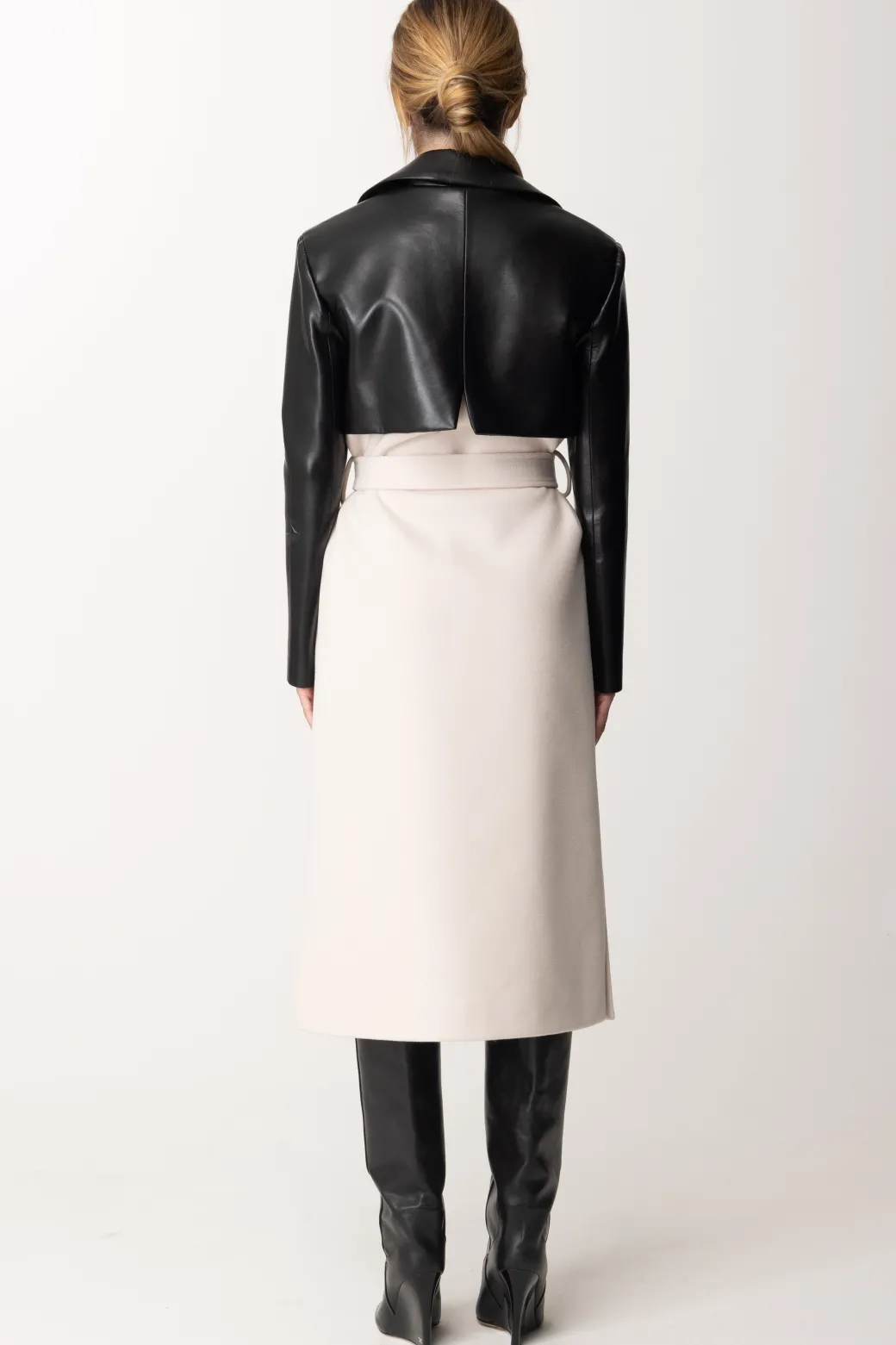 Trench bicolore effetto pelle a doppio petto, con cintura in vita e tasche. Un trench che aggiunge un tocco di glamour e di sofisticatezza ma anche di rock e sensuale. Perfetto per chi non vuole passare inosservata e per chi vuole osare con un modello così particolare.