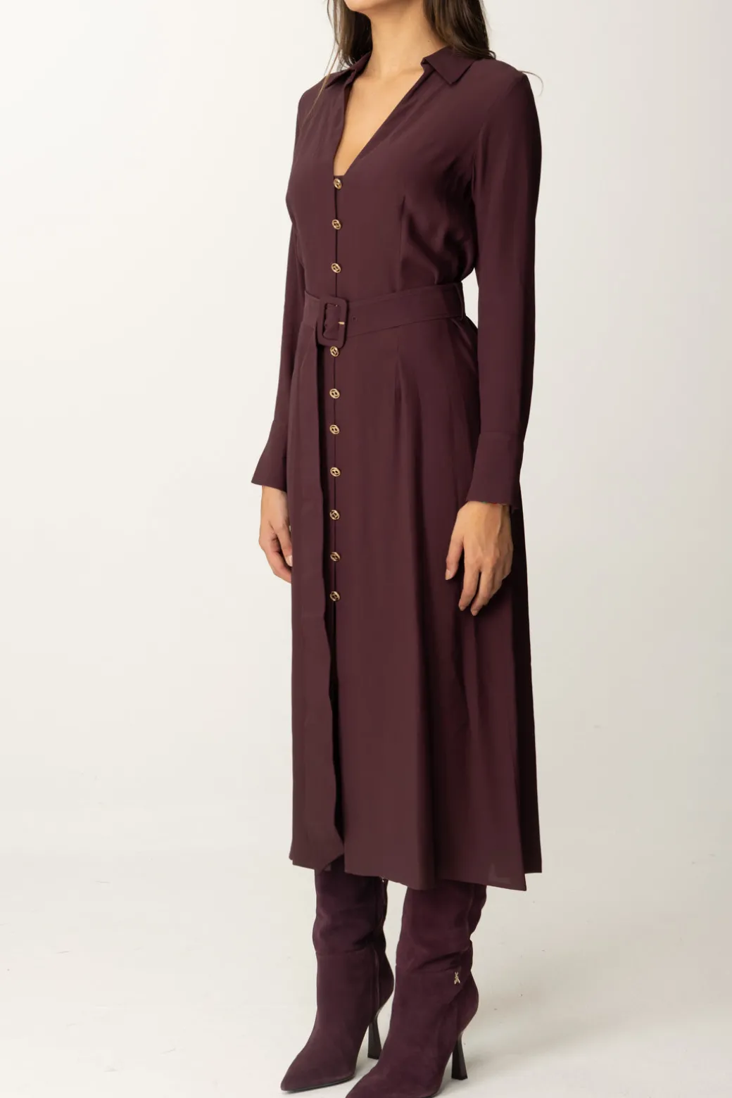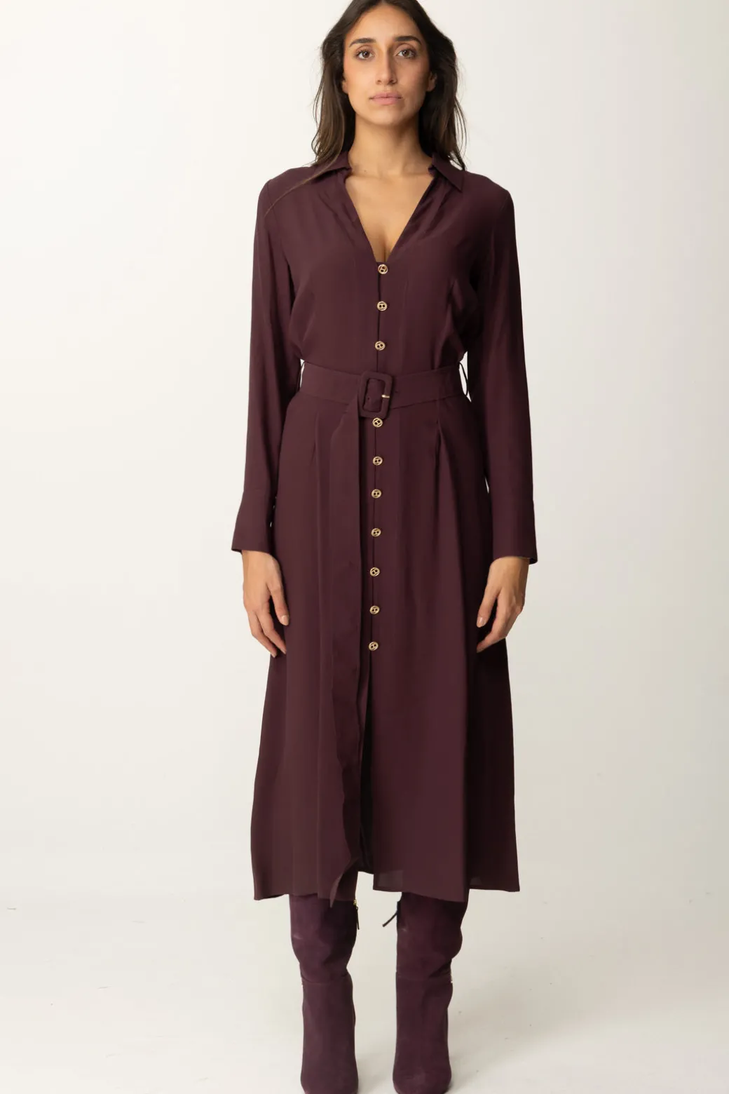 Linea pulita ed elegante per questo abito Twinset dal modello chemisier, impreziosito da bottoni dorati e maxi cintura in vita che delinea la silhouette.Perfetto per creare un look sofisticato ma rilassato, ideale da abbinare a sandali slingback alti per un tocco di classe in ogni occasione.
