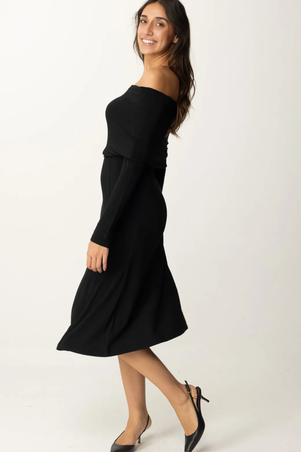 Eleganza invernale: questo abito Twinset in jersey con scollo a barchetta, indossabile anche off-shoulder, ha le maniche lunghe, tagli verticali, ricamo logo sul polso e una gonna svolazzante ch crea movimento. La linea fitted conferisce un look femminile e sofisticato.
