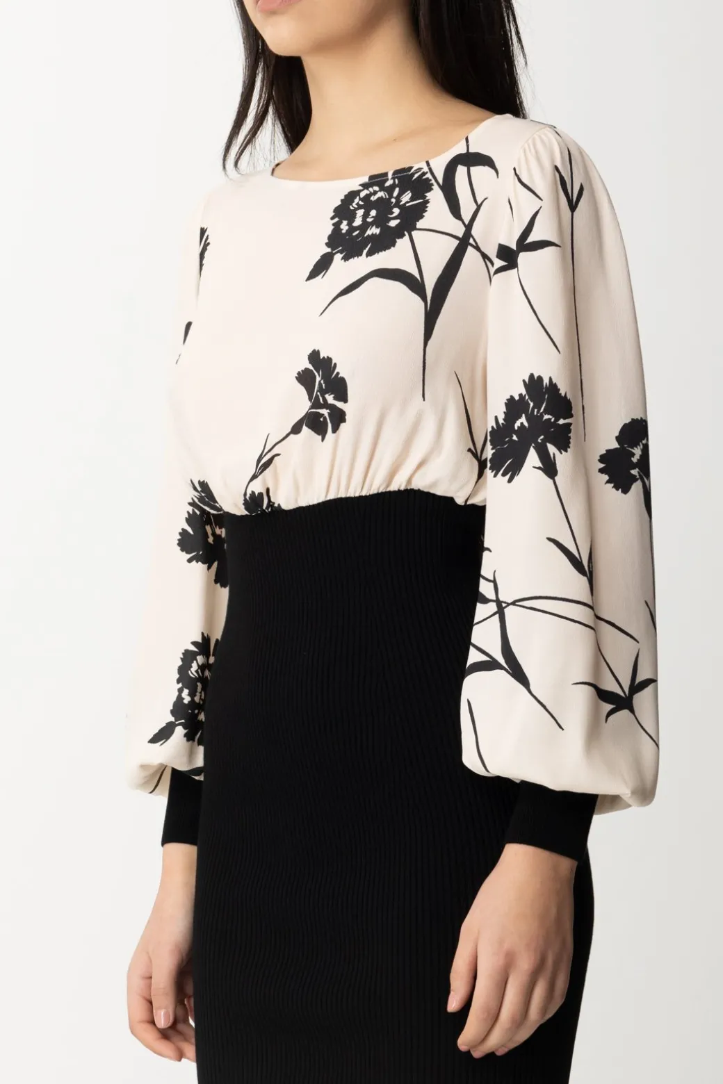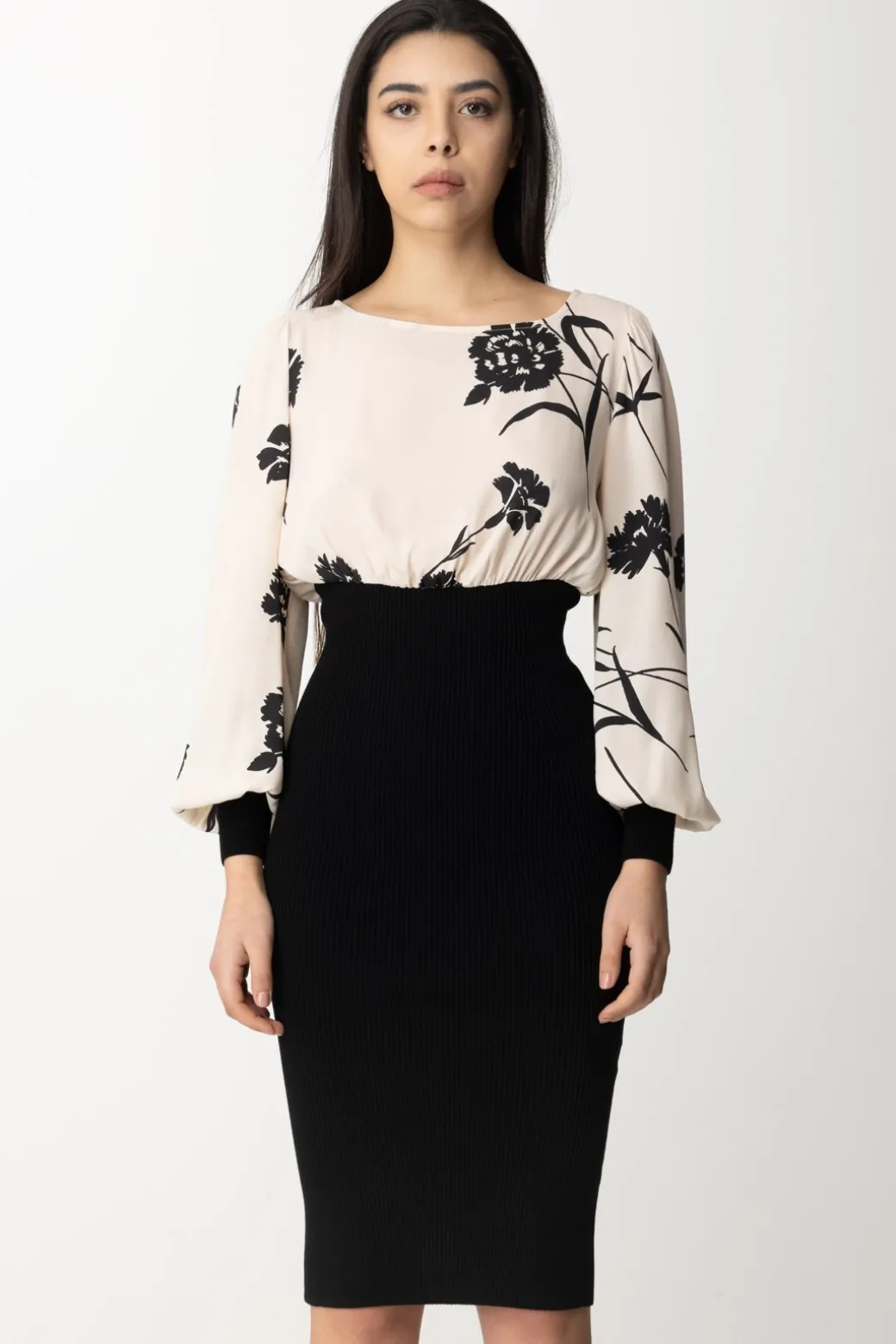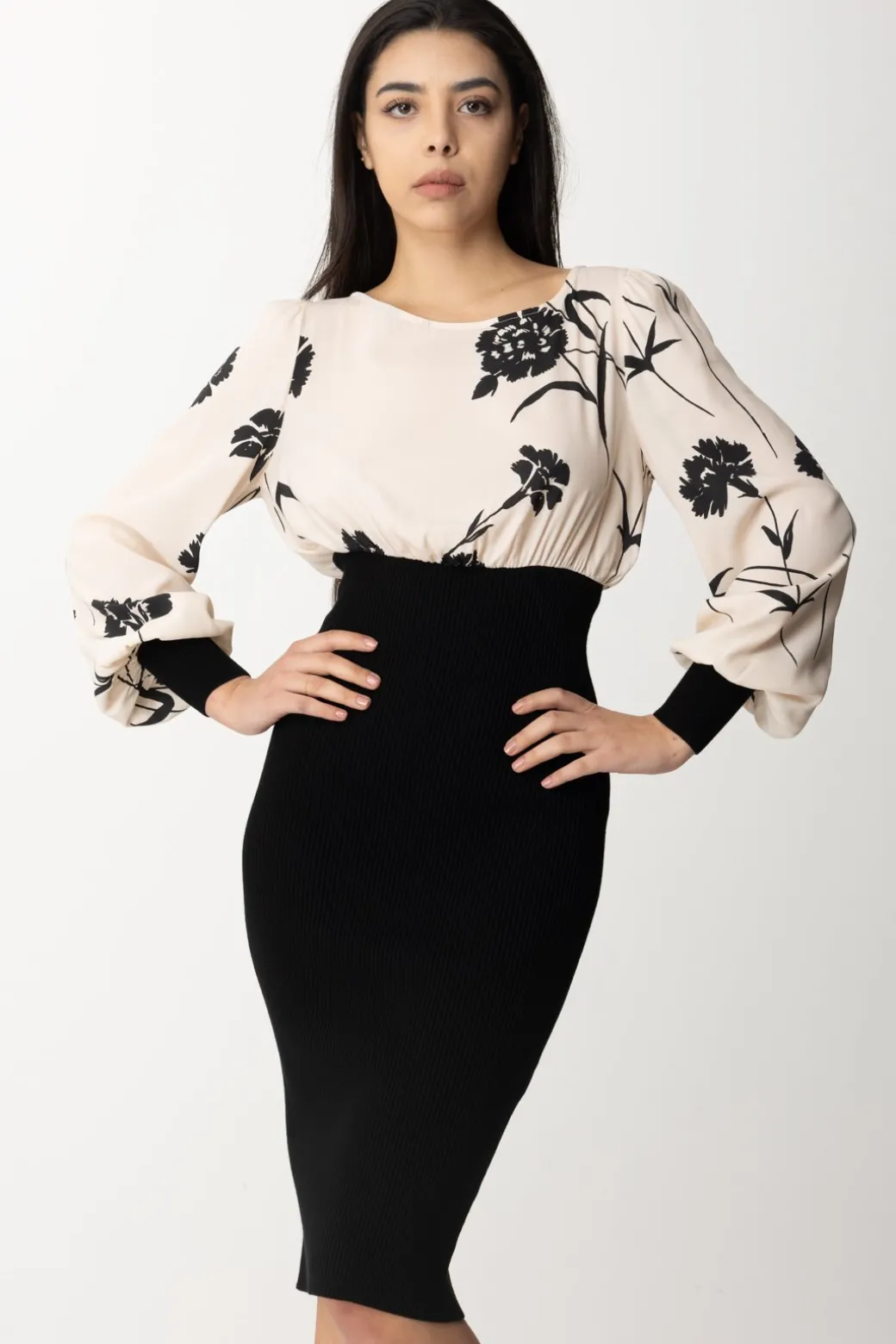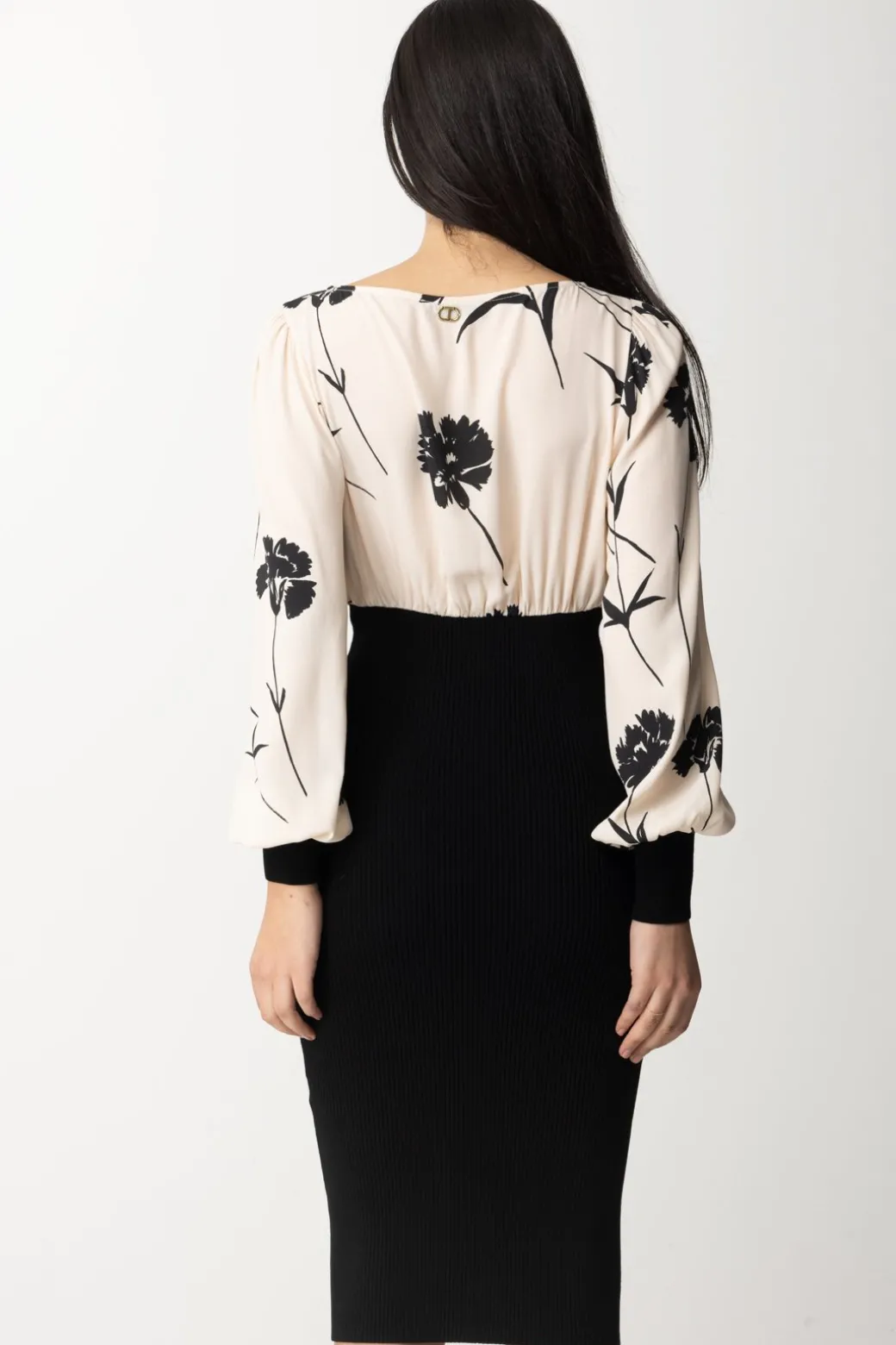 Un affascinante abito midi Twinset realizzato in maglia di crêpe di viscosa, presenta una stampa garofano all over che conferisce un tocco femminile ed elegante. Le maniche con polsini richiamano il colore della gonna midi aderente a contrasto, enfatizzando il punto vita e valorizzando le forme in modo armonioso.