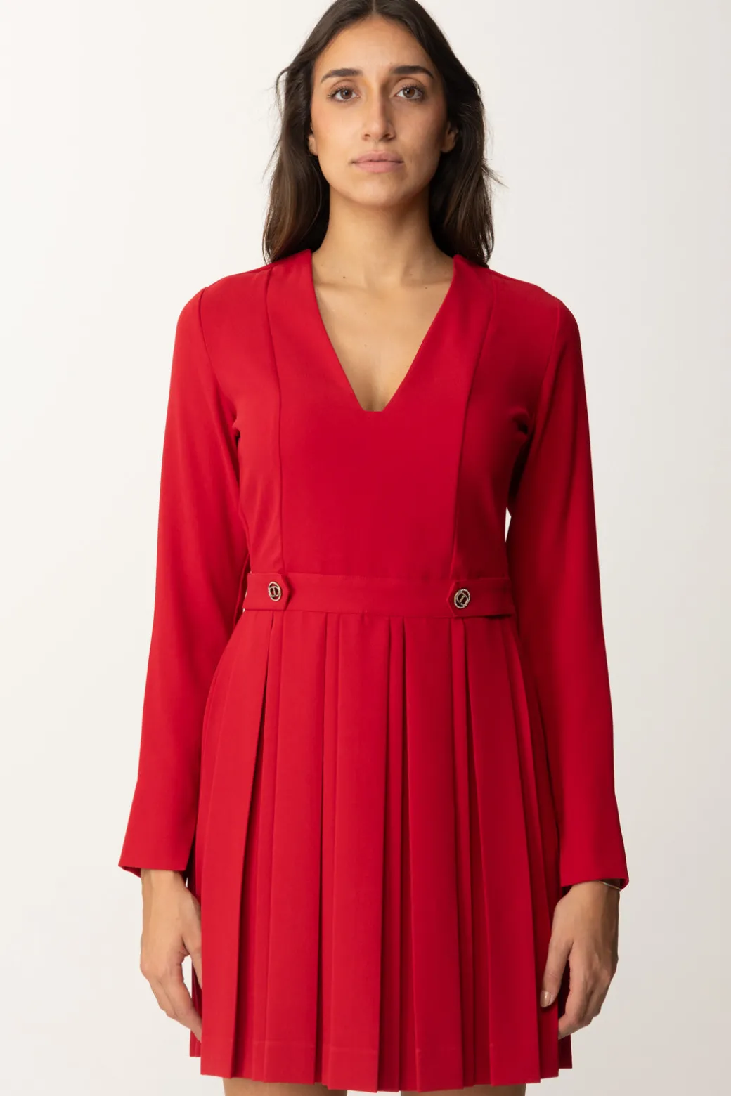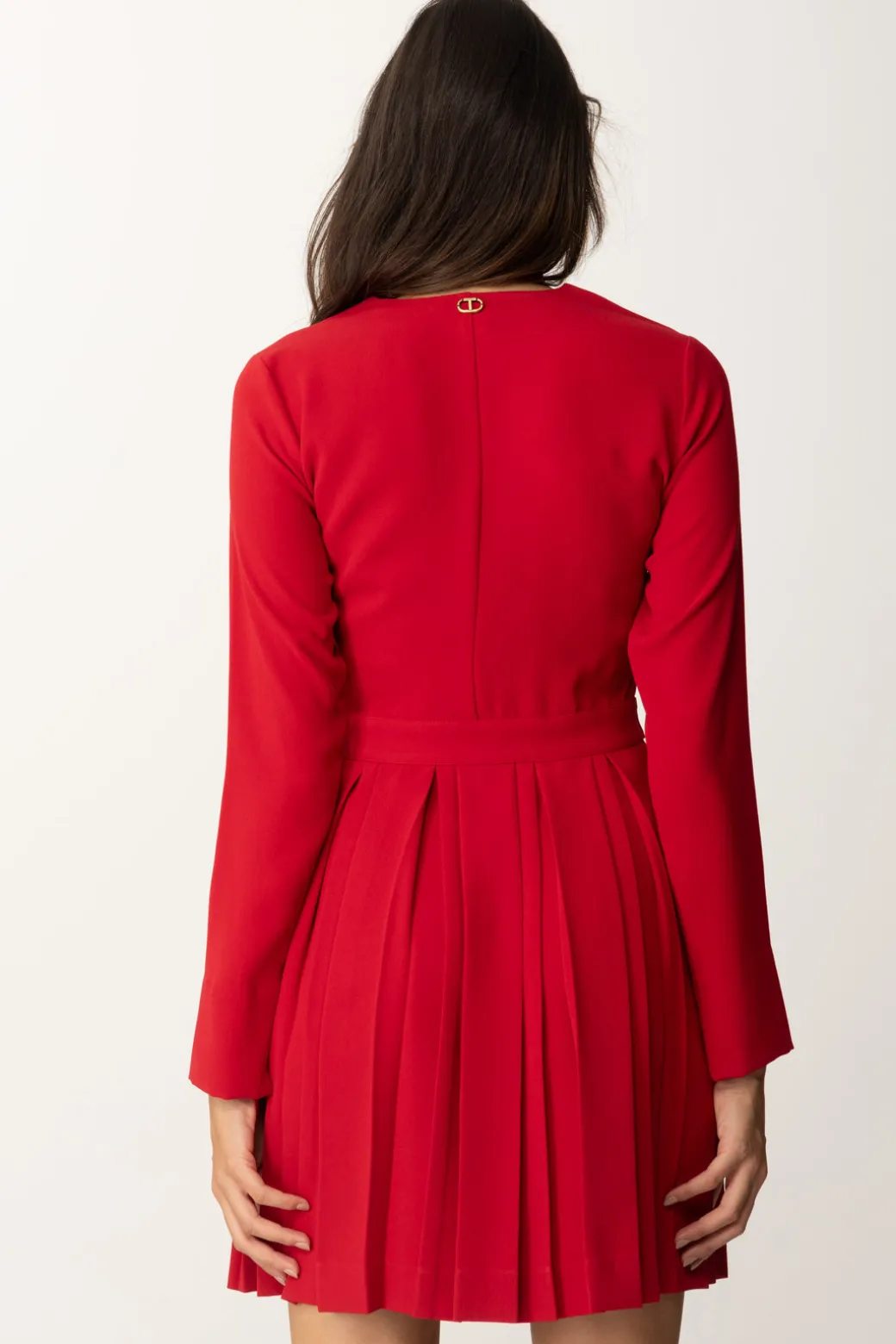 Questo abito Twinset combina la semplicità della parte superiore con la raffinatezza della gonna plissettata. I dettagli in vita con alamari e bottoni logati aggiungono un tocco di luce e delineano la silhouette.Ideale per un look sofisticato, può essere abbinato a stivaletti o mocassini per un tocco preppy o sandali per un tocco di eleganza.