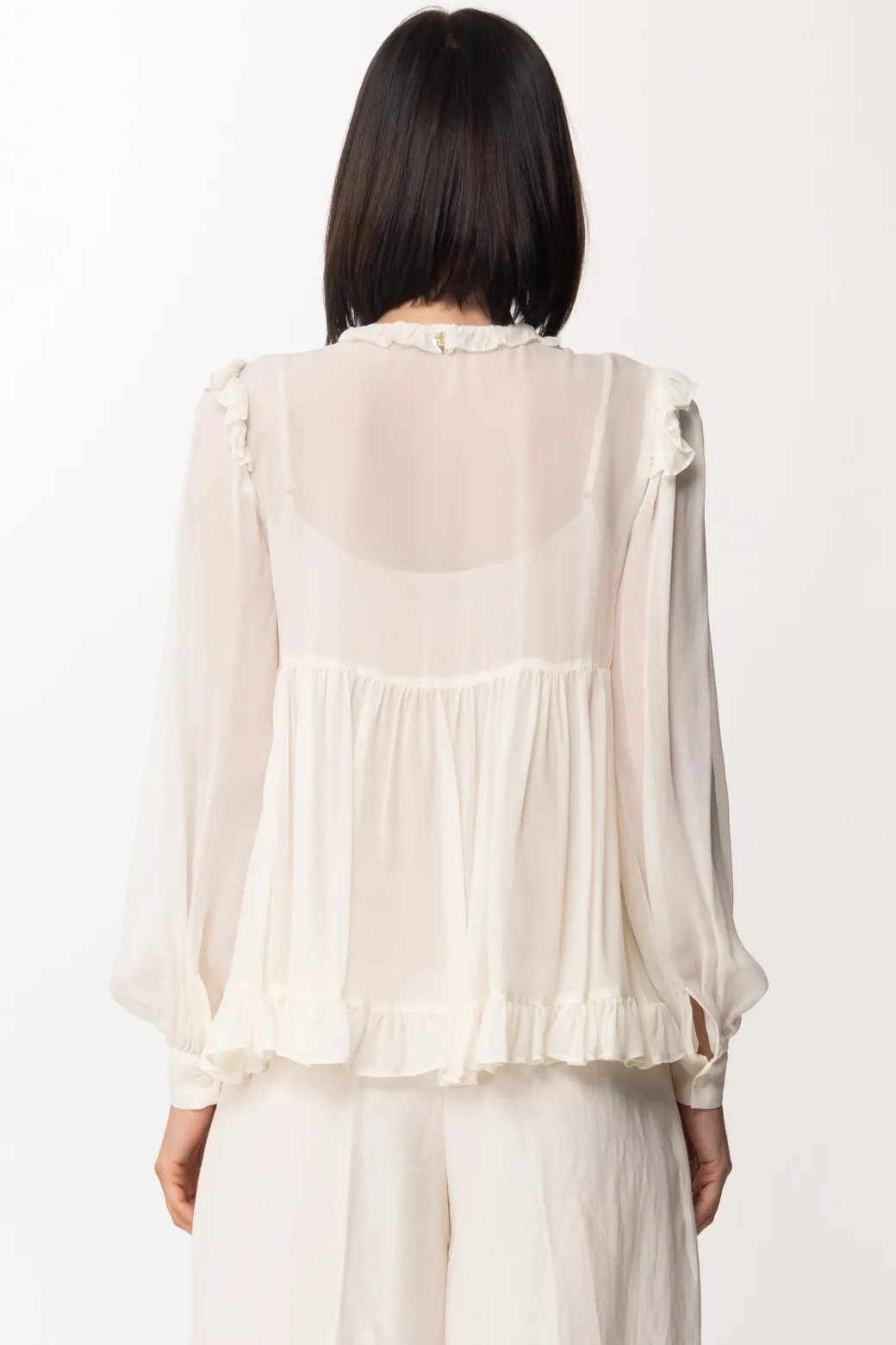 Blusa Twin-Set realizzata in morbida georgette per creare eleganti e delicati outfit da giorno. Maniche lunghe e ampie con polsini, il petto è ornato dall’applicazione di rouches e inserti in pizzo, conchè da una balza a partire dalla linea sotto al seno. Ariosa e fresca, come dovrebbero essere i capi della stagione calda!