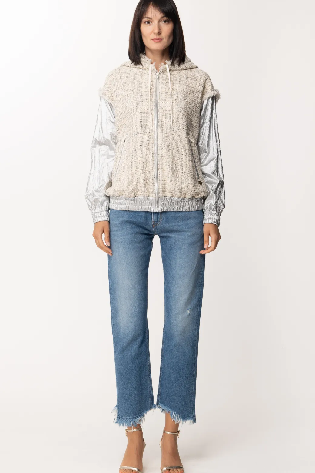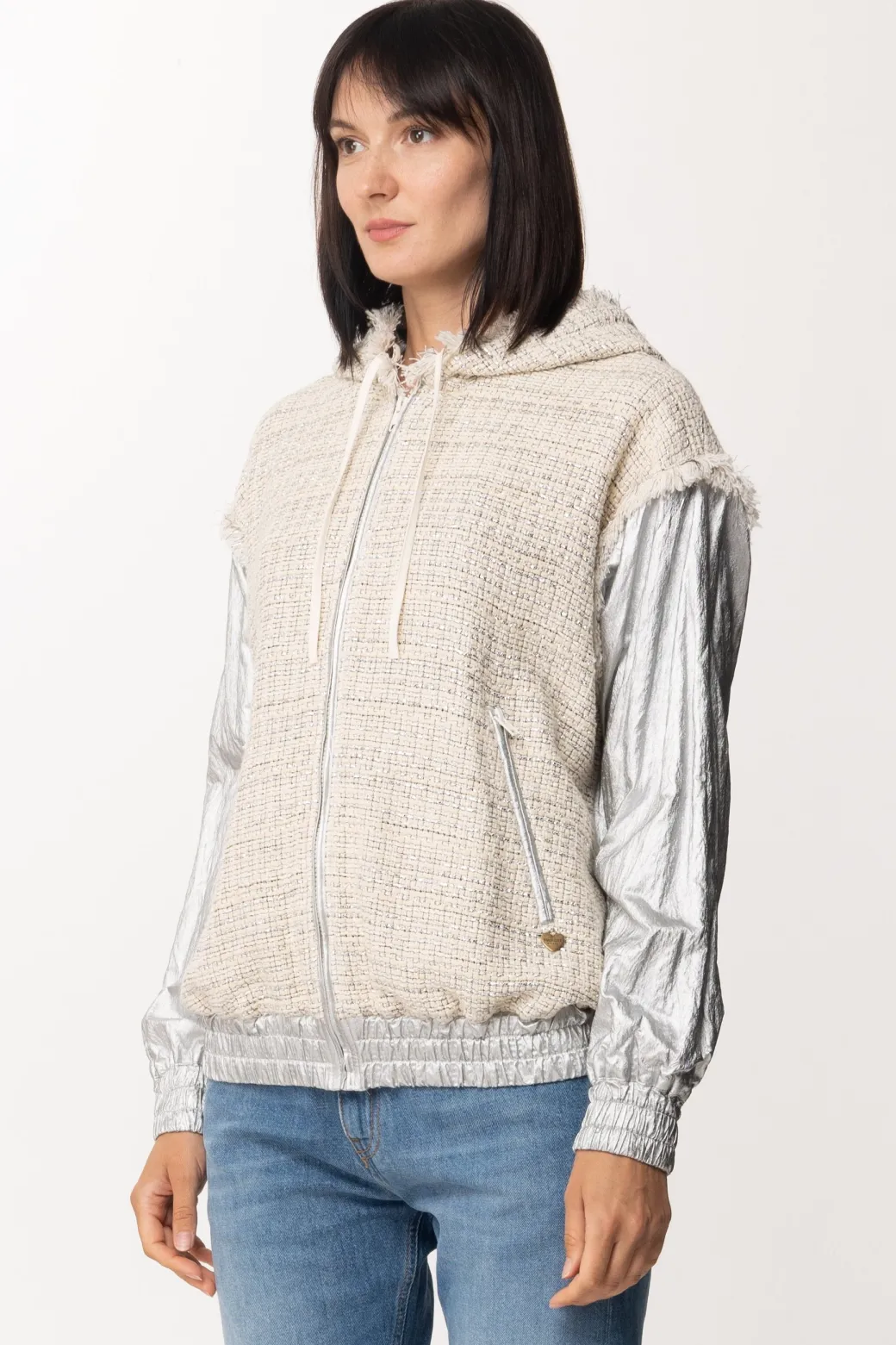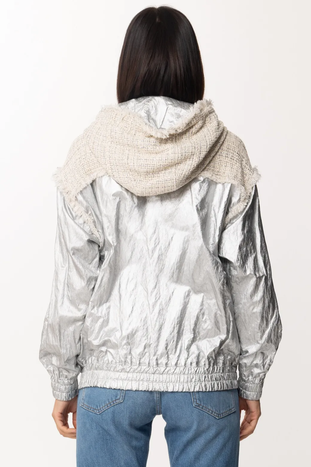 Un capo Twin Set del tutto originale da sfruttare con ogni tuo outfit primavera-estate, grazie all’esclusivo design realizzato in cotone spalmato silver nelle maniche e tessuto bouclé con profili sfragiati su tutto il resto, donerà carattere e stile ad ogni tuo look.