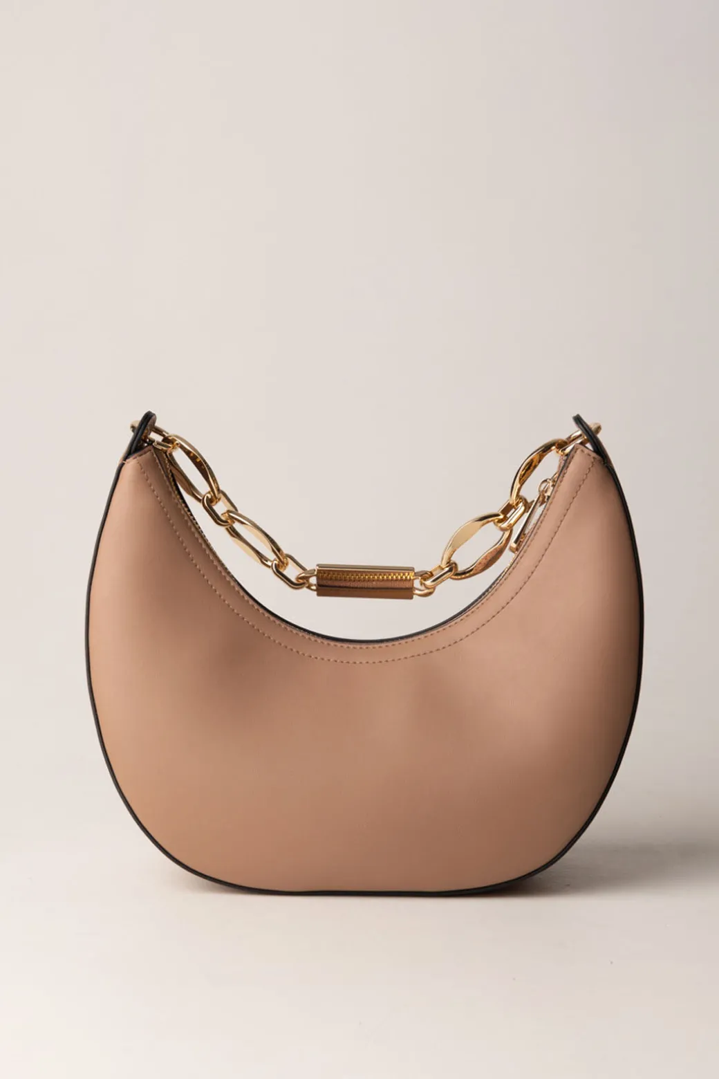 Design accattivante per la borsa Twinset effetto pelle, dalla forma a mezzaluna impreziosita con una catena logata chunky, logo lettering frontale e la comoda tracolla removibile. Ideale per aggiungere un tocco glamour a un look casual-chic.