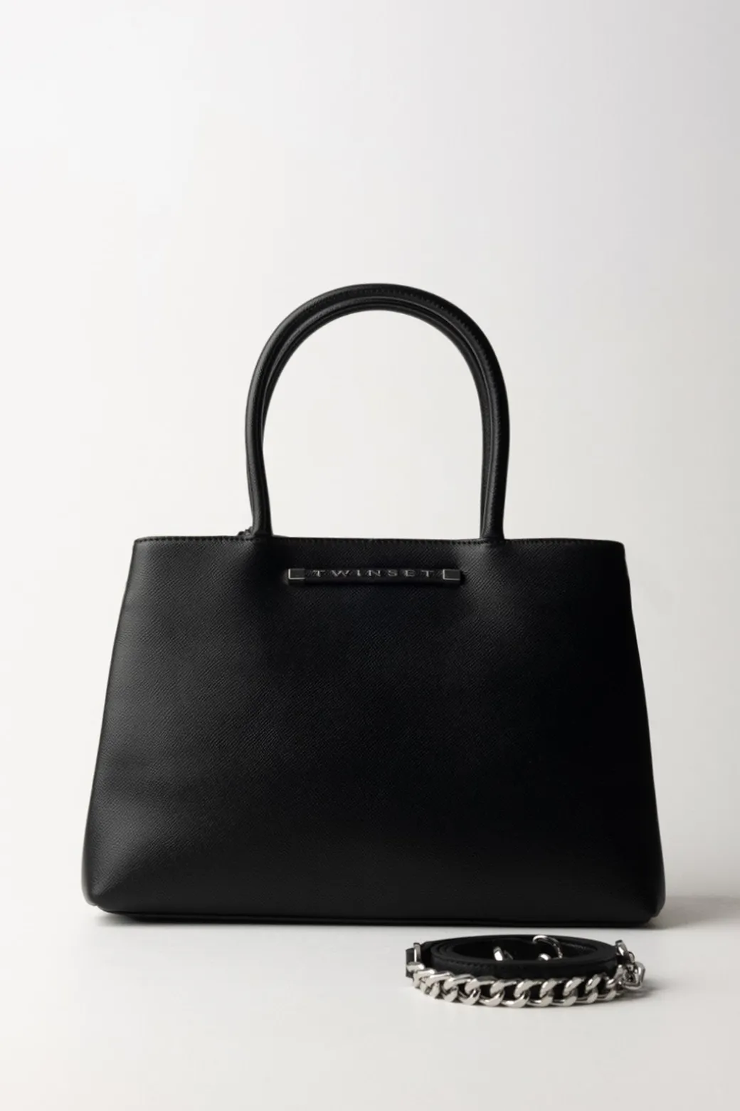 Borsa tote Twinset di dimensioni medie e perfettamente organizzata in scomparti interni che la rendono l’ideale compagna delle tue lunghe giornate fuori casa. Tre scomparti interni di cui uno con chiusura zip, la puoi portare a mano così come a spalla grazie alla tracolla rimovibile: un ulteriore elemento di versatilità che te la renderà ancora più indispensabile. Logo lettering sul fronte.