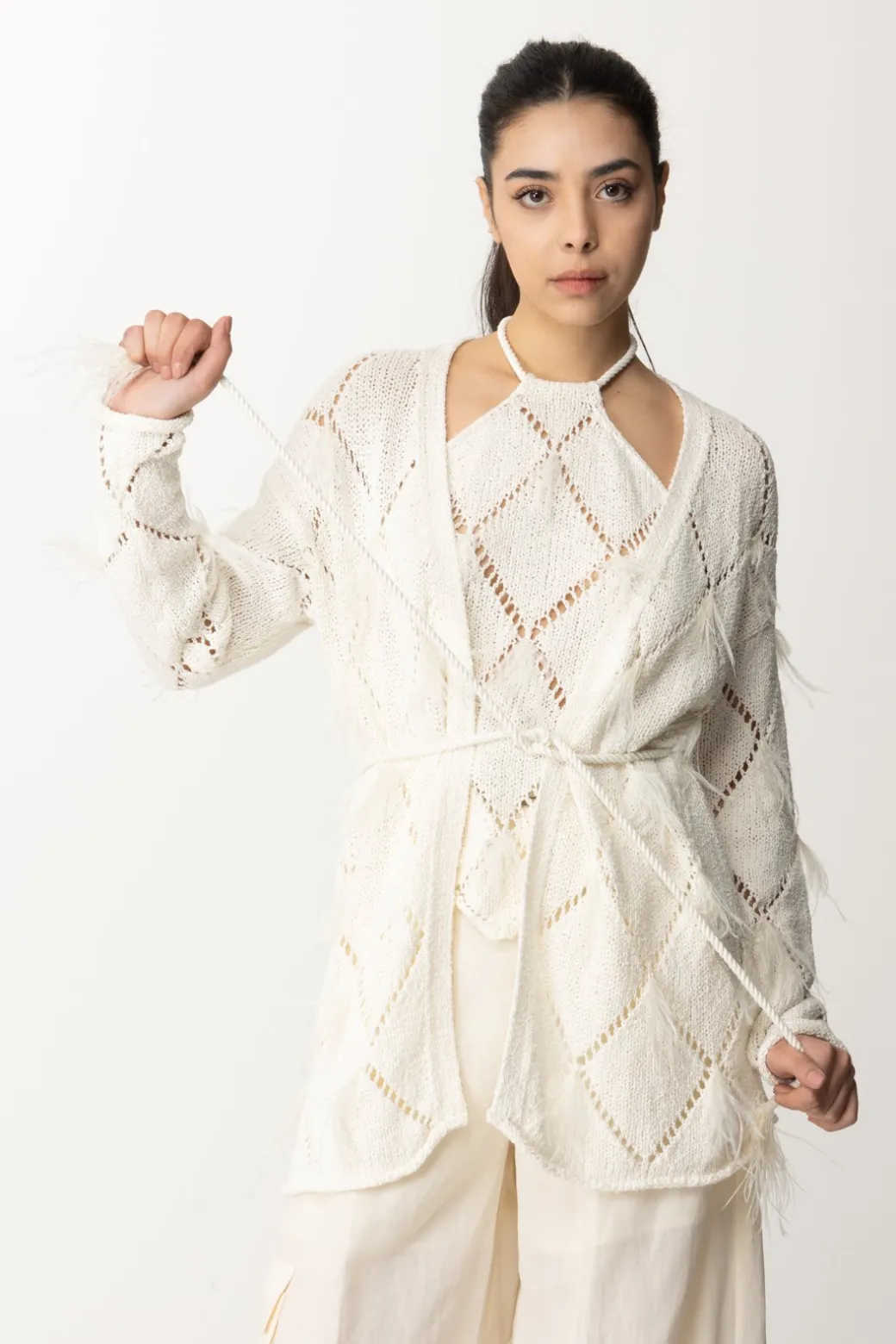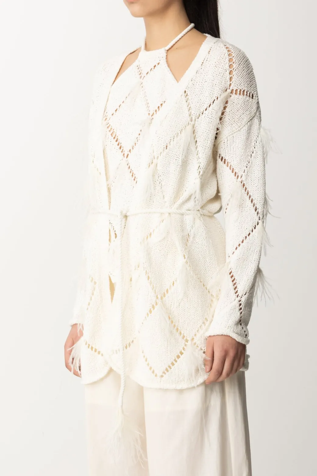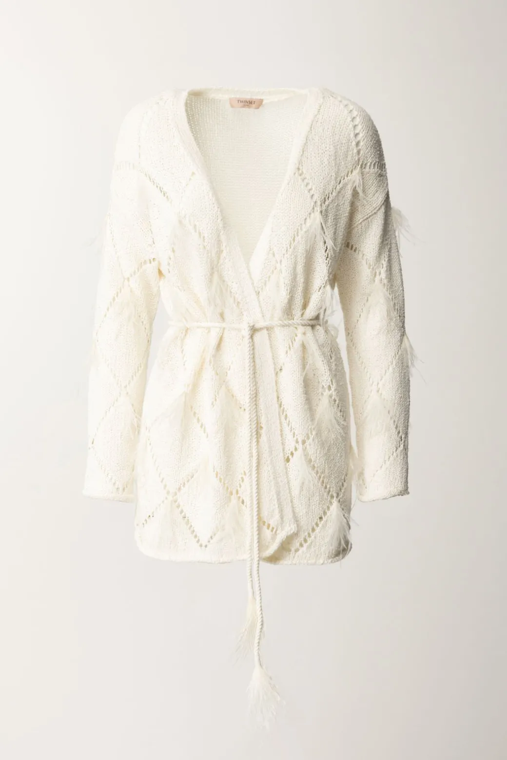 Un top che conquista per la sua delicatezza e originalità: cardigan Twinset caratterizzato da maglia traforata a losanghe con applicazione di piumette, che gli donano un’allure ancora più eterea. Si avvolge intorno alla silhouette e si sagoma in vita grazie ad un sottile cinturino abbinato: il tuo “strato” più romantico del tuo guardaroba, da provare in tantissime combinazioni.