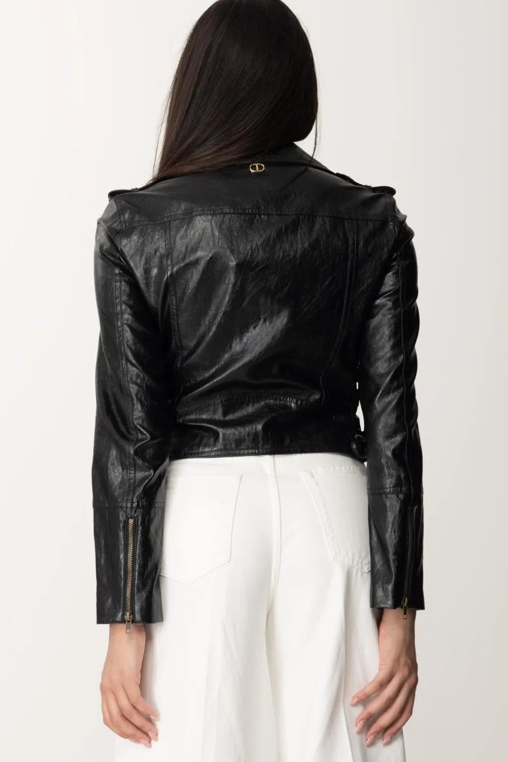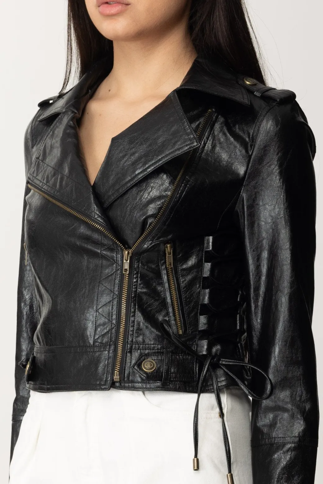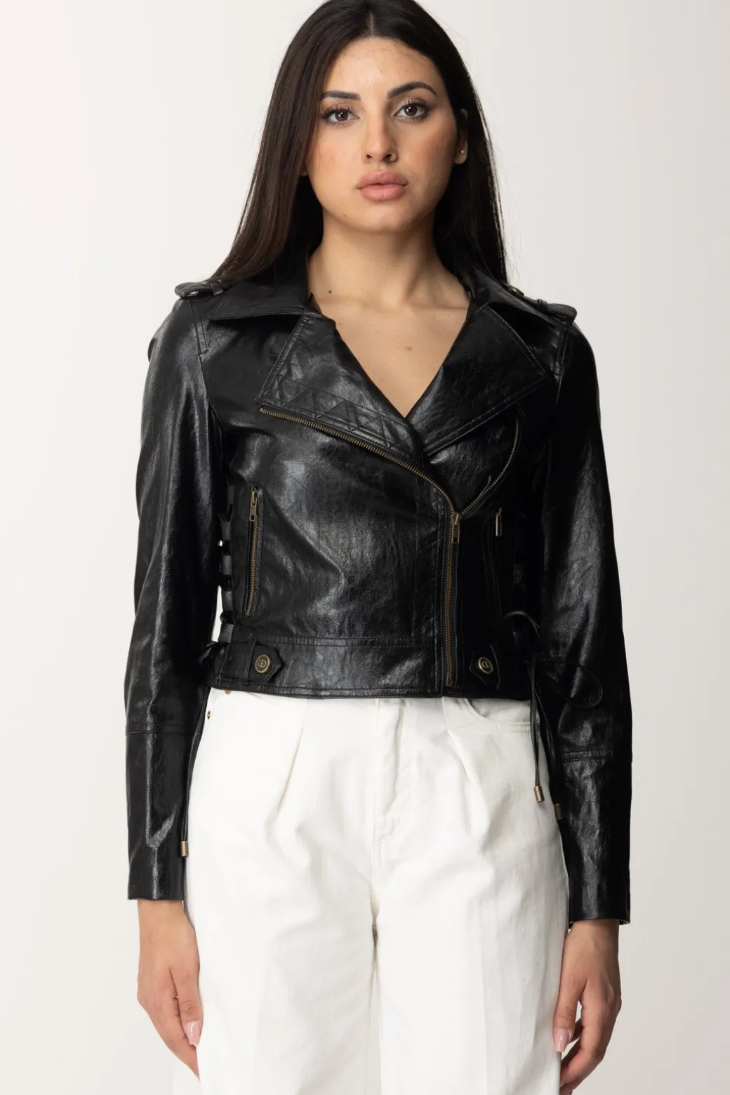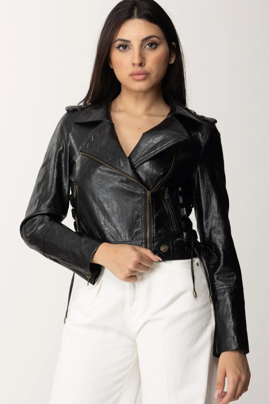Un’icona di stile rivisitata, questa giacca Twinset in nappa naturale cattura lo spirito ribelle e la raffinatezza senza tempo. La chiusura doppiopetto con zip in metallo aggiunge un tocco di modernità, mentre i dettagli incrociati di fettucce sui fianchi regolabili conferiscono un’aura di originalità. Aggiungi un tocco rock chic al tuo look quotidiano o rendi unico un outfit da sera.