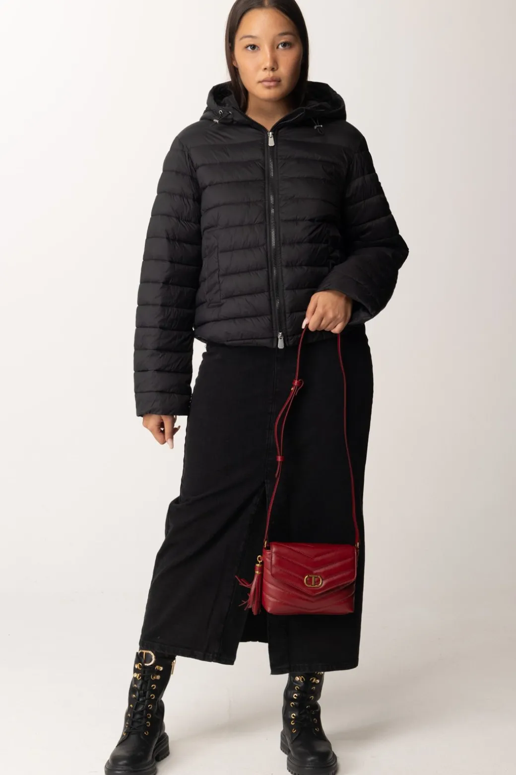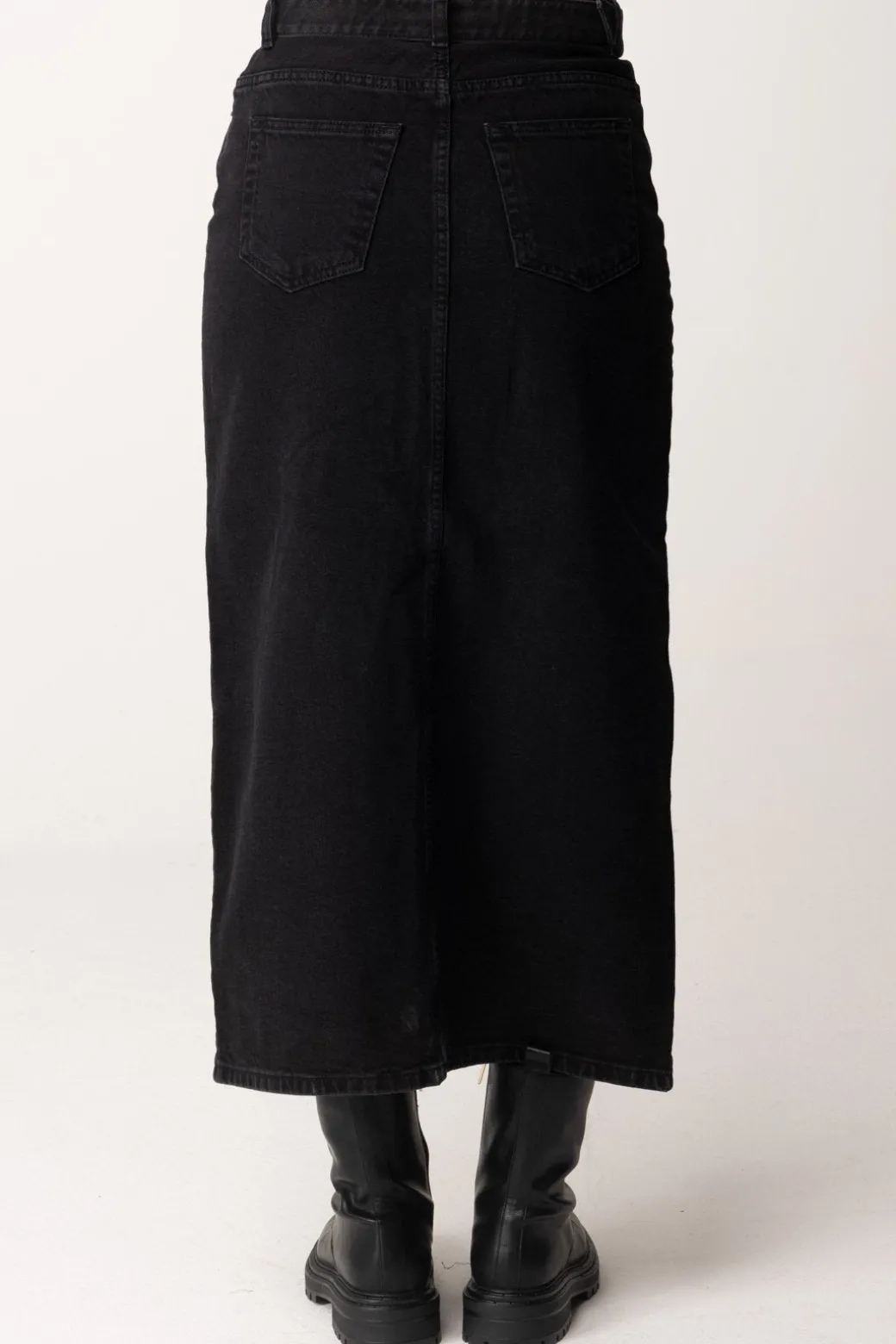 Gonna Twinset realizzata in denim nero e abbellita da una cintura dello stesso tessuto illuminata dalla fibbia logo Oval T in oro. Lo spacco centrale aggiunge un tocco audace. Perfetta con un dolcevita e stivaletti per un look sofisticato ma grintoso.