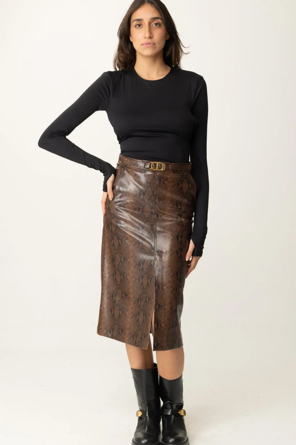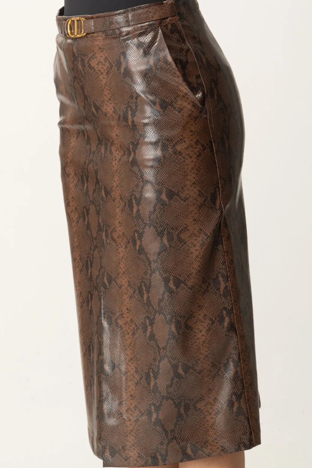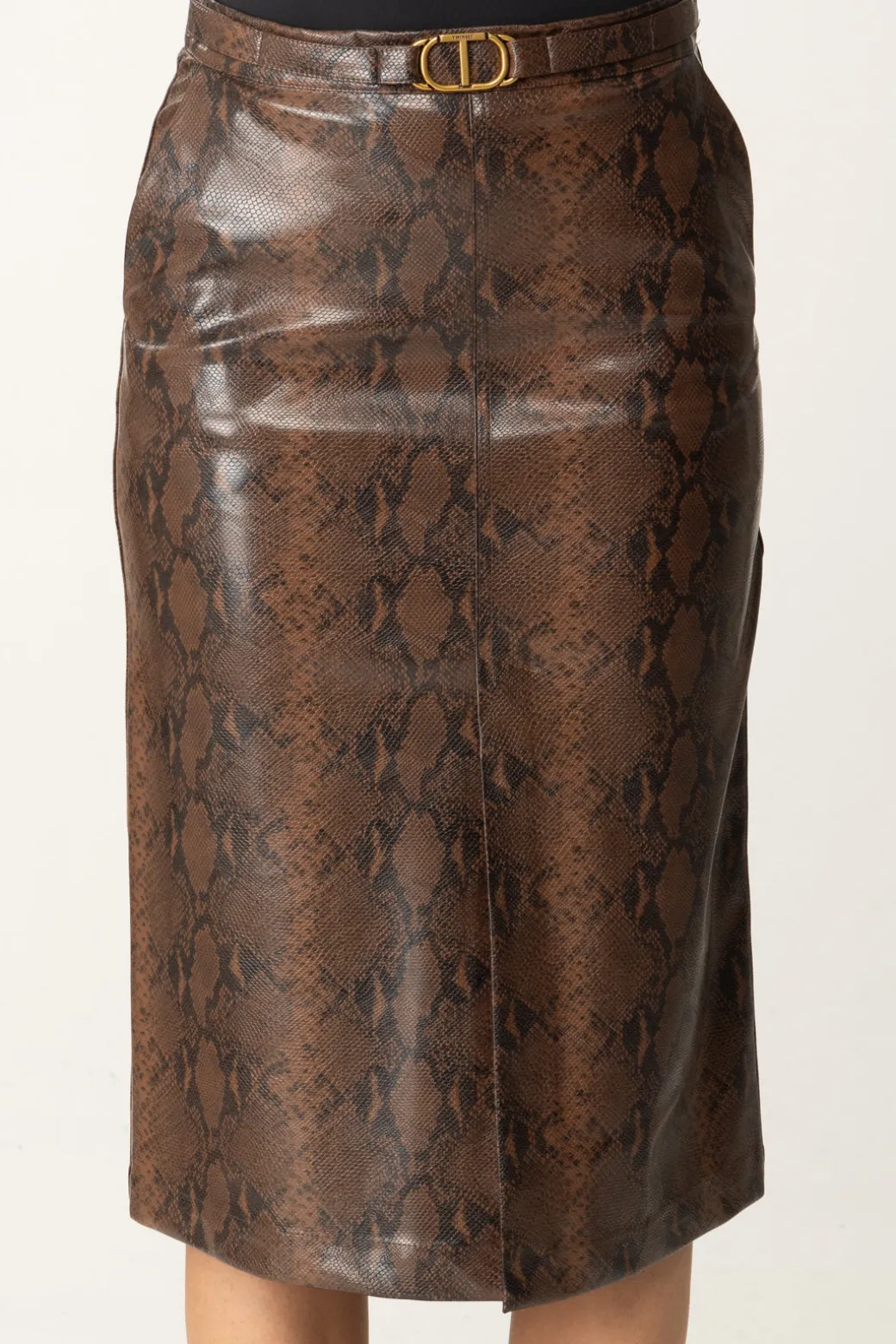 Non tutte le longuette sono uguali, altrimenti non potrebbe spiccare questa gonna midi Twinset in pelle effetto lizar, femminile e cool come poche altre! Vita contrassegnata da logo Oval T in metallo e spacchetto laterale, un capo sofisticato per look che lo siano altrettanto, da indossare h24 cambiando abbinamenti.