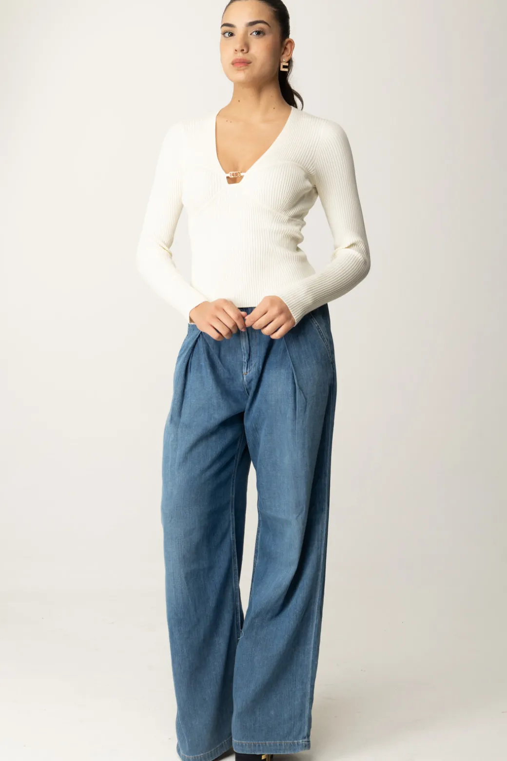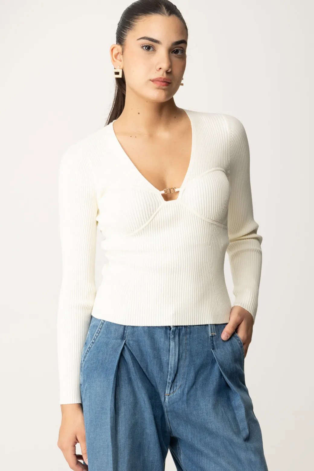 Seducente nella sua semplicità, questa maglia Twinset dalla linea fitted mette in risalto le tue forme grazie al profondo scollo a v con placchetta logo in oro e alle coppe sagomate che enfatizzano il seno. Un capo versatile e femminile, perfetto per aggiungere una nota sexy ai tuoi outfit da giorno e tempo libero.