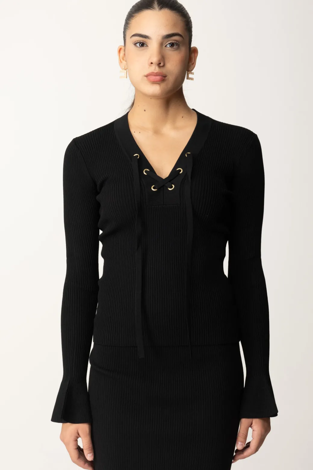 Maglia Twinset versatile e femminile, caratterizzata da tessuto a costine e vestibilità fitted, maniche lunghe con polsi svasati e, ultima ma non meno importante, la scollatura a v con intreccio di lacci che ti permette di regolarne l’ampiezza. Un capo basico ma non troppo, che amerai avere tra i tuoi passe-par-tout di stagione.