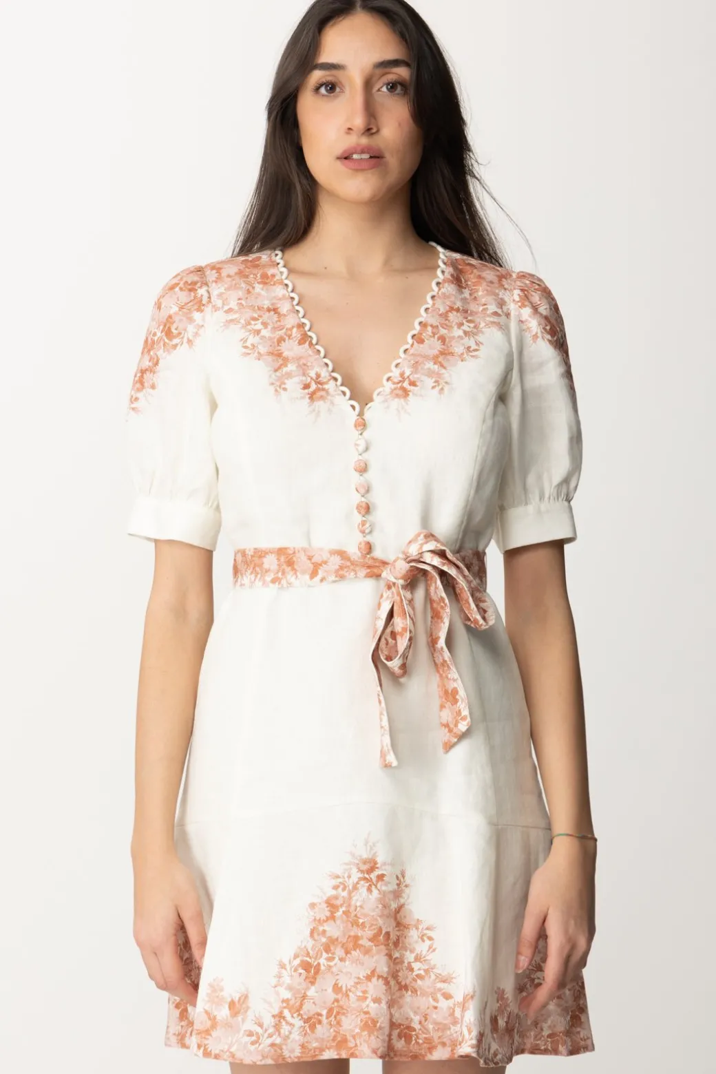 Con una stampa realizzata a posta per valorizzare questo modello, questo abito Twinset in lino merita molto pù che un’occhiata: anche perché è davvero delizioso! Un design che segue l’andamento della silhouette prima di allargarsi nella gonna mini, il punto vita è valorizzato da un cinturino in tessuto stampato, mentre lo scollo a v riproduce come ornamento le asole dei bottoncini frontali. Le mezze maniche a sbuffo completano l’insieme: non sei d’accordo anche tu sul fatto che sia bellissimo e, ti confidiamo, super versatile?