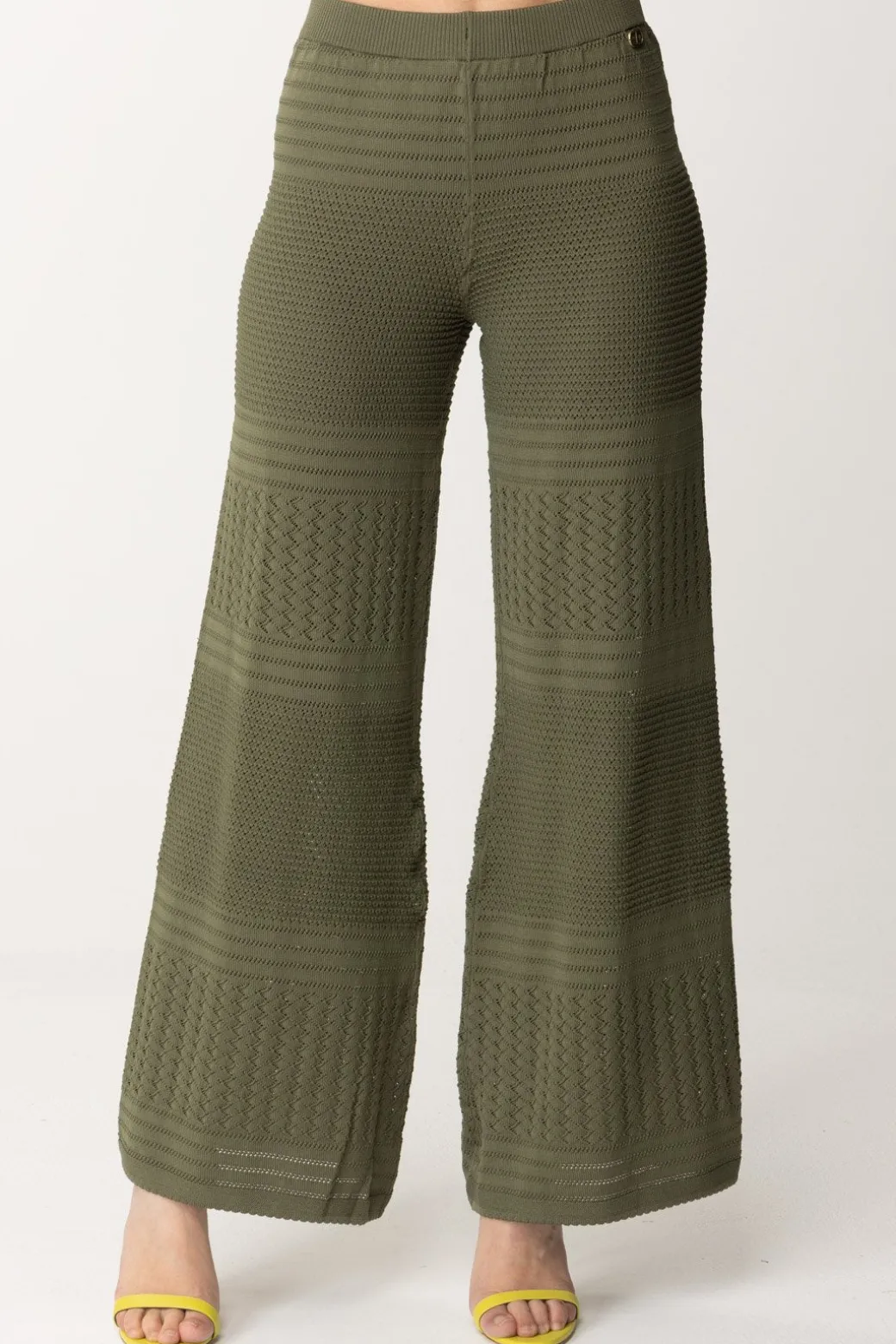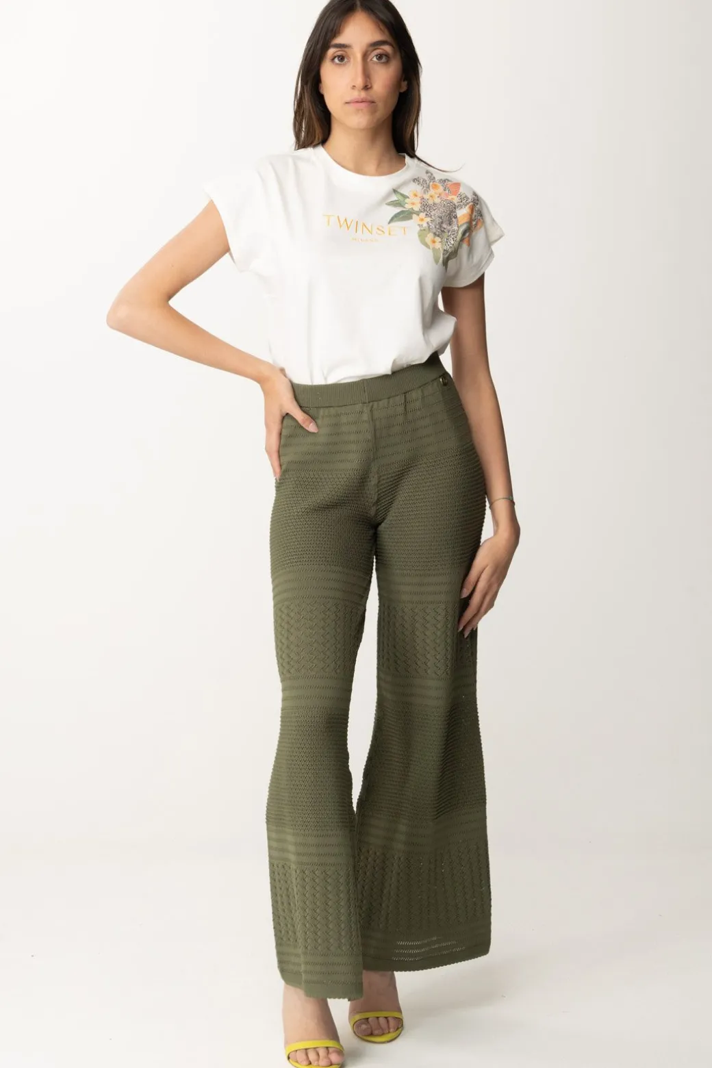 Comodi e versatili pantaloni in maglia Twinset, caratterizzati da un mix di punti lungo la gamba ampia e leggermente svasata. Bellissimi di giorno, bellissimi di sera: gioca con gli abbinamenti e goditi questo capo passe-par-tout con la usa allure sempre chic e femminile.