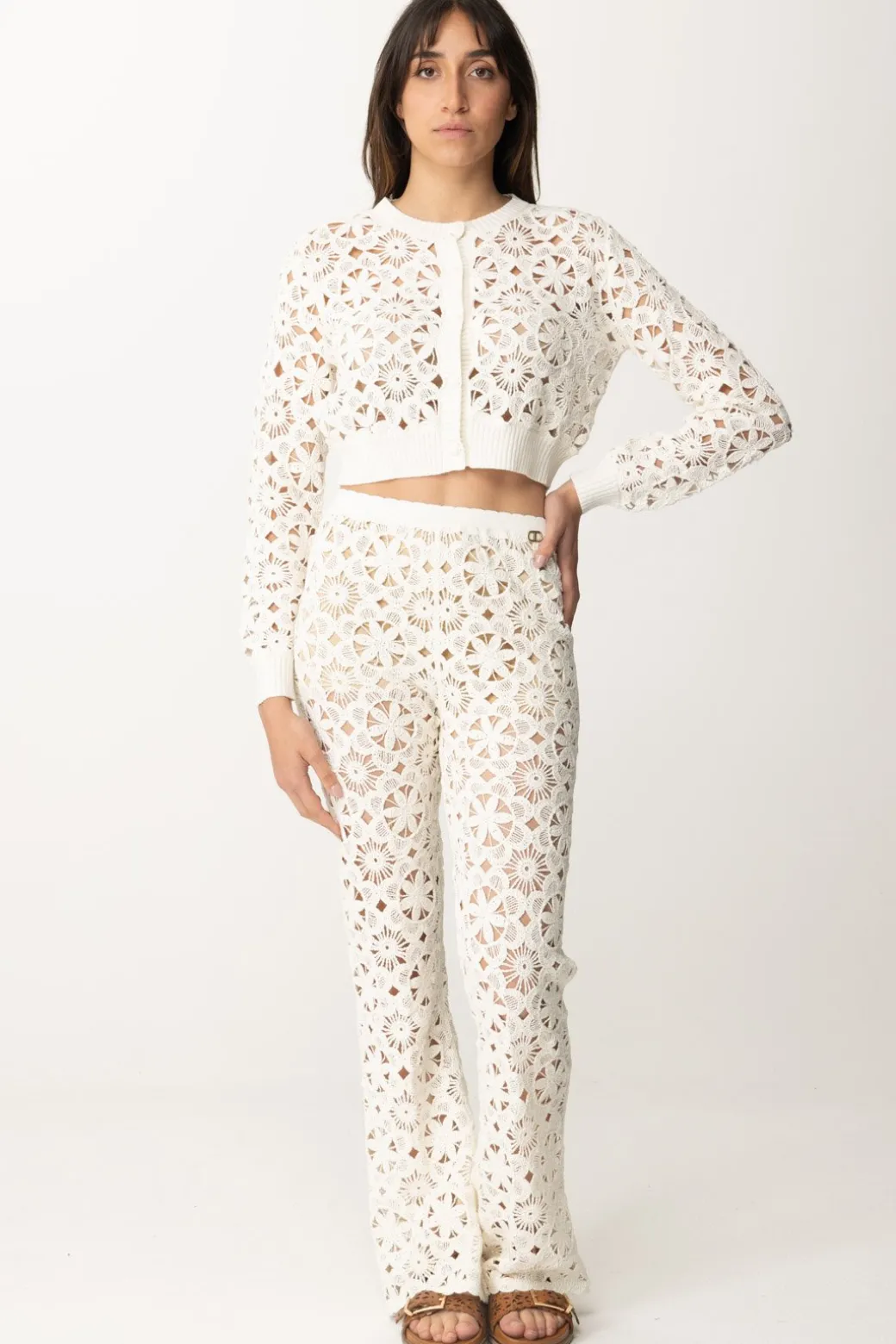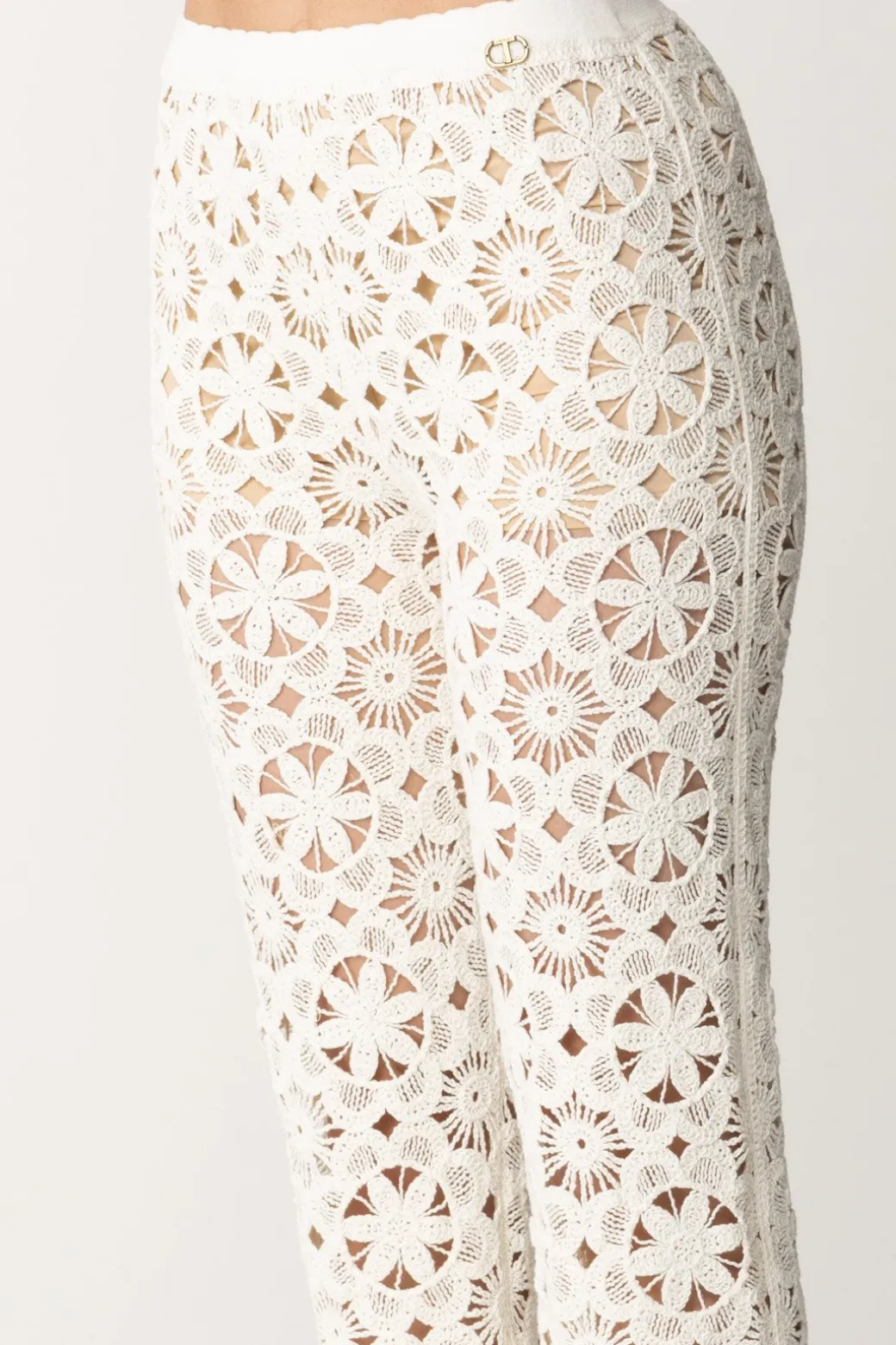 Design estremamente da bella stagione, con la sua lavorazione a crochet a fiori che porta ti porta subito ad una mattina di primavera o una sera d’estate: amerai questi pantaloni in maglia Twinset, che potrai combinare con il cardigan con lo stesso motivo a fiori così come con tanti altri top del momento.