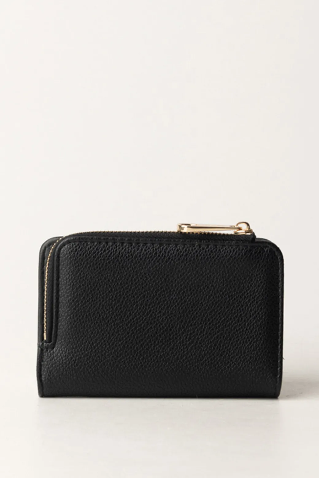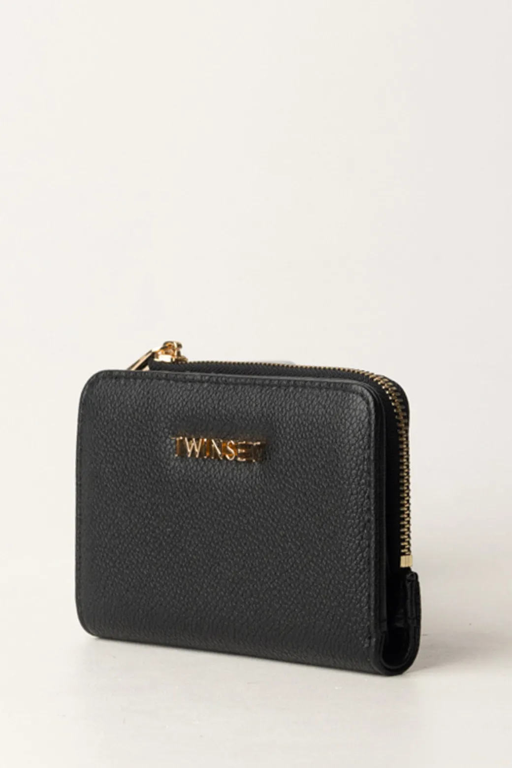 Portafoglio Twinset modello small, realizzato in pelle sintetica con chiusura a scatto, scomparti per carte e banconote e tasca portamonete con zip e logo Twinset in oro. Elegante e pratico.