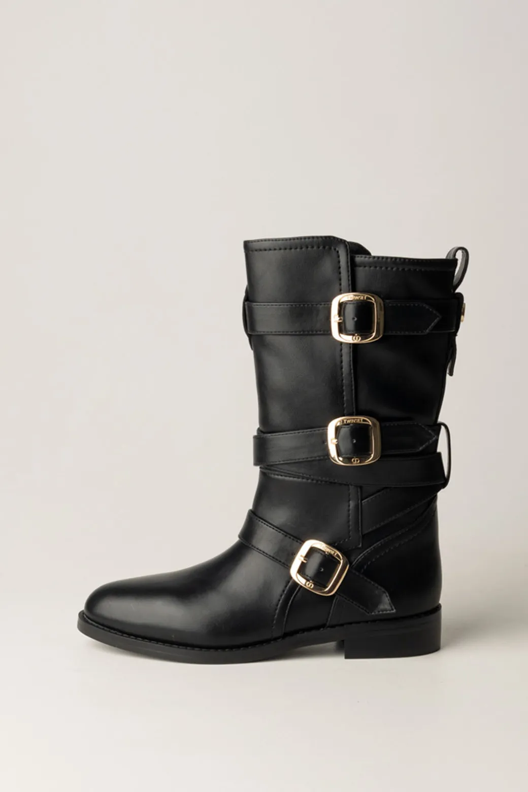 Stivaletti Twinset dallo spirito biker, con cinturini multipli e fibbie metalliche che conferiscono carattere. Da indossare con giacche di pelle e denim per un look rock-chic grintoso.
