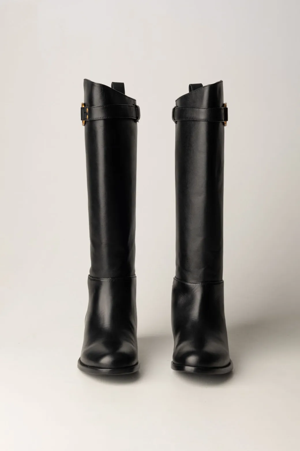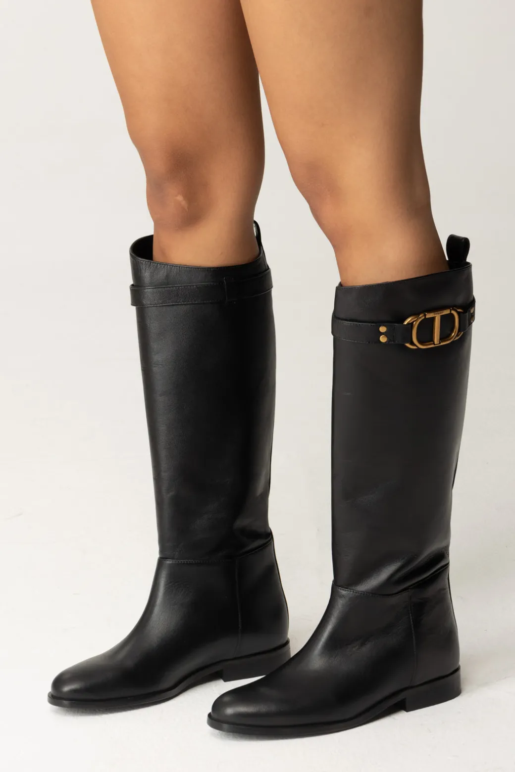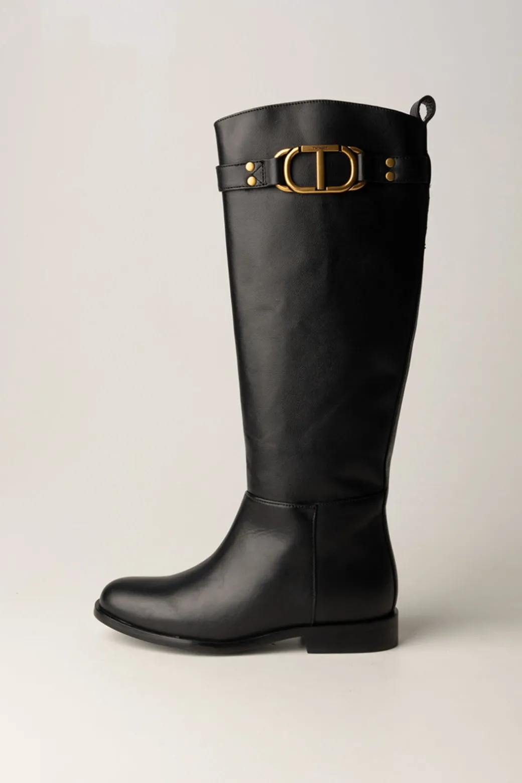 Stivali Twinset dal design classico ed elegante, con una fibbia dorata con logo che ne esalta lo stile raffinato. Perfetti per completare outfit invernali chic, da abbinare a cappotti lunghi e abiti a maglia.