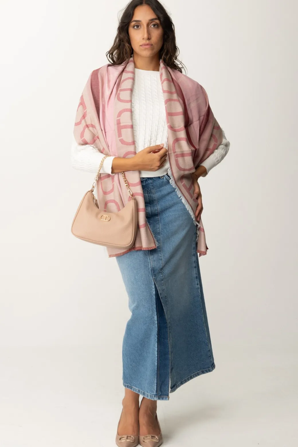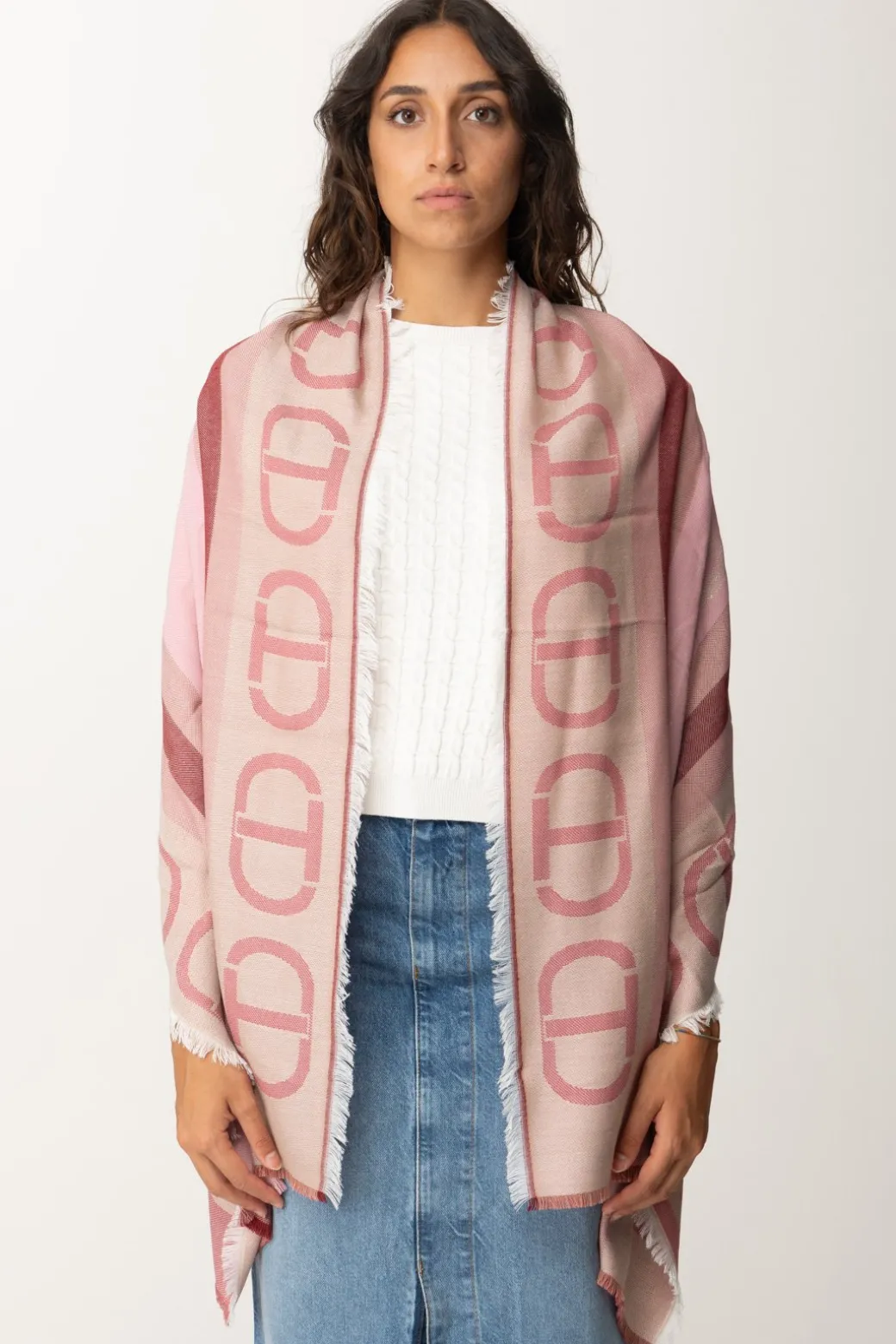 Stola Twinset in maglia jacquard con fantasia Oval T all over, bande a contrasto e fondi sfrangiati. Abbinala a un cappotto neutro e guanti di pelle per un look invernale elegante.