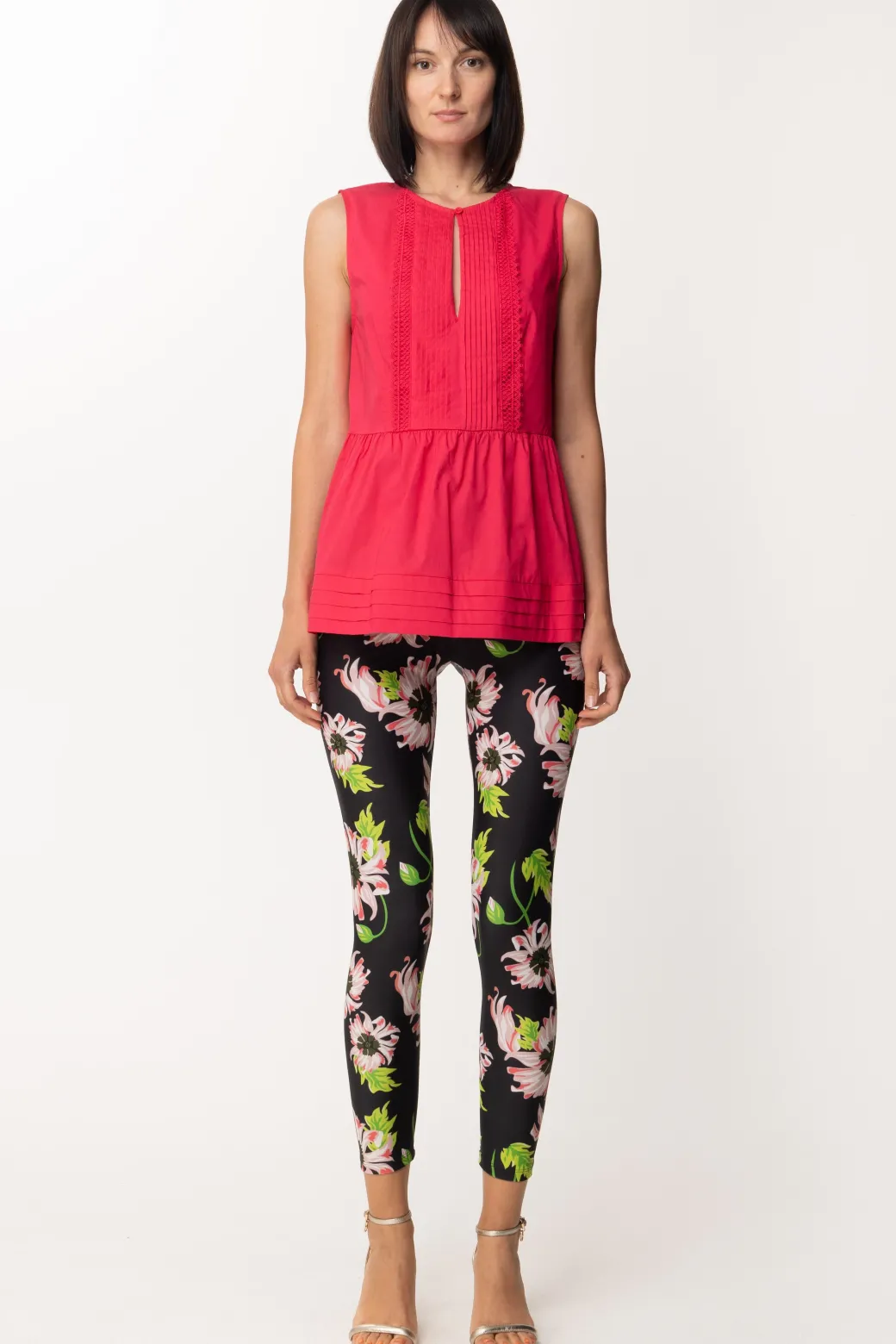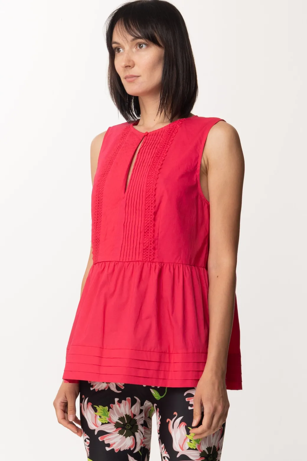 Tanti ornamenti a rendere delizioso e vacanziero al tempo stesso questo top Twin-Set smanicato. Il petto è ornato da scollo a goccia, pizzo e plissettaure che si interrompono al punto vita, dove un’arricciatura da il via ad una svasatura ornata sul fondo. Che altro dire? Buona bella stagione!