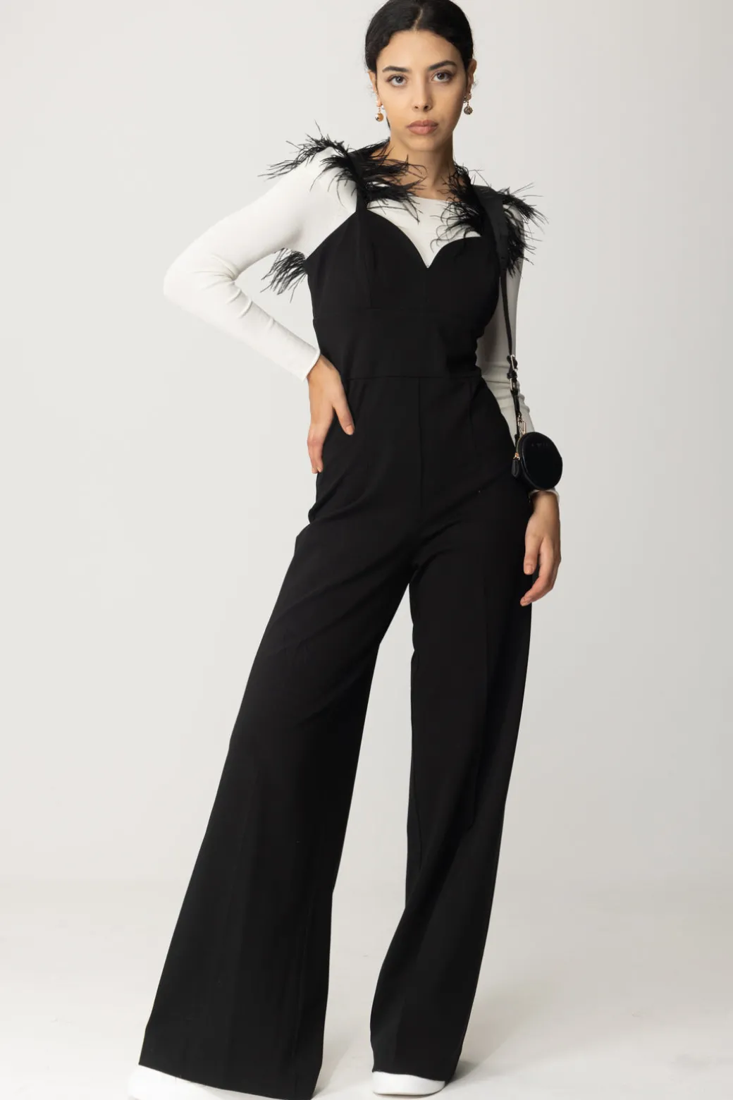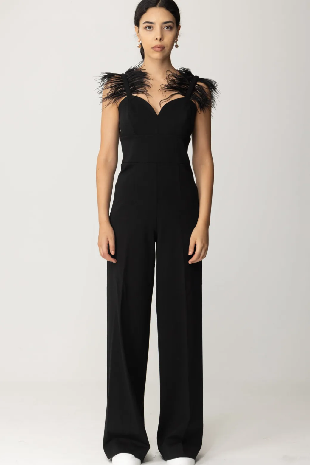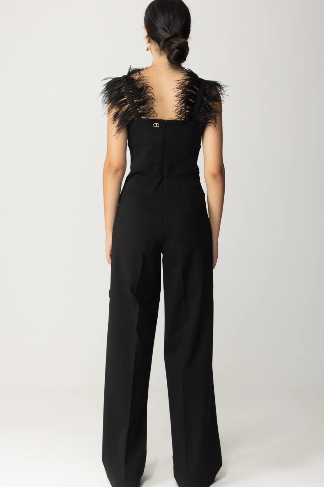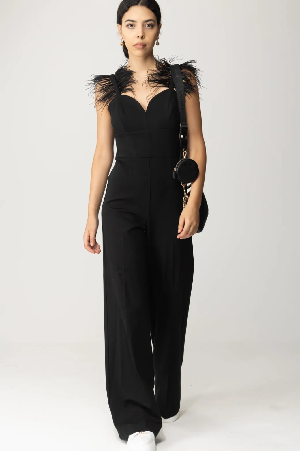 Non c’è un solo dettaglio fuori posto in questa tuta Twin-set! Taglio lungo con gamba dritta e monumentale, si alleggerisce al top con scollo cuore e bretelle sottili, ornate da piumette in tinta per un tocco glam. Non ti resta che indossare i tuoi gioielli più bright per illuminare questo outfit da sera come da party!