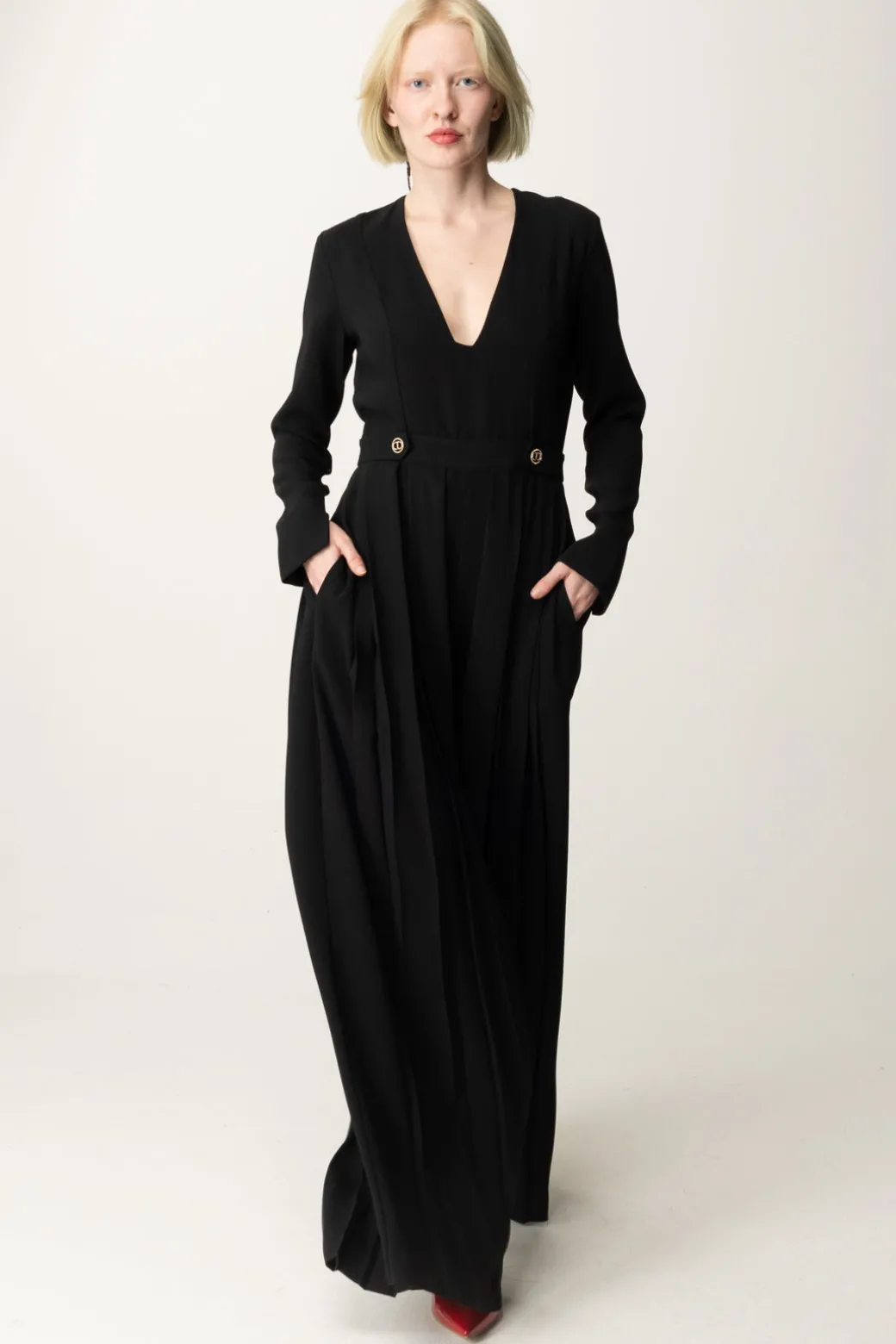 Questa raffinata tuta Twinset è l’ideale per eventi formali e serate speciali. Realizzata in crêpe con pieghe piatte sovrapposte e stirate fino al fondo, presenta un corpetto aderente con tagli verticali e una profonda scollatura a V che valorizza la silhouette. Le maniche lunghe e il taglio in vita con alamari e bottoni gioiello logati Oval T con strass aggiungono un tocco di eleganza. La linea fitted con pantaloni a gamba larga conferisce un aspetto sofisticato e moderno, questa tuta è un must-have per chi desidera un look chic e contemporaneo.