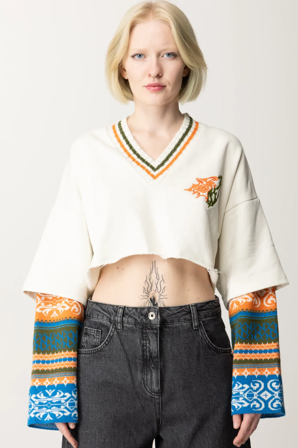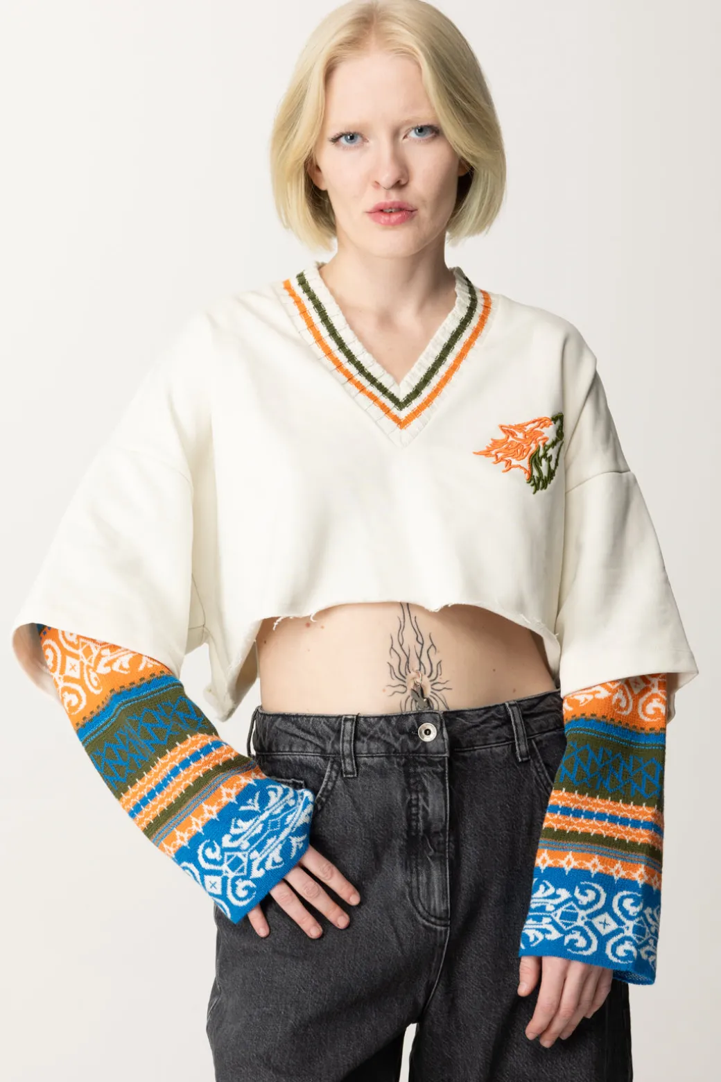 Colorato e originale, questo top spicca tra i suoi simili di stagione per la sua estrosità: una felpa Akep con in 100% cotone, caratterizzata da taglio crop con orlo a vivo e maniche lunghe con inserto jaquard a fantasia multitone. Un capo casual e rilassato nel fit ampio, con scollo a V a costine e ricamo sul petto a contrasto di colore, perfetto da combinare con i suoi bottom a vita alta più sporty, come denim, joggers e leggings.