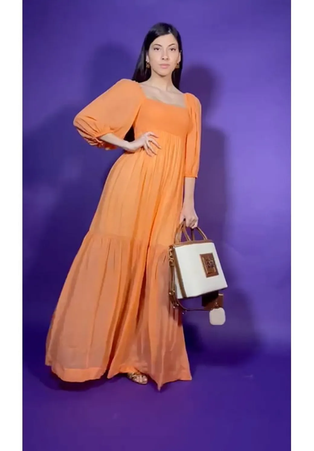 Morbida georgette di viscosa per questo abito lungo Aniye By che dovrà essere libero di fluttuare e accarezzare la tua silhouette. Design svasato dal petto in giù, caratterizzato da corpetto elasticizzato, l’ispirazione morbida torna sulle maniche a tre quarti a palloncino e sulla balza a metà gonna che rende l’insieme ancora più voluminoso.