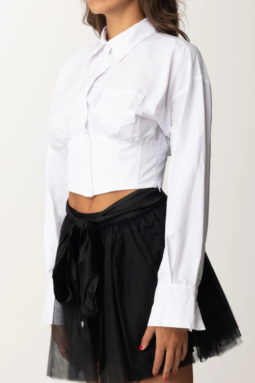 Camicia Aniye By dove il taglio corto è anche espediente per un bellissimo effetto bustier, che sagoma il punto vita e contrasta con il volume della parte alta di questo bel top. Per dare un twist ai tuoi look, provala con capi a vita bassa e che lo styling sia con te!