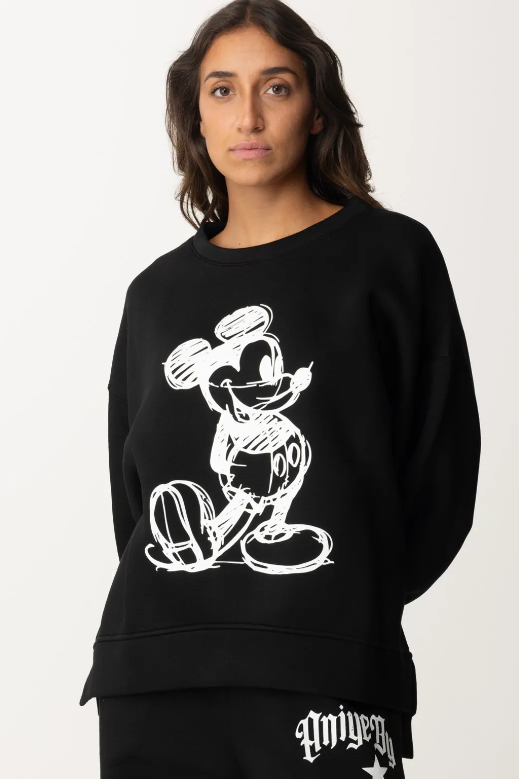 Una stampa che mette un po’ di nostalgia, ma utile a riportare un po’ di ironia e childhood nei tuoi outfit: con questa stilosissima felpa Aniye By hai un’ottima scusa per tornare a indossare Mickey Mouse! Realizzata in neoprene, il fit è ampio e il taglio asimmetrico più corto sul fronte, e le maniche a palloncino sottolineano la morbidezza del modello. Perfetta per il tempo libero e per tutte le volte in cui vorrai farti coccolare dai tuoi look.