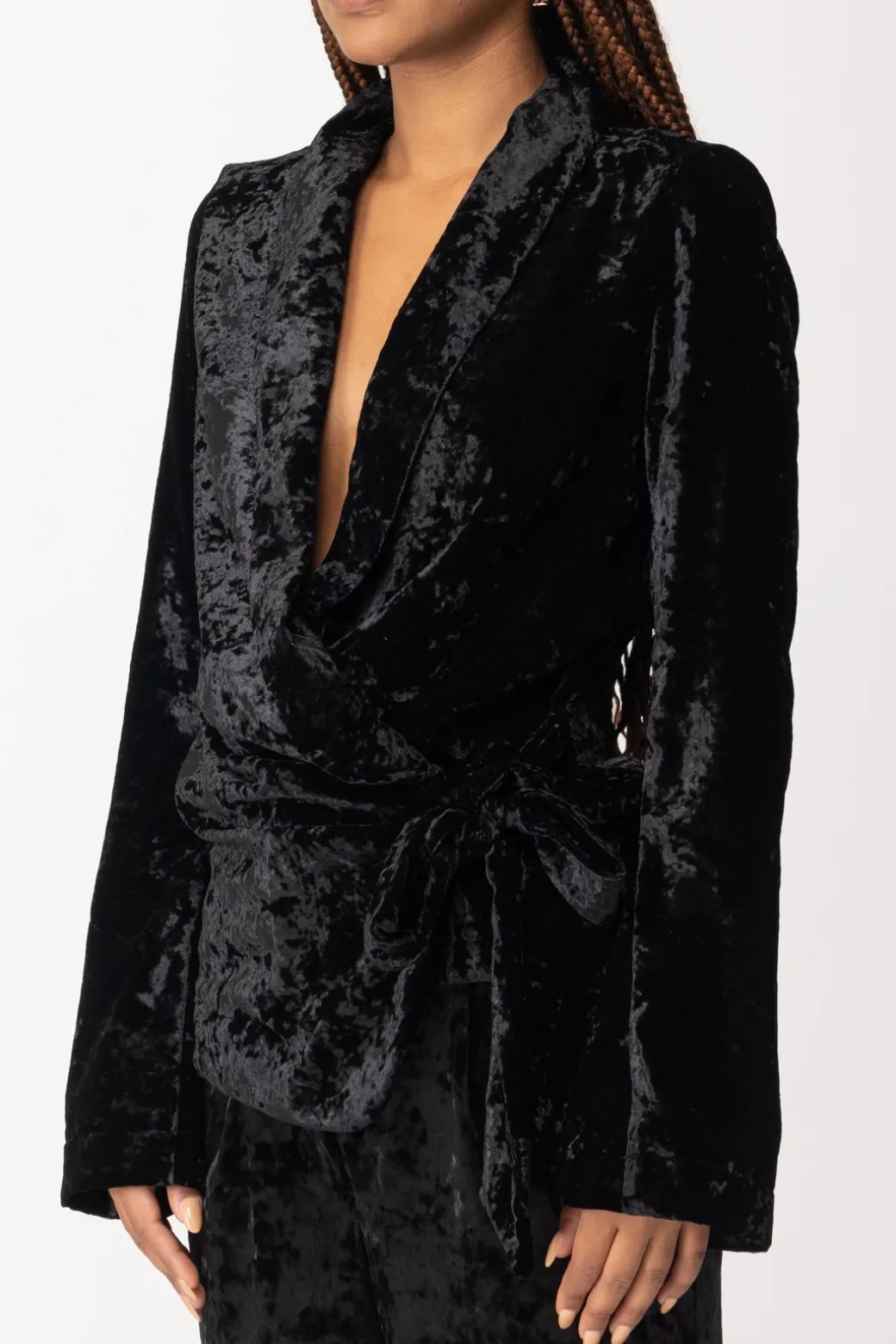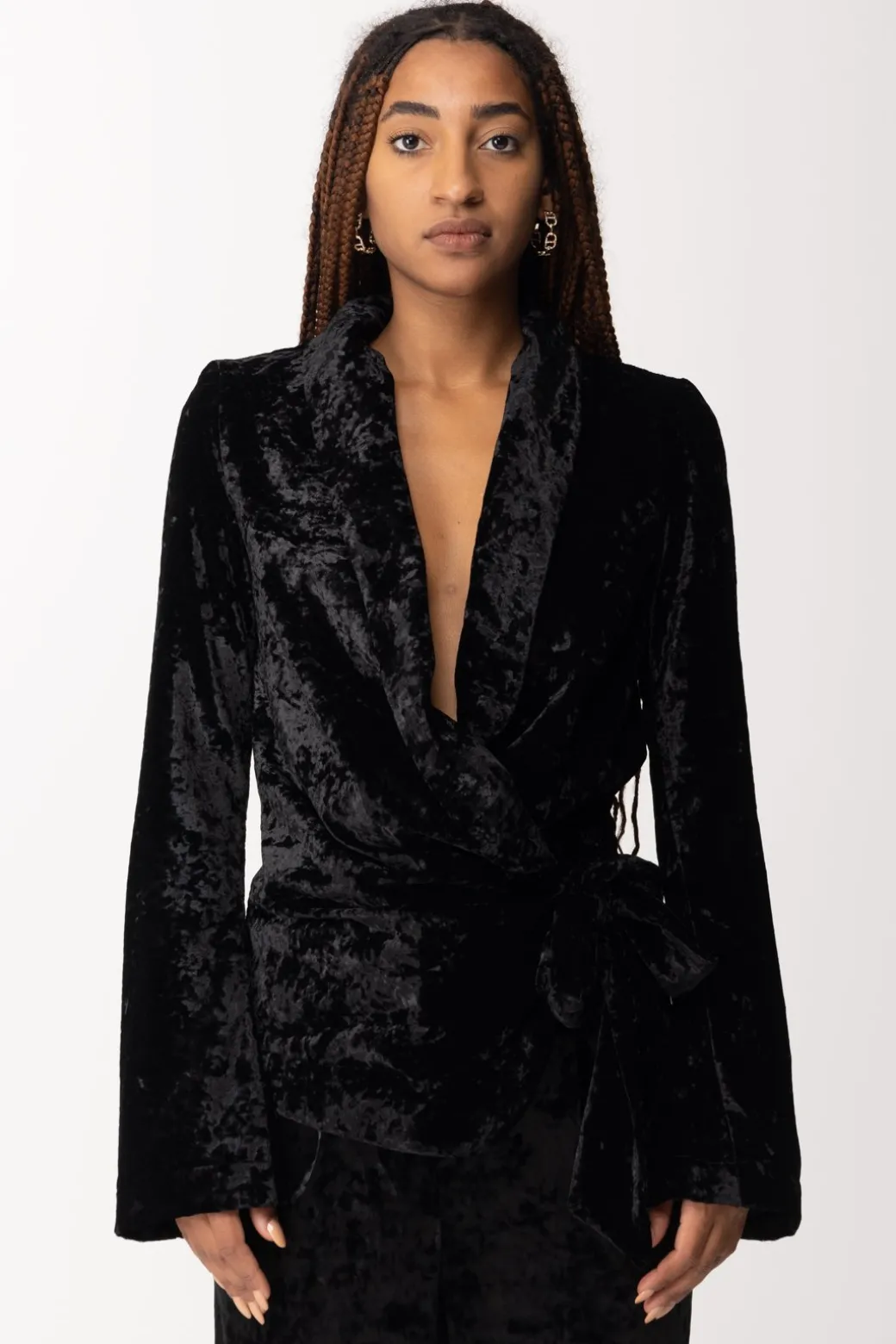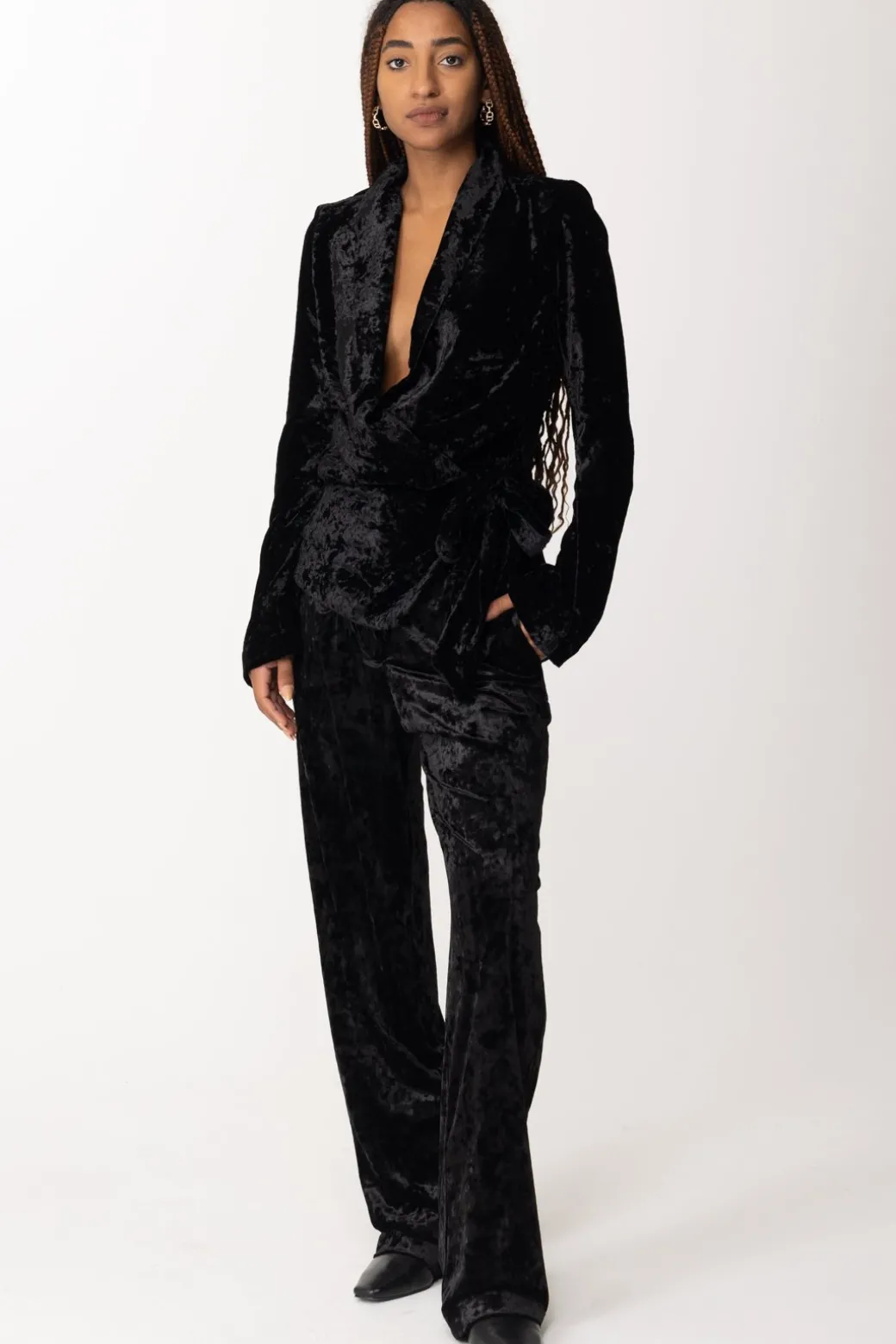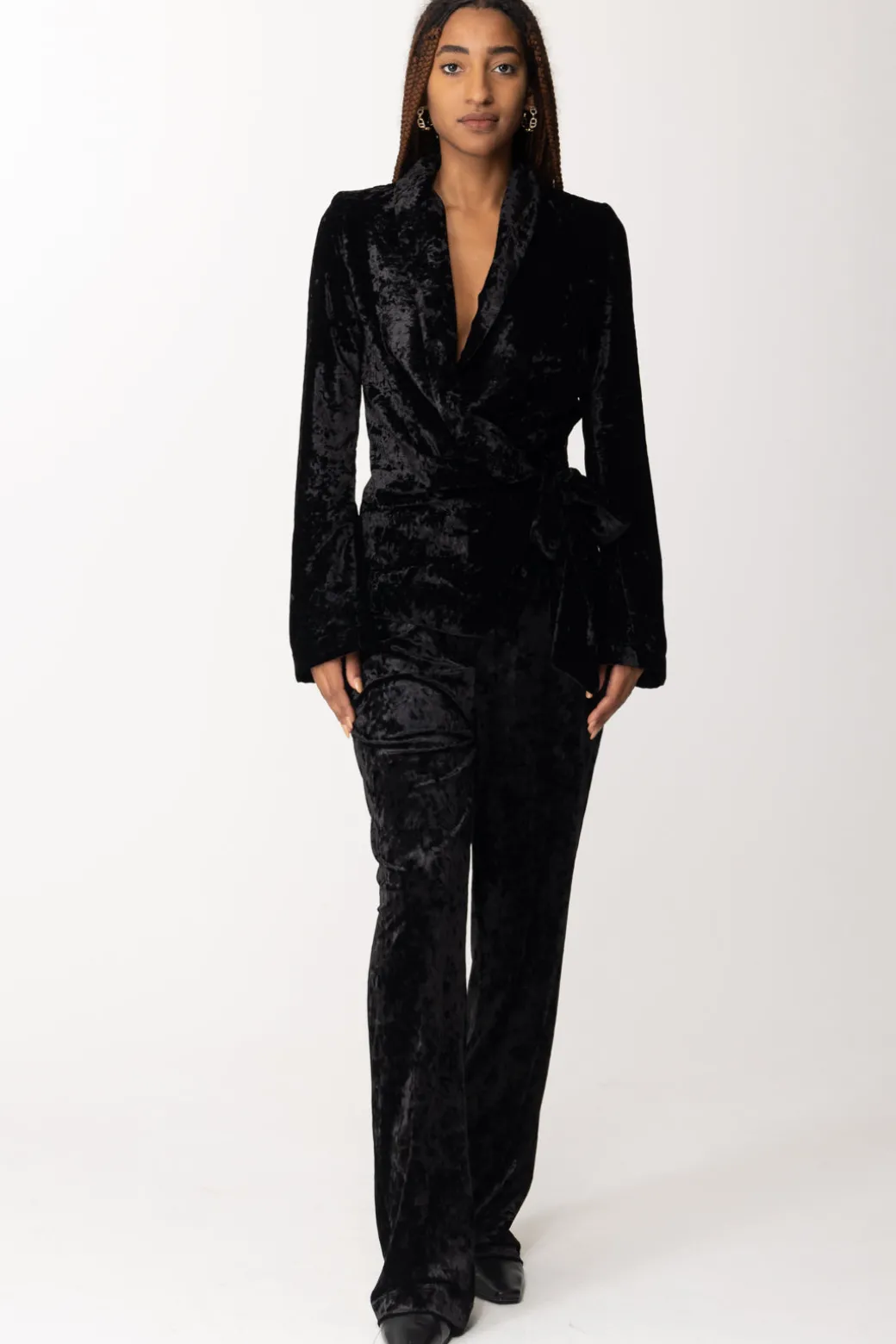 Tanto invernale quanto originale, questo blazer Aniye By in velluto martellato, che sostituisce qualsiasi tipo di abbottonatura con una chiusura avvolgente da annodare al fianco. Un effetto morbido e rilassato, che coinvolge anche l’ampia scollatura con revers, per un capo da indossare per tutta la stagione.