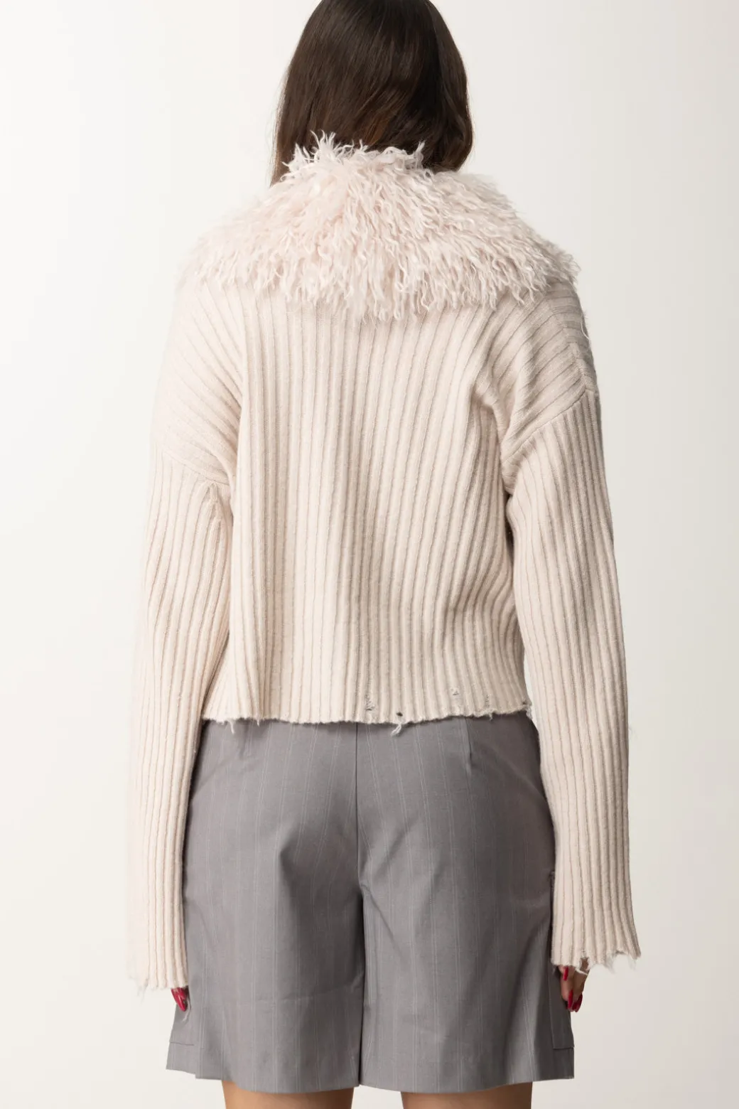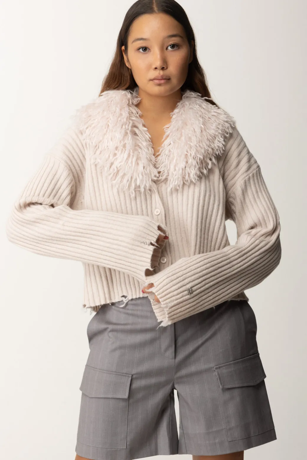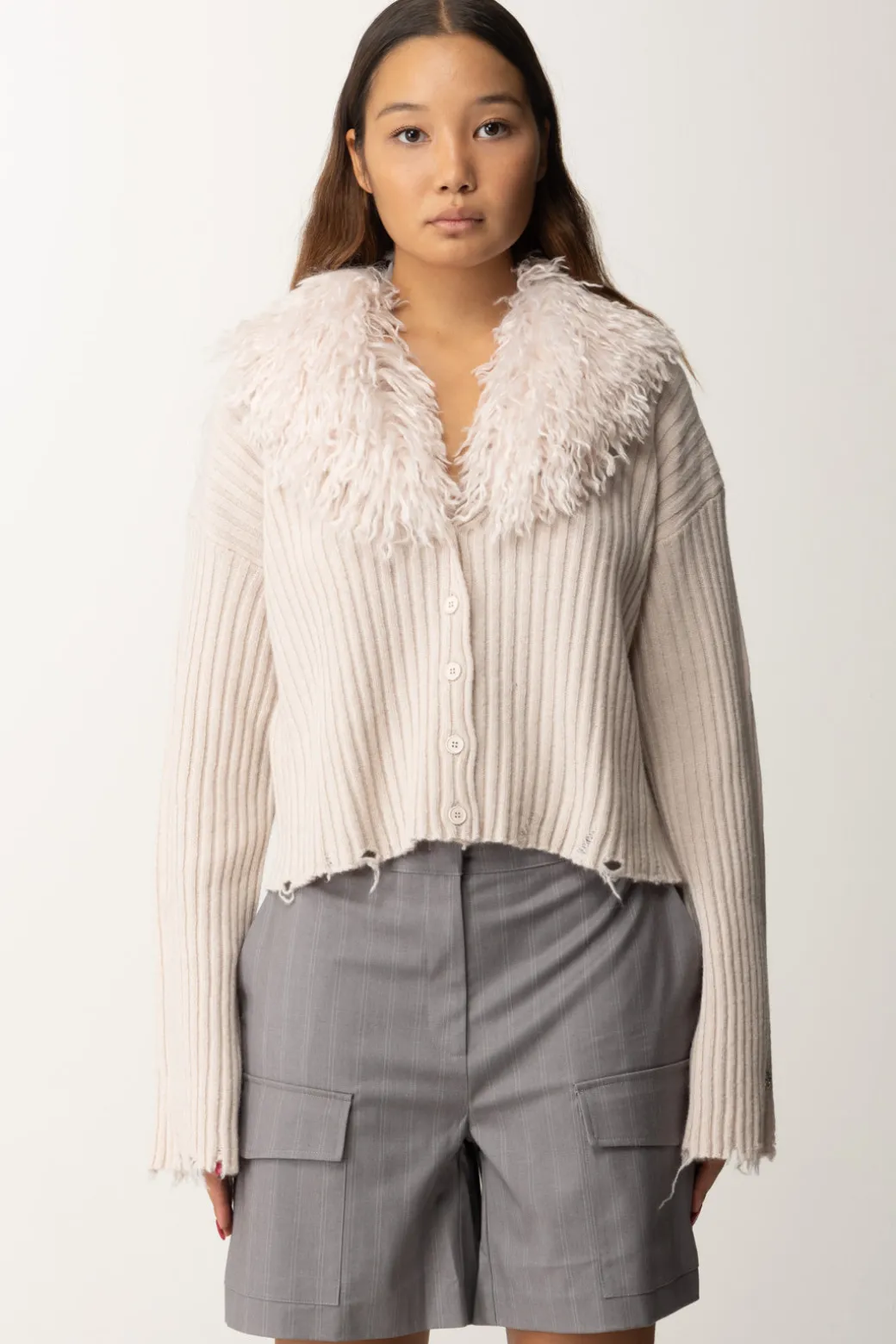 Cardigan in maglia Aniye By che mette insieme il caldo del misto lana e il glamour del maxi collo in pelliccia sintetica, che puoi rimuovere all’occorrenza per renderla più sobria e versatile. Confermano la linea del brand le rotture al fondo: quel tocco un po’ gothic che aggiunge stile e carattere al tuo look.